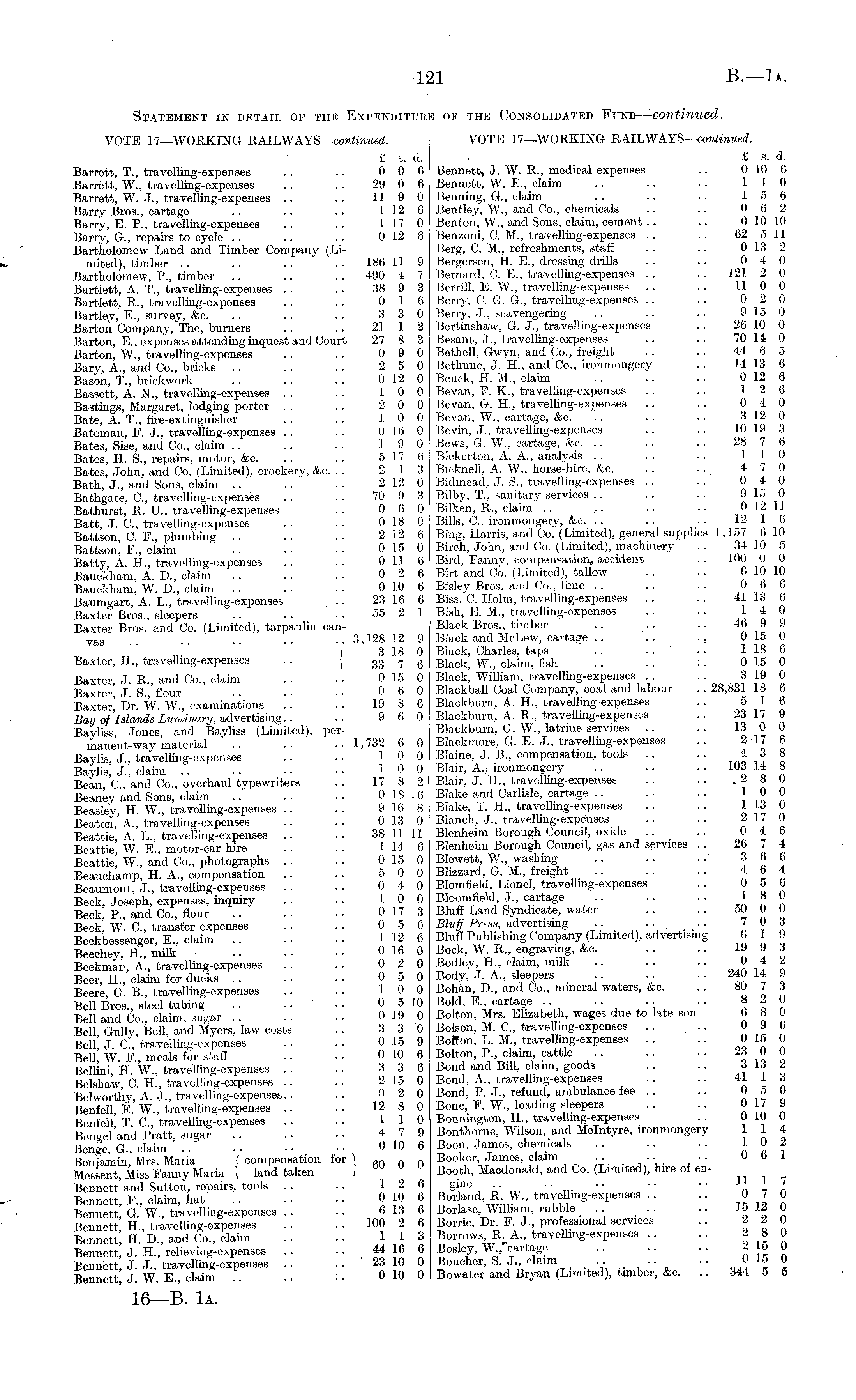 Statement in detail of the Expenditure of the Consolidated Fund — continued. VOTE 17—WORKING RAlLWAYS— continued. VOTE 17—WORKING RAlLWAYS— continued. £ s. d. £ s. d. Barrett, T., travelling-expenses .. .. 0 0 6 Bennett, J. W. R., medical expenses .. 010 6 Barrett, W., travelling-expenses .. .. 29 0 6 Bennett, W. E., claim .. .. .. 110 Barrett, W. J., travelling-expenses .. .. 11 9 0 Benning, G., claim .. .. .. 15 6 Barry Bros., cartage .. .. .. 112 6 Bentley, W., and Co., chemicals .. .. 0 6 2 Barry, E. P., travelling-expenses .. .. 117 0 Ben ton, W., and Sons, claim, cement .. .. 010 10 Barry, G., repairs to cycle .. .. .. 012 6 Benzoni, C. M., travelling-expenses .. . . 62 511 Bartholomew Land and Timber Company (Li- Berg, C. M., refreshments, staff .. .. 013 2 mited), timber .. .. .. .. 186 11 9 Bcrgersen, H. E., dressing drills .. .. 04 0 Bartholomew, P., timber .. .. .. 490 4 7 Bernard, C. E., travelling-expenses .. .. 121 2 0 Bartlett, A. T., travelling-expenses .. .. 38 9 3 Berrill, E. W., travelling-expenses .. .. 11 0 0 Bartlett, R., travelling-expenses . . .. 0 1 (i Berry, C. G. G., travelling-expenses .. .. 02 0 Bartley, E., survey, &c. .. .. 3 3 0 Berry, J., scavengering .. .. .. 9 15 0 Barton Company, The, burners .. .. 21 J 2 Bertinshaw, G. J., travelling-expenses .. 26 10 0 Barton, E., expenses attending inquest and Court 27 8 3 Besant, J., travelling-expenses .. .. 70 14 0 Barton, W., travelling-expenses . . .. 0 9 0 Bethell, Gwyn, and Co., freight .. .. 44 6 5 Bary A. and Co., bricks .. .. .. 2 5 0 Bethune, J. H., and Co., ironmongery .. 14 13 6 Bason, T., brickwork .. .. .. 012 0 Beuck, H. M., claim .. .. .. 012 6 Bassett, A. N., travelling-expenses . . .. 1 0 0 Bevan, F. X., travelling-expenses .. .. 1 2 (i Bastings, Margaret, lodging porter .. .. 2 0 0 Bevan, G. H., travelling-expenses .. .. 0 4 0 Bate, A. T., fire-extinguisher . . .. 10 0 Bevan, W., cartage, &c. .. .. .. 312 0 Bateman, F. J., travelling-expenses .. .. 016 0 Bevin, J., travelling-expenses .. .. 10 19 3 Bates, Sise, and Co., claim . . .. . . 19 0 Bevvs, G. W., cartage, &c. .. .. .. 28 7 6 Bates, H. S., repairs, motor, &c. .... 5 17 6, Bickerton, A. A., analysis . . .. .. 110 Bates, John, and Co. (Limited), crockery, &c. . . 2 13! Bicknell, A. W., horse-hire, &c. .. .. 470 Bath, J., and Sons, claim ..... . 2 12 0 Bidmead, J. S., travelling-expenses . . .. 0 4 0 Bathgate, C, travelling-expenses .. .. 70 9 3 Bilby, T., sanitary services .. .. .. 915 0 Bathurst, R. U., travelling-expenses .. 0 6 0 Bilken, R., claim .. .. .. .. 0 12 11 Batt, J. C., travelling-expenses .. .. 018 0 Bills, C, ironmongery, &c. .. .. .. 12 1 (i Battson C. F., plumbing .. .. •• 2 12 6 Bing, Harris, and Co. (Limited), general supplies 1,157 6.10 P., claim .. .. .. 015 0 Birch, John, and Co. (Limited), machinery .. 34 10 5 Batty A. H., travelling-expenses .. . . 0)16 Bird, Fanny, compensation, accident .. 100 0 0 Bauckham, A. D., claim .. .. . . 02 6 Birt and Co. (Limited), tallow .. .. 610 10 Bauckham, W. I)., claim ~ .. .. 0 10 6 Bisloy Bros, and Co., lime .. .. .. 0 6 6 Baumo-art A. L., travelling-expenses .. 23 16 6 ! Biss, C. Holm, travelling-expenses .. .. 4113 6 Baxter Bros., sleepers 55 2 1 Bish, E. M., travelling-expenses .. .. 1 4 0 Baxter Bros, and Co. (Limited), tarpaulin can- Black Bros., timber .. .. .. 4b 9 9 vas . .. .. .. 3,128 12 9 Black and McLew, cartage .. .. .. 0 15 0 (3180 Black, Charles, taps .. .. .. 118 6 Baxter, H., travelling-expenses .. - ( 33 7 6 Black, W., claim, fish .. .. .. 015 0 Baxter, J. R., and Co., claim .. .. 015 0 Black, William, travelling-expenses . . .. 319 0 Baxter J S flour . . . • ■ • 0 (i 0 Blackball Coal Company, coal and labour .. 28,831 18 6 Baxter' Dr W W., examinations .. .. 19 8 6 Blackburn, A. H., travelling-expenses .. 516 Bay of Islands Luminary, advertising.. .. 9 6 0 Blackburn, A. R., travelling-expenses .. 23 17 9 Bayliss Jones, and Bayliss (Limited), per- Blackburn, G. W., latrine services .. .. 13 0 0 manent-way material 1,732 6 0 Blaekmore, C. E. J., travelling-expenses .. 217 6 Baylis, J., travelling-expenses .. .. 10 0 Blame, J. 8., compensation, tools .. .. 4 3 8 Baylis, J., claim 10 0 Blair, A., ironmongery 103 14 8 Bean C and Co., overhaul typewriters .. 17 8 2 Blair, J. H., travelling-expenses .. .. . 2 8 0 Beaney and Sons, claim 0 18 6 Blake and Carlisle, cartage 10 0 Beasley H W., travelling-expenses .. .. 916 8 Blake, T. H., travelling-expenses .. .. 113 0 Beaton A., travelling-expenses . . .. 013 0 Blanch, J., travelling-expenses .. .. 217 0 Beattie A L travelling-expenses .. .. 38 11 11 Blenheim Borough Council, oxide .. .. 04b Beattie' W E., motor-car hire .. .. 114 6 Blenheim Borough Council, gas and services .. 26 7 4 Beattie, W., and Co., photographs . . .. 015 0 Blcwett, W., washing A b b Beauchamp, H. A., compensation .. .. 5 0 0 Blizzard, G. M., freight 4 b 4 Beaumont, J., travelling-expenses .. .. 04 0 Blomfield, Lionel, travelling-expenses .. Van Beck, Joseph, expenses, inquiry .. .. 10 0 Bloomfield, J., cartage .. .. .. 1 8 0 Beck P., and Co., flour 017 3 Bluff Land Syndicate, water .. .. 50 0 0 Beck, W. C, transfer expenses .. .. 05 6 Bluff Press advertising .. •• ..■■ IV o Beckbessenger E claim . .. .. 112 6 Bluff Publishing Company (Limited), advertising 61 9 Beechey, H , milk 0 16 0 Bock, WR., engraving, &c 19 9 3 Beekman, A., travelling-expenses .. .. 02 0 Bodley, H claim, milk 04 2 Beer, H., claim for ducks 05 0 Body, sleepers .. .. 240 14 9 Beere G. 8., travelling-expenses .. .. 10 0 Bohan, L\, and Co., mineral waters, &c. .. 80 7 3 Bell Bros., steel tubing 05 10 Bold, E cartage .. .. .. f2O Bell and Co claim sugar .. .. 019 0 Bolton, Mrs. Elizabeth, wages due to late son 6 8 0 Bell Gully, Bell, and Myers, law costs .. 3 3 0 Bolson, M. C, travelling-expenses .. .. jj 9 6 Bell' J. C, travelling-expenses . ... 015 9 Bolton, I, M travelling-expenses .. .. ° ° Bell, W. F., meals for staff .. .. 010 6 Bolton, P., c