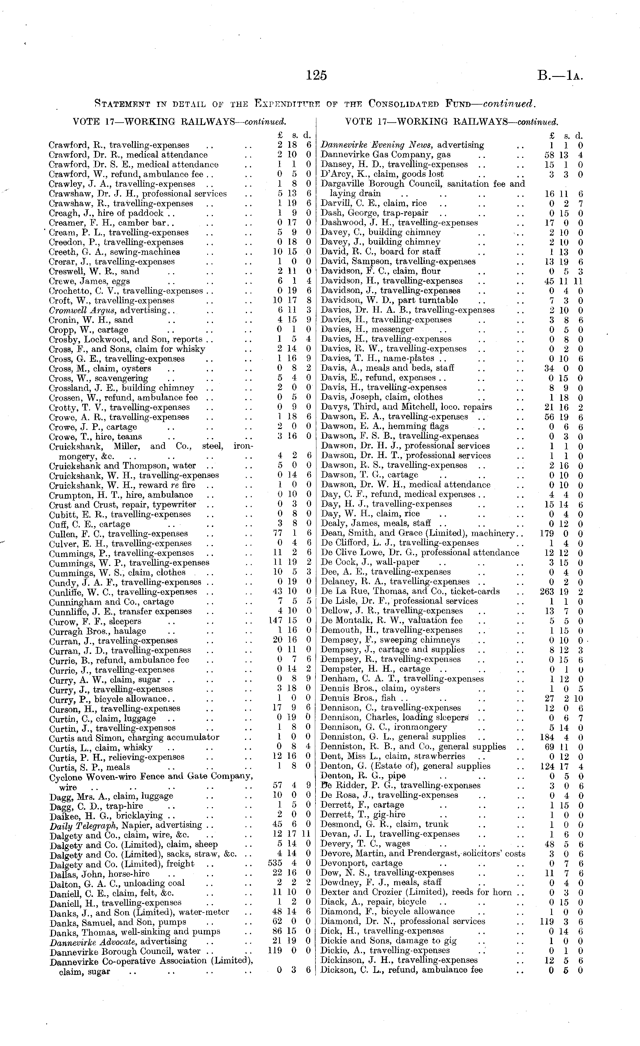 Statement in detail of the Exi'ENDirrnE of the Consolidated Fund— continued. VOTE 17—WORKING RAlLWAYS— continued. VOTE 17—WORKING RAlLWAYS— continued. £ s. d. £ s. d. Crawford, R., travelling-expenses . . .. 2 18 6 Dannevirke Evening News, advertising .. 110 Crawford, Dr. R., medical attendance .. 210 0 Dannevirke Gas Company, gas .. .. 58 13 4 Crawford, Dr. S. E., medical attendance .. 110 Dansey, H. D., travelling-expenses .. .. 15 I 0 Crawford, W., refund, ambulance fee . . .. 0 5 0 D'Arcy, X., claim, goods lost .. .. 3 3 0 Crawley, J. A., travelling-expenses . . .. 18 0 Dargaville Borough Council, sanitation fee and Crawshaw, Dr. J. H., professional services .. 5 13 6 laying drain .. .. .. .. 16 11 6 Crawshaw, R., travelling-expenses .. .. 119 6 Darvill, C. E., claim, rice .. .. .. 0 2 7 Creagh, J., hire of paddock .. . . .. 19 0 Dash, George, trap-repair .. .. .. 015 0 Creamer, F. H., camber bar. . .. .. 017 0 Dashwood, J. H., travelling-expenses .. 17 0 0 Cream, P. L., travelling-expenses .. .. 5 9 0 Davey, C, building chimney .. -.. 210 0 Creedon, P., travelling-expenses .. .. 018 0 Davey, J., building chimney .. .. 210 0 Creeth, G. A., sewing-machines .. .. 10 15 0 David, R. C, board for staff .. .. 1 13 0 Crerar, J., travelling-expenses .. . . 10 0 David, Sampson, travelling-expenses .. 13 19 6 Creswell, W. R., sand .. .. .. 2 11 0 Davidson, F. C, claim, flour .. .. 0 5 3 Crewe, James, eggs .. .. .. 6 14 Davidson, H., travelling-expenses .. .. 45 11 11 Crochetto, C. V., travelling-expenses . . .. 019 6 Davidson, J., travelling-expenses .. .. 0 4 0 Croft, W., travelling-expenses .. . . 10 17 8 Davidson, W. D., part turntable .. .. 7 3 0 Cromwell Argus, advertising.. .. .. 6 U 3 Da vies, Dr. H. A. 8., travelling-expenses .. 2 10 0 Cronin, W. H., sand .. .. .. 415 9 Davies, H., travelling-expenses .. .. 3 8 6 Cropp, W., cartage .. .. . . 0 10 Davies, H., messenger .. .. .. 0 5 0 Crosby, Lockwood, and Son, reports .. .. 15 4 Davies, H., travelling-expenses .. .. 0 8 0 Cross, F., and Sons, claim for whisky .. 214 0 Davies, R. W., travelling-expenses . . .. 0 2 0 Cross, G. E., travelling-expenses .. .. 1 16 9 Davies, T. H., name-plates .. .. .. 0 10 6 Cross, M., claim, oysters .. .. .. 0 8 2 Davis, A., meals and beds, staff .. .. 34 0 0 Cross, W., scavengering .. .. .. 5 4 0 Davis, E., refund, expenses .. .. . . 015 0 Crossland, J. E., building chimney .. .. 2 0 0 Davis, 11., travelling-expenses .. .. 8 9 0 Crossen, W., refund, ambulance fee .. .. 0 5 0 Davis, Joseph, claim, clothes .. .. 118 0 Crotty, T. V., travelling-expenses .. .. 0 9 0 Davys, Third, and Mitchell, loco, repairs .. 21 16 2 Crowe, A. R., travelling-expenses .. .. 1 18 6 Dawson, E. A., travelling-expenses .. .. 56 19 6 Crowe, J. P., cartage .. .. .. 2 0 0 Dawson, E. A., hemming flags .. .. 0 6 6 Crowe, T., hire, teams .. .. .. 316 0 Dawson, F. S. 8., travelling-expenses .. 0 3 0 Cruickshank, Miller, and Co., steel, iron- Dawson, Dr. H. J., professional services .. 110 mongerv, &c. .. .. .. .. 4 2 6 Dawson, Dr. H. T., professional services .. 110 Cruickshank and Thompson, water .. . . 5 0 0 Dawson, R. S., travelling-expenses .. .. 2 16 0 Cruickshank, W. H., travelling-expenses .. 0 14 6 Dawson, T. G., cartage .. .. .. 0 10 0 Cruickshank, W. H., reward re fire .. .. 10 0 Dawson, Dr. W. H., medical attendance .. 010 0 Crumpton, H. T., hire, ambulance .. .. 010 0 Day, C. F., refund, medical expenses .. .. 440 Crust and Crust, repair, typewriter .. .. 0 3 0 Day, H. J., travelling-expenses .. .. 15 14 6 Cubitt, E. R., travelling-expenses .. .. 0 8 0 Day, W. H., claim, rice .. .. .. 0 4 0 Cuff, C. E., cartage .. .. .. 3 8 0 Dealy, James, meals, staff .. .. .. 012 0 Cullen, F. C, travelling-expenses .. .. 77 1 6 Dean, Smith, and Grace (Limited), machinery.. 179 0 0 Culver, E. H., travelling-expenses . . . . 0 4 6 De Clifford, L. J., travelling-expenses .. 14 0 Cummings, P., travelling-expenses .. .. 11 2 6 De Clive Lowe, Dr. G., professional attendance 12 12 0 Cummings, W. P., travelling-expenses .. 11 19 2De Cock, J., wall-paper .. .. .. 315 0 Cummings, W. S., claim, clothes .. .. 10 5 3 Dee, A. E., travelling-expenses .. .. 0 4 0 Cundy, J. A. F., travelling-expenses .. .. 019 0 Delaney, R. A., travelling-expenses . . .. 0 2 0 Cunliffe, W. C, travelling-expenses .. . . 43 10 0 De La Rue, Thomas, and Co., ticket-cards .. 263 19 2 Cunningham and Co., cartage . . .. 7 5 5 De Lisle, Dr. F., professional services .. 110 Cunnliffe, J. E., transfer expenses .. .. 410 0 Dellow, J. R., travelling-expenses .. .. 13 7 0 Curow, F. F., sleepers .. .. .. 147 15 0 De Montalk, R. W., valuation fee .. 5 5 0 Curragh Bros., haulage .. .. .. 116 0 Demouth, H., travelling-expenses .. .. 115 0 Curran, J., travelling-expenses .. .. 20 16 0 Dempsey, F., sweeping chimneys .. . . 010 0 Curran, J. D., travelling-expenses .. .. 011 0 Dempsey, J., cartage and supplies .. .. 812 3 Currie, 8., refund, ambulance fee .. .. 0 7 6 Dempsey, R., travelling-expenses .. .. 015 6 Currie, J., travelling-expenses .. .. 0 14 2 Dempster, H. H., cartage .. . . .. 0 10 Curry, A. W., claim, sugar .. .. .. 0 8 9 Denham, C. A. T., travelling-expenses .. 112 0 Curry, J., travelling-expenses .. .. 318 0 Dennis Bros., claim, oysters .. .. 10 5 P., bicycle allowance.. .. .. 10 0 Dennis Bros., fish .. .. .. .. 27 2 10 Curson, H., travelling-expenses .. .. 17 9 6 Dennison, C, travelling-expenses .. .. 12 0 6 Curtin, C, claim, luggage .. .. .. 019 0 Dennison, Charles, loading sleepers .. .. 0 6 7 Curtin, J., travelling-expenses . . .. 18 0 Dennison, G. C, ironmongery .. .. 514 0 Curtis and Simon, charging accumulator .. 10 0 Demu'ston, G. L., general supplies . . .. 184 4 0 Curtis, L., claim, whisky .. .. .. 0 8 4 Denniston, R. 8., and Co., genoral supplies ..69 11 0 Curtis, P. H., relieving-expenses .. .. 12 16 0 Dent, Miss L., claim, strawberries .. .. 012 0 Curtis, S. P., meals .. .. .. 18 0 Denton, G. (Estate of), general supplies .. 124 17 4 Cyclone Woven-wire F