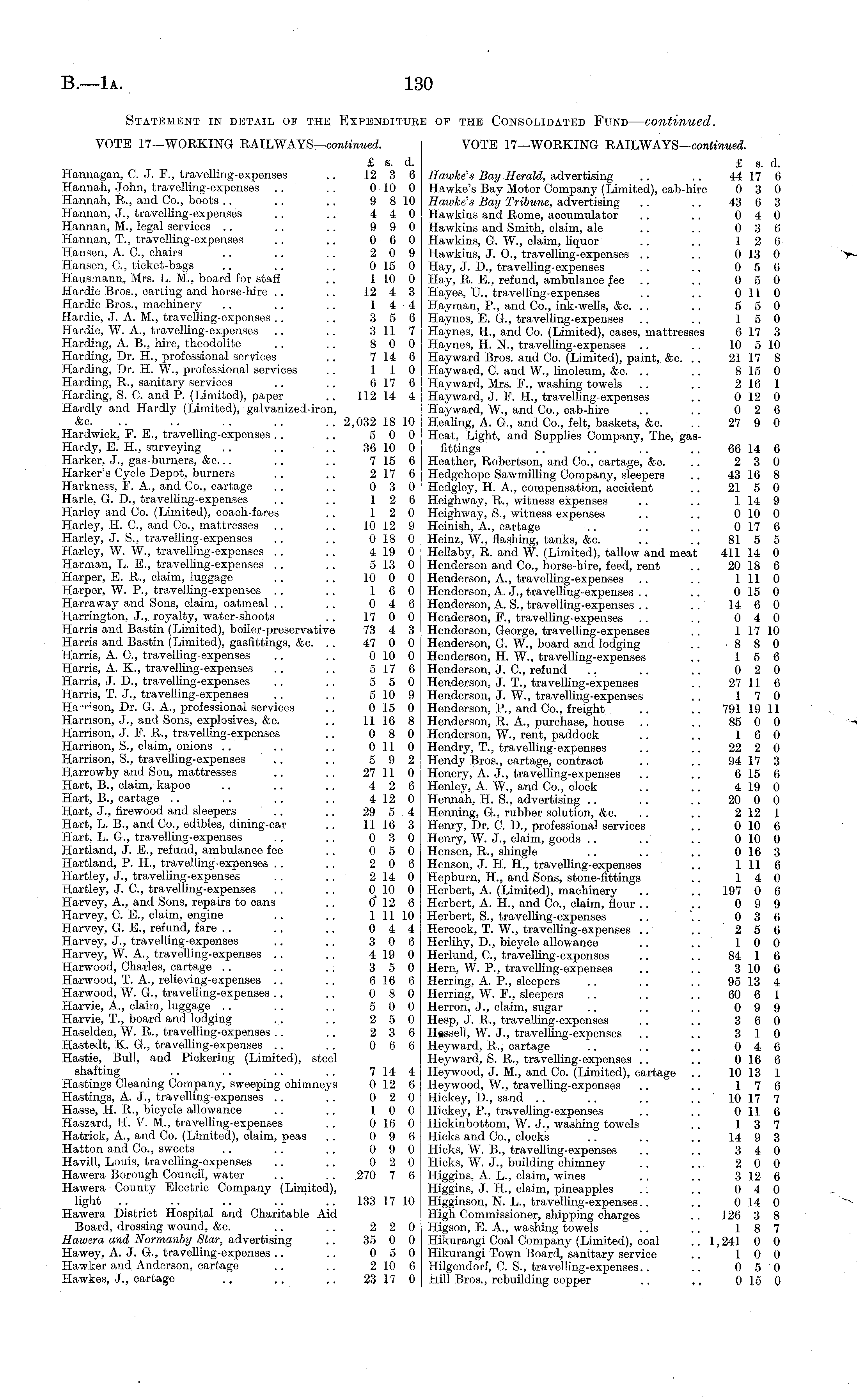 Statement in detail of the Expenditure of the Consolidated Fund — continued. VOTE 17—WORKING RAlLWAYS— continued. VOTE 17—WORKING RAlLWAYS— continued. £ s. d. £ s. d. Hannagan, G. J. F., travelling-expenses .. 12 3 6 Hawke's Bay Herald, advertising .. .. 44 17 6 Hannah, John, travelling-expenses . . .. 0 10 0 Hawke's Bay Motor Company (Limited), cab-hire 0 3 0 Hannah, R., and Co., boots . . .. .. 9 810 Hawke's Bay Tribune, advertising .. .. 43 6 3 Hannan, J., travelling-expenses .. .. 4 4 0 Hawkins and Rome, accumulator .. .. 0 4 0 Hannan, M., legal services .. .. .. 9 9 0 Hawkins and Smith, claim, ale .. .. 0 3 6 Hannan, T., travelling-expenses .. .. 0 6 0 Hawkins, G. W., claim, liquor .. 12 6 Hansen, A. 0., chairs .. .. .. 2 0 9 Hawkins, J. 0., travelling-expenses .. .. 013 0 Hansen, C, ticket-bags .. .. .. 015 0 Hay, J. IX, travelling-expenses .. .. 0 5 6 Hausinann, Mrs. L. M., board for staff .. 1 10 0 Hay, R. E., refund, ambulance fee .. .. 0 5 0 Hardie Bros., carting and horse-hire .. .. 12 4 3 Hayes, U., travelling-expenses .. 0 110 Hardie Bros., machinery .. .. .. 14 4 Hayman, P., and Co., ink-wells, &c. .. .. 5 5 0 Hardie, J. A. M., travelling-expenses .. .. 3 5 6 Haynes, E. G., travelling-expenses .. .. 15 0 Hardie, W. A., travelling-expenses .. .. 3 117 Haynes, H., and Co. (Limited), cases, mattresses 6 17 3 Harding, A. 8., hire, theodolite .. .. 8 0 0 Haynes, H. N., travelling-expenses .. .. 10 510 Harding, Dr. H., professional services .. 714 6 Hayward Bros, and Co. (Limited), paint, &c. .. 21 17 8 Harding, Dr. H. W., professional services .. 110) Hayward, C. and W., linoleum, &c. .. 815 0 Harding, R., sanitary services .. .. 617 6 j Hayward, Mrs. F., washing towels .. .. 216 1 Harding, S. C. and P. (Limited), paper .. 112 14 4 | Hayward, J. F. H., travelling-expenses 0 12 0 Hardly and Hardly (Limited), galvanized-iron, | Hayward, W., and Co., cab-hire .. .. 0 2 6 &o. .. .. .. .. .. 2,032 18 10 I Healing, A. G., and Co., felt, baskets, &c. .. 27 9 0 Hardwick, P. E., travelling-expenses .. .. 5 0 0 Heat, Light, and Supplies Company, The, gasHardy, E. H., surveying .. .. .. 36 10 0 fittings .. .. .. .. 66 14 6 Harker, J., gas-burners, &c... .. .. 715 6 Heather, Robertson, and Co., cartage, &c. .. 2 3 0 Harker's Cycle Depot, burners .. .. 217 6 | Hedgehope Sawmilling Company, sleepers .. 43 16 8 Harkness, P. A., and Co., cartage .. .. 0 3 0! Hedgley, H. A., compensation, accident .. 21 5 0 Harle, G. D., travelling-expenses .. .. 12 6 Heighway, R., witness expenses .. .. 1 14 9 Harley and Co. (Limited), coach-fares .. 12 0 Heighway, S., witness expenses .. 010 0 Harley, H. C, and Co., mattresses .. .. 10 12 9 Heinish, A., cartage .. . . .. 017 6 Harley, J. S., travelling-expenses .. .. 018 0 Heinz, W., flashing, tanks, &c. .. .. 81 5 5 Harley, W. W., travelling-expenses .. .. 419 0 Hellaby, R. and W. (Limited), tallow and meat 411 14 0 Harman, L. E., travelling-expenses .. .. 513 0 Henderson and Co., horse-hire, feed, rent .. 20 18 6 Harper, E. R., claim, luggage .. .. 10 0 0 Henderson, A., travelling-expenses .. .. 1 11 0 Harper, W. P., travelling-expenses .. .. 16 0 Henderson, A. J., travelling-expenses .. .. 0 15 0 Harraway and Sons, claim, oatmeal .. .. 0 4 6 Henderson, A. S., travelling-expenses .. .. 14 6 0 Harrington, J., royalty, water-shoots .. 17 00 j Henderson, F., travelling-expenses .. .. 04 0 Harris and Bastin (Limited), boiler-preservative 73 4 3 > Henderson, George, travelling-expenses .. 117 10 Harris and Bastin (Limited), gasfittings, &o. .. 47 0 0 Henderson, G. W., board and lodging .. -880 Harris, A. C, travelling-expenses .. .. 010 0 Henderson, H. W., travelling-expenses .. 15 6 Harris, A. X., travelling-expenses .. .. 517 6 Henderson, J. C, refund .. .. .. 0 2 0 Harris, J. D., travelling-expenses .. .. 5 5 0 Henderson, J. T., travelling-expenses .. 27 11 0 Harris, T. J., travelling-expenses .. .. 510 9 Henderson, J. W., travelling-expenses 17 0 Ha?>- ; son, Dr. G. A., professional services .. 015 0 Henderson, P., and Co., freight .. .. 791 19 11 Harrison, J., and Sons, explosives, &c. .. 11 16 8 Henderson, R. A., purchase, house .. .. 85 0 0 Harrison, J. F. R., travelling-expenses .. 0 8 0 Henderson, W., rent, paddock .. .. 16 0 Harrison, S., claim, onions .. .. .. 0 11 0 Hendry, T., travelling-expenses .. .. 22 2 0 Harrison, S., travelling-expenses ~ . . 5 9 2 Hendy Bros., cartage, contract .. 94 17 3 Harrowby and Son, mattresses .. .. 27 11 0 Henery, A. J., travelling-expenses .. .. 615 6 Hart, 8., claim, kapoc .. .. .. 4 2 6 Henley, A. W., and Co., clock .. .. 419 0 Hart, 8., cartage .. .. .. .. 412 0 Hennah, H. S., advertising .. .. .. 20 0 0 Hart, J., firewood and sleepers ' .. .. 29 5 4 Henning, G., rubber solution, &c. 2 12 1 Hart, L. 8., and Co., edibles, dining-car .. 11 16 3 Henry, Dr. C. D., professional services 010 6 Hart, L. G., travelling-expenses .. .. 0 3 0 Henry, W. J., claim, goods .. .. .. 010 0 Hartland, J. E., refund, ambulance fee .. 0 5 0 Hensen, R., shingle .. .. .. 016 3 Hartland, P. H., travelling-expenses .. .. 2 0 6 Henson, J. H. H., travelling-expenses .. 111 6 Hartley, J., travelling-expenses .. .. 214 0 Hepburn, H., and Sons, stone-fittings .. 14 0 Hartley, J. C, travelling-expenses .. .. 010 0 Herbert, A. (Limited), machinery .. .. 197 0 6 Harvey, A., and Sons, repairs to cans .. 0" 12 6 Herbert, A. H., and Co., claim, flour .. 0 9 9 Harvey, C. E., claim, engine .. .. 111 10 Herbert, S., travelling-expenses .. '.. 0 3 6 Harvey, G. E., refund, fare .. .. .. 0 4 4 Hercoek, T. W., travelling-expenses .. 2 5 6 Harvey, J., travelling-expenses .. .. 3 0 6 Herlihy, D., bicycle allowance .. .. 10 0 Harvey, W. A., travelling-expenses .. .. 419 0 Herlund, C, travelling-expenses .. .. 84 1 6 Harwood, Charles, cartage .. .. .. 3 5 0 Hern, W. P., travelling-expenses .. .. 310 6 Harwood, T. A., relieving-expenses .. .. 616 6 Herring, A. P., sleepers .. .. 95 13 4 Harwood, W. G., travelling-expenses .. .. 0 8 0 Herring, W. F., 