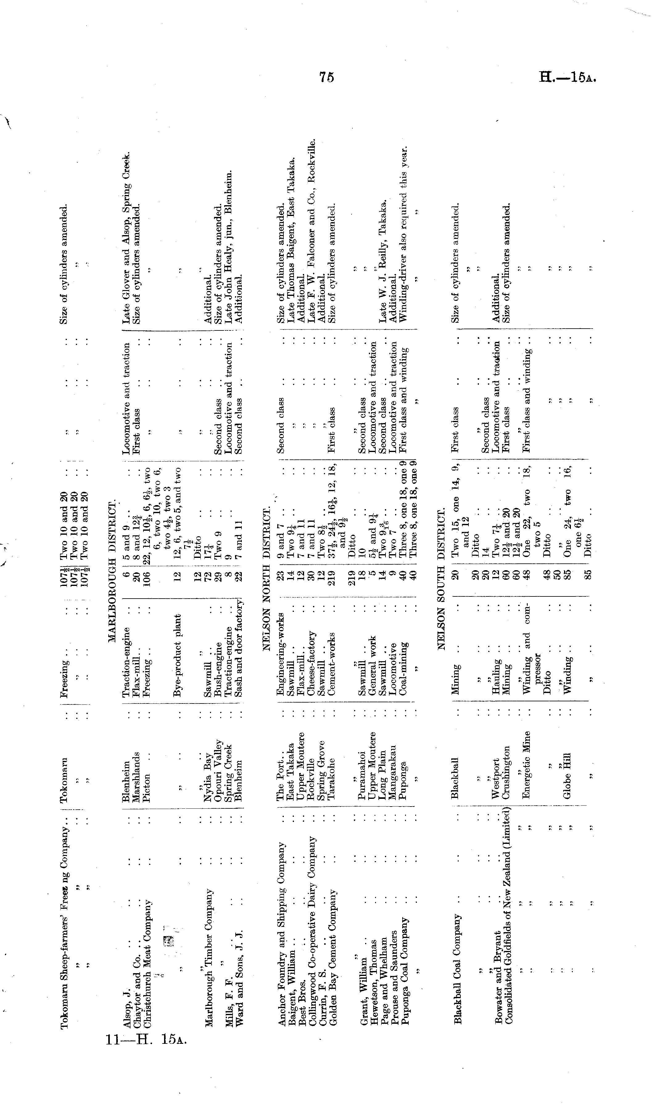 Tokomaru Sheep-farmers' Freez ng Company.. Tokomaru ,, J, ■ - 4, :: j Freezing .. .. 107J Two 10 and 20 . . .. 107J Two 10 and 20 .. .. I 107| Two 10 and 20 .. Size of cyUnders amended. Alsop, J. .. .. .. . . Blenheim Chaytor and Co. .. .. .. .. Marshlands Christchurch Meat Company .. .. Picton MARLBOROUGH DISTRICT. Late Glover and Alsop, Spring Creek. Size of cylinders amended. Traction-engine . . 6 5 and 9 .. . . Locomotive and. traction Flax-mUl. . .. 20 8 and 12} .. [ First class Freezing . . .. 106 22, 12, 10!, 6, 6|, two j 6, two 10, two 6, two 4J, two 3 Bye-product want 12 \ 12, 6, two 5, and two j , 12 j Ditto SawmiU .. .. 72 17} Bush-engine . . 29 Two 9 .. .. Second class Traction-engine . . 8 9 . . .. Locomotive and traction Sash and door factory 22 7 and 11 .. Second class Marlborough Timber Company .. .. Nydia Bay ,, .... Opouri VaUey MiUs, F. F. .. .. .. Spring Creek Ward and Sons, J. J. .. .. .. Blenheim Additional. Size of cylinders amended. Late John Healy, jun., Blenheim. Additional. Anchor Foundry and Shipping Company .. The Port.. Baigent, WUUam .'. .. .. . . East Takaka Best Bros. .. . . . . ■ • Upper Moutere Collingwood Co-operative Dairy Company . . Rockville Currin, F. S. .. .. ■ . • ■ Spring Grove Golden Bay Cement Company . . . . Tarakohe NELSON NORTH DISTRICT. Size of cylinders amended. Late Thomas Baigent, East Takaka. Additional. Late F. W. Falconer and Co., RockviUi Additional. Size of cylinders amended. Grant, WUUam .. .. .. . . Puramahoi Hewetson, Thomas .. .. . . Upper Moutere Page and Whelham .. .. . . Long Plain Prouse and Saunders .. . . Mangarakau Puponga Coal Company . . .. . . Puponga Engineering-works 23 9 and 7 .. .. I Second class SawmiU .. .. 14 Two 9} .. Flax-miU.. .. 12 7 and 11 Cheese-factory .. 30 7 and 11 SawmiU .. * .. 12 Two 8J .. Cement-works .. 219 37|, 24L 16}, 12, 18, First class and 9J 219 Ditto Sawmill .. .. 18 10 .. . . Second class General work .. 5 5J and 9} .. Locomotive and traction SawmUl .. .. 14 Two 9 r 3 g .. .. Second class Locomotive .. 9 Two 7 .. .. Locomotive and traction Coal-mining .. 40 Three 8, one 18, one 9 First class and winding 40 Three 8, one 18, one 9 Late W. J. "ReiUy, Takaka. Additional. Winding-driver also required this year. _, i NELSON SOUTH DISTRICT. Size of cylinders amended. BlackbaU Coal Company .. .. BlackbaU Mining . . .. 20 Two 15, one 14, 9, First class and 12 20 Ditto ,, .. . . 20 14 .. . . Second class HauUng . . . . 12 Two 7} . . . . Locomotive and traction Mining . . . . 60 12! and 20 . . First class 60 12! and 20 Winding and com- 48 One 22, two 18, First class and winding .. pressor two 5 Ditto .. .. 48 Ditto 50 Winding .. .. 85 One 24, two 16, „ one 6! „ .. .. 85 Ditto .. .. „ " Bowater and Bryant . . .. -. Westport ConsoUdated Goldfields of New Zealand (Limited) Crushington „ „ Energetic Mine Additional. Size of cylinders amended. " " "„ ] Globe HU1 •> >- »