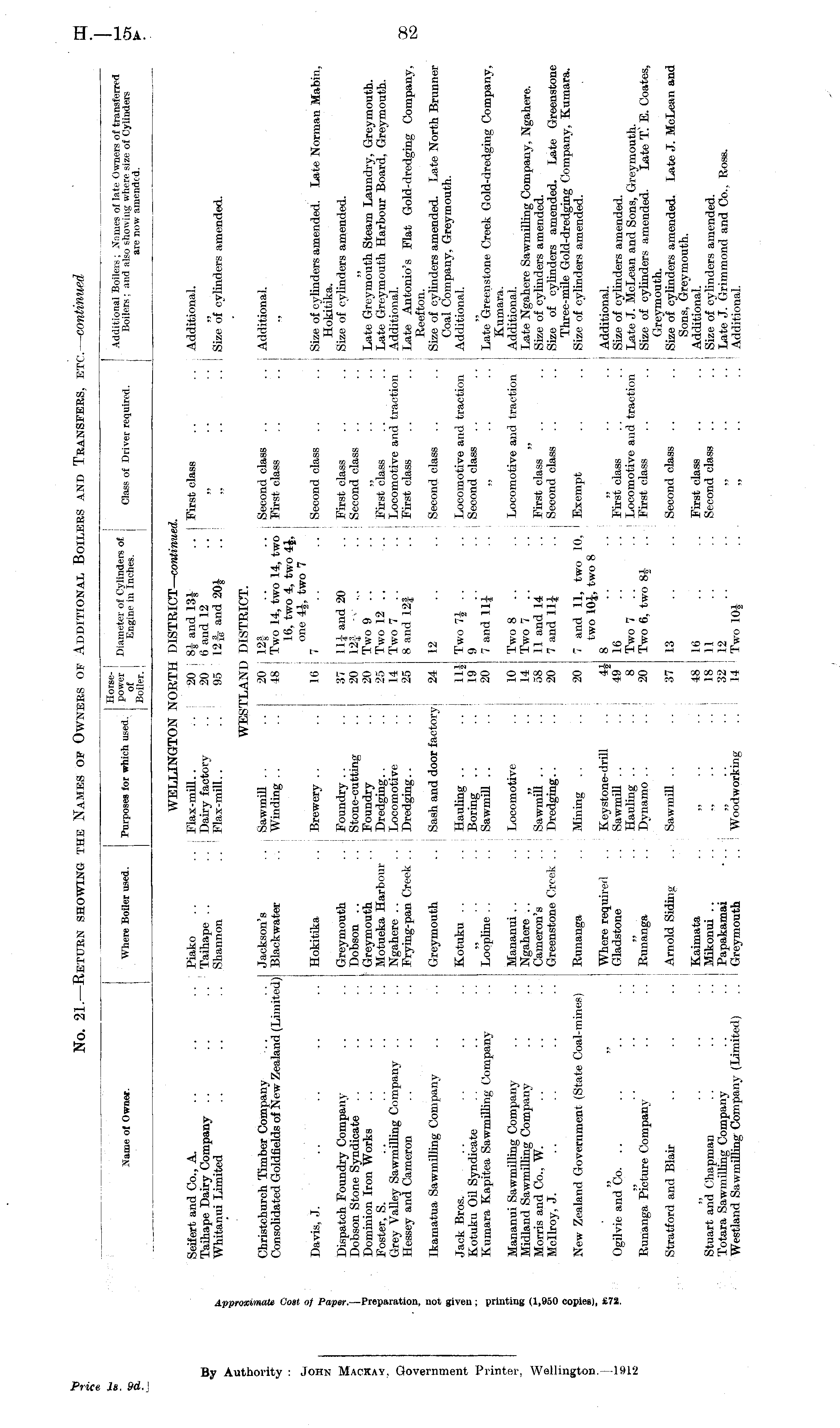Name of Owner. Where Boiler used. HorsePnrnnmn fm- which used Power Diameter of Cylinders of .Purposes tor which used. Qf Engine in Inches. Boiler. Class of Driver required. ; Additional Boilers ; Nnmes of late Owners of transferred j Boilers ; and also showing where size of Cylinders are now amended. WELLINGTON NORTH DISTRICT— continued. Seifert and Co., A. .. .. Taihape Dairy Company .. .. Whitanui Limited Piako .. . . Flax-mUl.. ,. | 20 i Taihape . . .. Dairy factory .. ] 20 Shannon . . Flax-miU.. .. 95 8J and 13J .. I First class .. .. Additional. 6 and 12 .. I „ .. .. j 12 fg and 20J .. ! „ .. .. ! Size of cylinders amended. WESTLAND DISTRICT. Christchurch Timber Company Consolidated Goldfields of New Zealand (Limited) Jackson's .. j SawmUl .. .. 20 Blackwater .. Winding .. .. 48 12| .. .. i Second class . . .. I Additional. Two 14, two 14, two j First class .. .. I „ 16, two 4, two 4J, ! one 4!, two 7 I Davis, J. ! Hokitika .. j Brewery .. . . 16 i 7 .. ..I Second class .. ..I Size of cylinders amended. Late Norman Mabin, Hokitika. 11} and 20 ... First class .. .. Size of cyUnders amended. 12} - . . . . Second class .. .. ,, Two 9 .. .. „ .. .. Late Greymouth Steam Laundry, Greymouth. Two 12 .. .. First class .. ... Late Greymouth Harbour Board, Greymouth. Two 7 .. .. ; Locomotive and traction I Additional. 8 and 12} . . First class .. .. Late Antonio's Flat Gold-dredging Company, Reefton. 12 .. .'. Second class .. .. Size of cylinders amended. Late North Brunner Coal Company, Greymouth. Two 7! .. .. Locomotive and traction Additional. 9 .. .. Second class . . .. „ 7 and 11} . . „ .. .. Late Greenstone Creek Gold-dredging Company, Kumara. Two 8 .. .. i Locomotive and traction Additional. Two 7 .. . . „ Late Ngahere SawmUUng Company, Ngahere. 11 and 14 . . First class .. .. Size of cylinders amended. 7 and 11} . . i Second class .. .. Size of cylinders amended. Late Greenstone Three-mUe Gold-dredging Company, Kumara. 7 and 11, two 10, ' Exempt . . .. I Size of cylinders amended, two 10}, two 8 Dispatch Foundry Company Dobson Stone Syndicate Dominion Iron Works Foster, S. Grey VaUey SawmiUing Company Hessey and Cameron Greymouth .. | Foundry .. .. 37 Dobson .. .. Stone-cutting .. 20 Greymouth .. j Foundry .. 20 Motueka Harbour | Dredging.. .. 25 Ngahere .. . . Locomotive . . 14 Frying-pan Creek . . j Dredging.. . . 25 Ikamatua SawmUling Company Greymouth .. j Sash and door factory. 24 I Jack Bros. Kotuku OU Syndicate Kumara Kapitea SawmiUing Company Kotuku . . Hauling .. .. 11! „ .. . . Boring .. .. 19 Loopline . . .. SawmUl .. . . 20 Mananui SawmUUng Company Midland SawmUUng Company Morris and Co., W. Mcllroy, J. Mananui . . .. | Locomotive .. 10 Ngahere .. .. j „ .. 14 Cameron's . . I SawmiU .. . . 58 Greenstone Creek .. '> Dredging. . .. 20 New Zealand Government (State Coal-mines) Runanga .. Mining .. 20 Ogilvie and Co. .. .. . . Where required .. Keystone-drill . . 4! Gladstone . . SawmiU .. . . 49 „ . . Hauling .. . . 8 Runanga . . Dynamo . . . . 20 8 .. . . „ .. .. ! Additional. 16 .. . . First class .. .. i Size of cylinders amended. Two 7 .. .. I Locomotive and traction Late J. McLean and Sons, Greymouth. Two 6, two 8! .. First class .. .. Size of cylinders amended. Late T." E. Coates, Greymouth. 13 .. . . Second class .. .. j Size of cyUnders amended. Late J. McLean and Sons, Greymouth. 16 .. First class .. .. I Additional. 11 .. . . Second class .. . . Size of cylinders amended. 12 .. .. „ .. .. | Late J. Grimmond and Co.. RossTwo 10! • • ,. - - • • Additional. Runanga Picture Company .. .. j Stratford and Blair .. .. Arnold Siding . . SawmiU . . 37 Stuart and Chapman Totara Sawmilling Company Westland Sawmilling Company (Limited) Kaimata .. „ . . .. 48 Mikonui .. „ .. 18 Papakamai " • • "' » • ■ • Greymouth .. I Woodworking .. ' 14