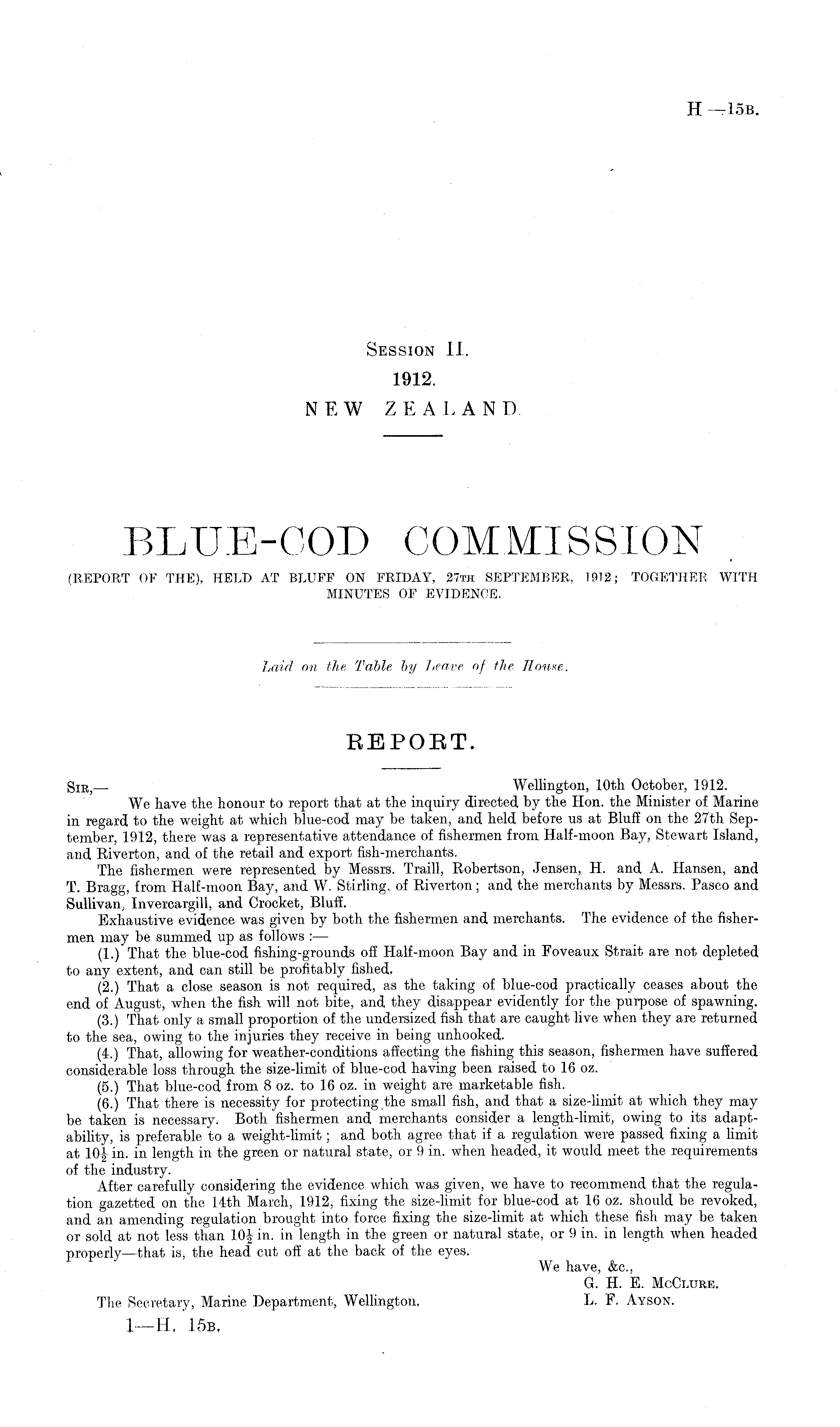 BLUE-COD COMMISSION (REPORT OF THE), HELD AT BLUFF ON FRIDAY, 27th SEPTEMBER, 1912; TOGETHER WITH MINUTES OF EVIDENCE.