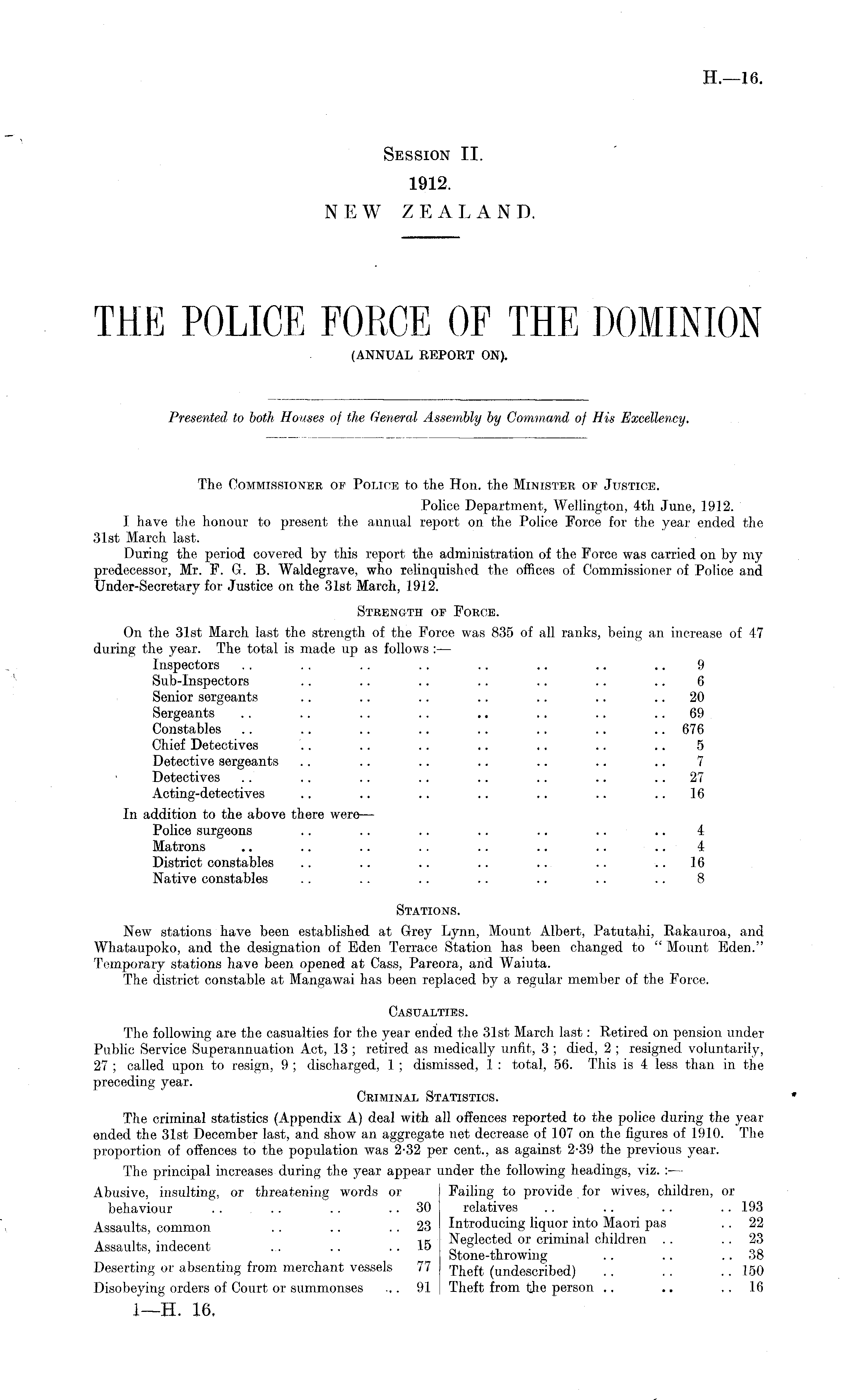 The Commissioner op Police to the Hon. the Minister op Justice. Police Department, Wellington, 4th June, 1912. I have the honour to present the annual report on the Police Force for the year ended the 31st March last. During the period covered by this report the administration of the Force was carried on by my predecessor, Mr. F. G. B. Waldegrave, who relinquished the offices of Commissioner of Police and Under-Secretary for Justice on the 31st March, 1912. Strength op Force. On the 31st March last the strength of the Force was 835 of all ranks, being an increase of 47 during the year. The total is made up as follows : — Inspectors .. .. .. .. .. .. .. .. 9 Sub-Inspectors .. .. .. .. .. .. .. 6 Senior sergeants .. .. .. .. .. .. 20 Sergeants .. .. .. .. .. .. .. 69 Constables .. .. .. .. .. .. .. .. 676 Chief Detectives .. .. .. .. .. .. .. 5 Detective sergeants .. .. .. .. .. .. .. 7 Detectives .. .. .. .. .. .. .. 27 Acting-detectives .. .. .. .. .. .. 16 In addition to the above there were — Police surgeons .. .. .. .. .. .. .. 4 Matrons .. .. .. .. .. .. .. .. 4 District constables .. .. .. .. .. .. 16 Native constables . . .. .. .. .. .. .. 8 Stations. New stations have been established at Grey Lynn, Mount Albert, Patutahi, Rakauroa, and Whataupoko, and the designation of Eden Terrace Station has been changed to " Mount Eden." Temporary stations have been opened at Cass, Pareora, and Waiuta. The district constable at Mangawai has been replaced by a regular member of the Force. Casualties. The following are the casualties for the year ended the 31st March last: Retired on pension under Public Service Superannuation Act, 13 ; retired as medically unfit, 3 ; died, 2 ; resigned voluntarily, 27 ; called upon to resign, 9 ; discharged, 1 ; dismissed, I : total, 56. This is 4 less than in the preceding year. Criminal Statistics. The criminal statistics (Appendix A) deal with all offences reported to the police during the year ended the 31st December last, and show an aggregate net decrease of 107 on the figures of 1910. The proportion of offences to the population was 2-32 per cent., as against 2-39 the previous year. The principal increases during the year appear under the following headings, viz. : — Abusive, insulting, or threatening words or Failing to provide for wives, children, or behaviour .. .. . . .. 30 relatives .. .. .. .. 193 Assaults, common .. .. . . 23 Introducing liquor into Maori pas . . 22 . ~ j . ito Neglected or criminal children . . 23 Assaults, indecent ... .. io „ 8 , . . Stone-throwing .. .. .. 38 Deserting or absenting from merchant vessels 77 xheft (undescribed) .. .. 150 Disobeying orders of Court or summonses ... 91 Theft from the person .. .. 16