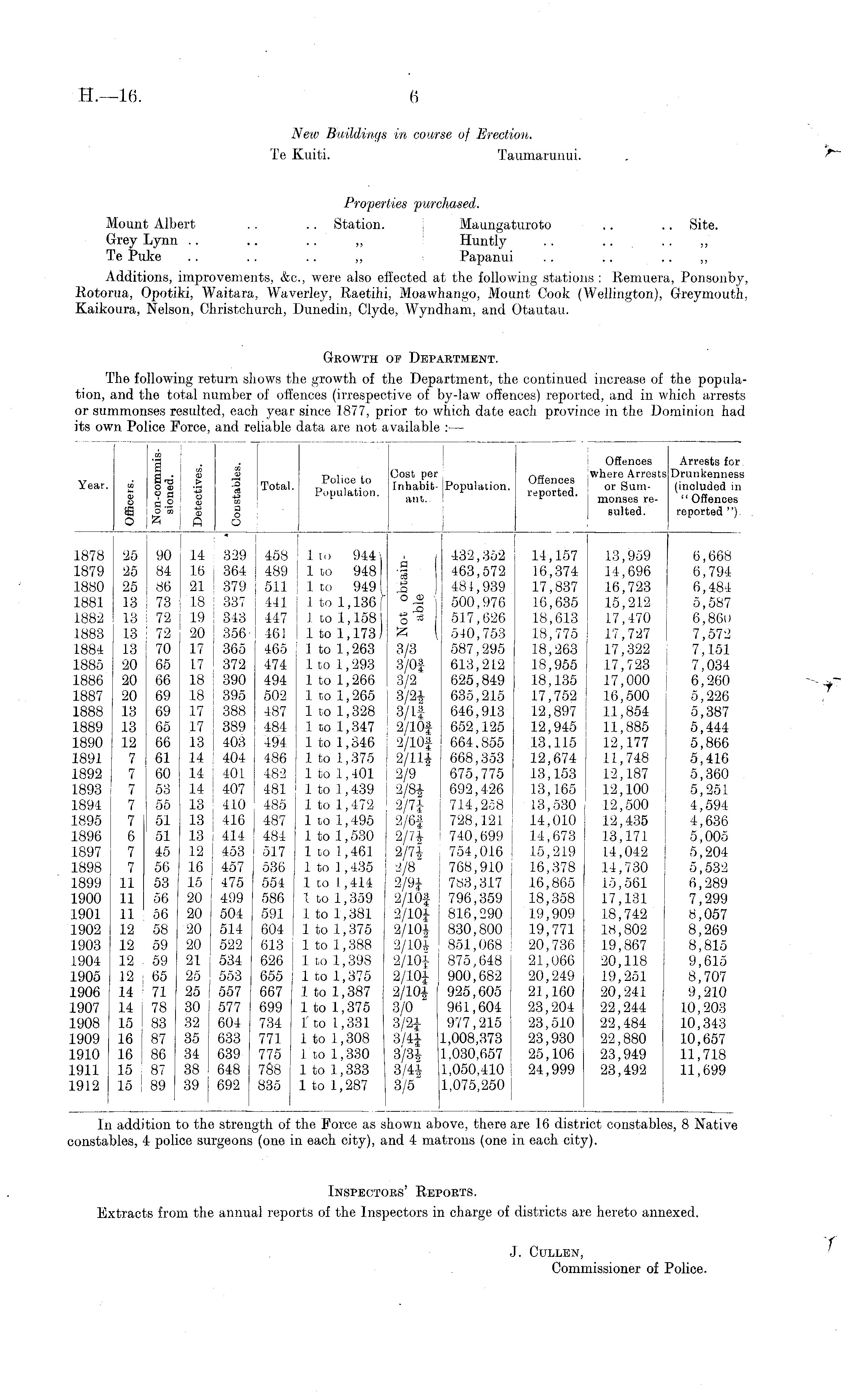 In addition to the strength of the Force as shown above, there are 16 district constables, 8 Native constables, 4 police surgeons (one in each city), and 4 matrons (one in each city). Inspectors' Reports. Extracts from the annual reports of the Inspectors in charge of districts are hereto annexed. J. Citllen, Commissioner of Police.