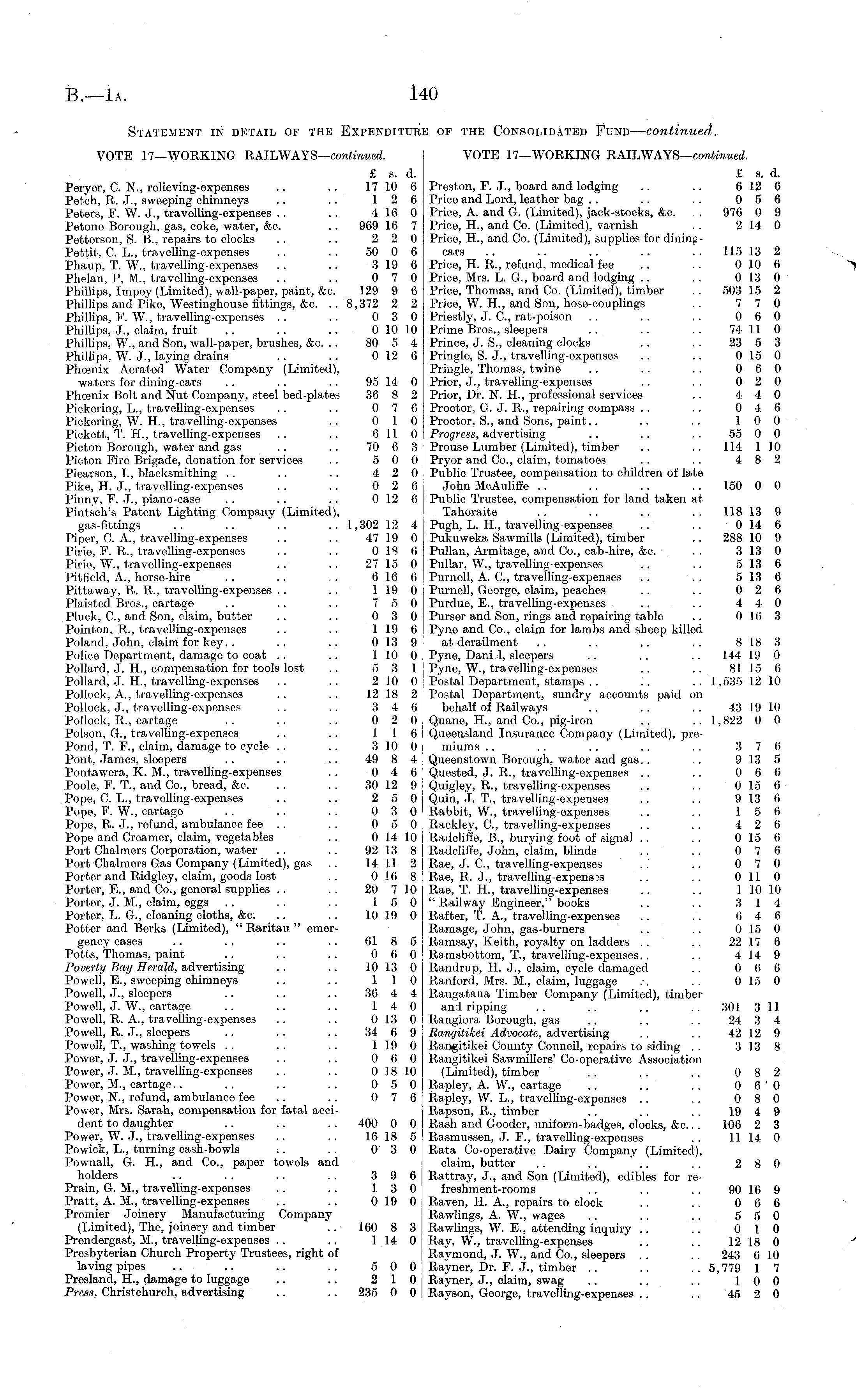 Statement in detail of the Expenditure of the Consolidated Fund— continued. VOTE 17—WORKING RAlLWAYS— continued. VOTE 17—WORKING RAlLWAYS— continued. £ s. d. £ s. d. Peryer, C. N., relieving-expenses .. .. 17 10 6 Preston, F. J., board and lodging .. .. 612 6 Petch, R. J., sweeping chimneys .. .. 12 6 Price and Lord, leather bag .. .. .. 0 5 6 Peters, F. W. J., travelling-expenses .. .. 4 16 0 Price, A. and G. (Limited), jack-stocks, &c. , 976 0 9 Petone Borough, gas, coke, water, &c. .. 969 16 7 Price, H., and Co. (Limited), varnish . . 214 0 Pettorson, S. 8., repairs to clocks .. .. 2 2 0 Price, H., and Co. (Limited), supplies for dining - Pettit, C. L., travelling-expenses . . .. 50 0 6 cars .. .. .. .. . , 115 13 2 Phaup, T. W., travelling-expenses . . .. 319 6 Price, H. R., refund, medical fee .. .. 010 6 Pholan, P, M., travelling-expenses .. .. 0 7 0 Price, Mrs. L. G., board and lodging .. .. 013 0 Phillips, Impey (Limited), wall-paper, paint, &c. 129 9 6 Price, Thomas, and Co. (Limited), timber .. 503 15 2 Phillips and Pike, Westinghouso fittings, &c. .. 8,372 2 2 Price, W. H., and Son, hose-couplings .. 7 7 0 Phillips, F. W., travelling-expenses .. .. 0 3 0 Priestly, J. C, rat-poison .. . . .. 0 6 0 Phillips, J., claim, fruit .. .. .. 0 10 10 Prime Bros., sleepers .. .. .. 74 11 0 Phillips, W., and Son, wall-paper, brushes, &c. .. 80 5 4 Prince, J. S., cleaning clocks .. . . 23 5 3 Phillips, W. J., laying drains .. .. 012 6 Pringle, S. J., travelling-expenses .. .. 015 0 Phoenix Aerated Water Company (Limited), Pringle, Thomas, twine .. .. .. 0 6 0 waters for dining-cars .. .. .. 95 14 0 Prior, J., travelling-expenses .. .. 0 2 0 Phoenix Bolt and Nut Company, steel bed-plates 36 8 2 Prior, Dr. N. H., professional services .. 4 4 0 Pickering, L., travelling-expenses .. .. 0 7 6 Proctor, G. J. R., repairing compass . . .. 0 4 6 Pickering, W. H., travelling-expenses .. 0 10 Proctor, S., and Sons, paint.. .. .. 10 0 Pickett, T. H., travelling-expenses .. .. 611 0 Progress, advertising .. .. .. 55 0 0 Picton Borough, water and gas .. .. 70 6 3 Prouso Lumber (Limited), timber .. .. 114 110 Picton Fire Brigade, donation for services . . 5 0 0 Pryor and Co., claim, tomatoes .. .. 4 8 2 Piearson, 1., blacksmithing .. .. .. 4 2 0 Public Trustee, compensation to children of late Pike, H. J., travelling-expenses .. .. 0 2 6 John McAulifle .. .. . . 150 0 0 Pinny, F. J., piano-case .. .. .. 012 6 Public Trustee, compensation for land taken at Pintsch's Patent Lighting Company (Limited), Tahoraite .. .. .. .. 118 13 9 gas-fittings .. .. .. .. 1,302 12 4 Pugh, L. H., travelling-expenses .. .. 0 14 6 Piper, C. A., travelling-expenses . . . . 47 19 0 Pukuweka Sawmills (Limited), timber .. 288 10 9 Pirio, F. R., travelling-expenses .. .. OIS 6 Pullan, Armitage, and Co., cab-hire, &c. . . 313 0 Pirie, W., travelling-expenses .. .. 27 15 0 Pullar, W., travelling-expenses .. .. 513 6 Pit field, A., horse-hire . . .. .. 616 6 Purnell, A. C, travelling-expenses .. .. 513 6 Pittaway, R. R., travelling-expenses .. .. 119 0 Purnell, George, claim, peaches .. .. 0 2 6 Plaisted Bros., cartage .. .. .. 7 5 0 Purdue, E., travelling-expenses .. .. 4 4 0 Pluck, C, and Son, claim, butter .. . . 0 3 0 Purser and Son, rings and repairing table .. OHi 3 Pointon. R., travelling-expenses .. .. 119 6 Pyne and Co., claim for lambs and sheep killed Poland, John, claim for key. . .. .. 013 9 at derailment .. .. .. .. 818 3 Police Department, damage to coat .. .. 1 10 0 Pyne, Dani 1, sleepers .. .. .. 144 19 0 Pollard, J. H., compensation for tools lost . . 5 3 1 Pyne, W., travelling-expenses . . .. 81 15 6 Pollard, J. H., travelling-expenses .. .. 210 0 Postal Department, stamps .. .. .. 1,535 12 10 Pollock, A., travelling-expenses .. . . 12 18 2 Postal Department, sundry accounts paid on Pollock, J., travelling-expenses .. .. 3 4 6 behalf of Railways .. . . .. 43 19 10 Pollock, R., cartage .. .. .. 0 2 0 Quane, H., and Co., pig-iron .. .. 1,822 0 0 Poison, G., travelling-expenses .. .. 116 Queensland Insurance Company (Limited), prePond, T. F., claim, damage to cycle .. .. 310 0 miums .. .. .. .. . . 3 7 6 Pont, James, sleepers .. .. .. 49 8 4 Queenstown Borough, water and gas. . .. 913 5 Pontawera, K. M., travelling-expenses . . 04 6 | Quested, J. R., travelling-expenses .. .. 06 6 Poole, F. T., and Co., bread, &c. .. . . 30 12 9 j Quigley, R., travelling-expenses .. . . 0 15 6 Pope, C. L., travelling-expenses .. .. 2 5 0 Quin, J. T., travelling-expenses ... .. 913 6 Pope, F. W., cartage .. .. .. 0 3 0 Rabbit, W., travelling-expenses .. .. 15 6 Pope, R. J., refund, ambulance fee .. . . 0 5 0 Rackley, C, travelling-expenses .. .. 4 2 6 Pope and Creamer, claim, vegetables . . 014 10 Radcliffe, 8., burying foot of signal .. . . 015 6 Port Chalmers Corporation, water . . .. 92 13 8 Radcliffe, John, claim, blinds .. .. 0 7 6 Port Chalmers Gas Company (Limited), gas .. 14 11 2 j Rae, J. C., travelling-expenses .. .. 0 7 0 Porter and Ridgley, claim, goods lost .. 0 16 8 Rae, R. J., travelling-expenses .. .. 0 11 0 Porter, E., and Co., general supplies .. .. 20 710 Rae, T. H., travelling-expenses .. .. 110 10 Porter, J. M., claim, eggs .. .. .. 15 0" Railway Engineer," books .. . . 314 Porter, L. G., cleaning cloths, &c. .. .. 10 19 0 Rafter, T. A., travelling-expenses .. .. 6 4 6 Potter and Berks (Limited), " Raritau " emer- Ramage, John, gas-burners .. .. 015 0 gency cases .. .. .. .. 61 8 5 | Ramsay, Keith, royalty on ladders .. . . 22 17 6 Potts, Thomas, paint .. .. .. 0 6 0 j Ramsbottom, T., travelling-expenses.. .. 4 14 9 Poverty Bay Herald, advertising .. .. 10 13 0 Randrup, H. J., claim, cycle damaged .. 0 6 6 Powell, E., sweoping chimneys .. .. 110 Ranford, Mrs. M., claim, luggage .. .. 015 0 Powell, J., sleepors .. .. .. 36 4 4 Rangataua Timber Company (Limited), timber Powell, J. W., cartage .. .. .. 14 0 an;l ripping .. .. .. .. 301 311 Powell, R. A., travelling-expenses .. .. 013 0 Rangiora Borough, ga