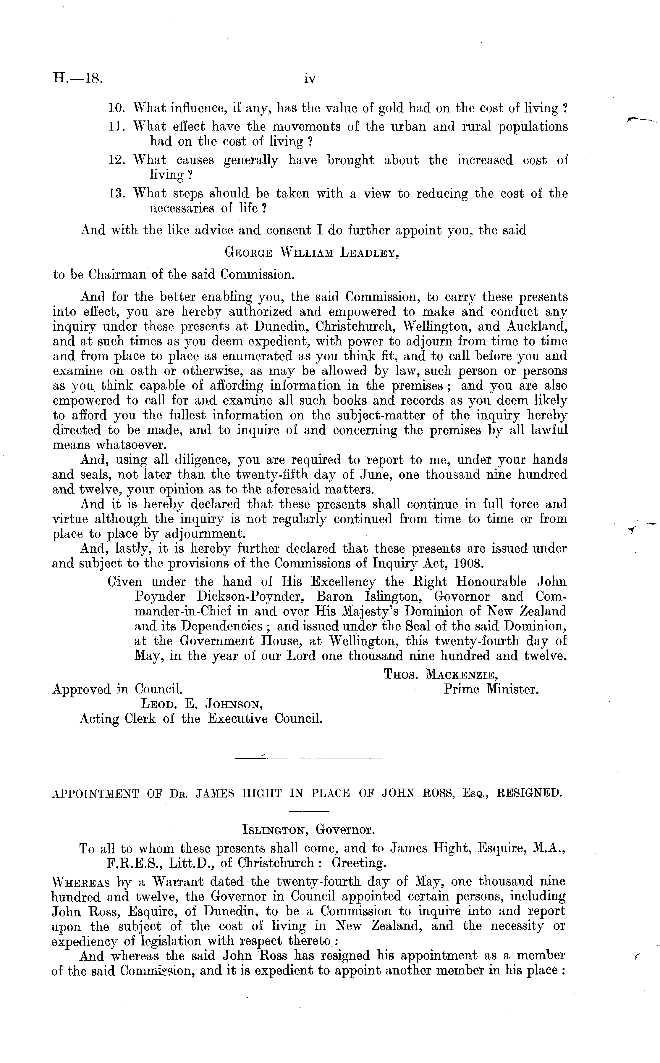 10. What influence, if any, has the value of gold had on the cost of living ? 11. What effect have the movements of the urban and rural populations had on the cost of living ? 12. What causes generally have brought about the increased cost of living ? 13. What steps should be taken with a view to reducing the cost of the necessaries of life ? And with the like advice and consent I do further appoint you, the said George William Leadley, to be Chairman of the said Commission. And for the better enabling you, the said Commission, to carry these presents into effect, you are hereby authorized and empowered to make and conduct any inquiry under these presents at Dunedin, Christchurch, Wellington, and Auckland, and at such times as you deem expedient, with power to adjourn from time to time and from place to place as enumerated as you think fit, and to call before you and examine on oath or otherwise, as may be allowed by law, such person or persons as you think capable of affording information in the premises ; and you are also empowered to call for and examine all such books and records as you deem likely to afford you the fullest information on the subject-matter of the inquiry hereby directed to be made, and to inquire of and concerning the premises by all lawful means whatsoever. And, using all diligence, you are required to report to me, under your hands and seals, not later than the twenty-fifth day of June, one thousand nine hundred and twelve, your opinion as to the aforesaid matters. And it is hereby declared that these presents shall continue in full force and virtue although the inquiry is not regularly continued from time to time or from place to place by adjournment. And, lastly, it is hereby further declared that these presents are issued under and subject to the provisions of the Commissions of Inquiry Act, 1908. Given under the hand of His Excellency the Right Honourable John Poynder Dickson-Poynder, Baron Islington, Governor and Com-mander-in-Chief in and over His Majesty's Dominion of New Zealand and its Dependencies ; and issued under the Seal of the said Dominion, at the Government House, at Wellington, this twenty-fourth day of May, in the year of our Lord one thousand nine hundred and twelve. Thos. Mackenzie, Approved in Council. Prime Minister. Leod. E. Johnson, Acting Clerk of the Executive Council.