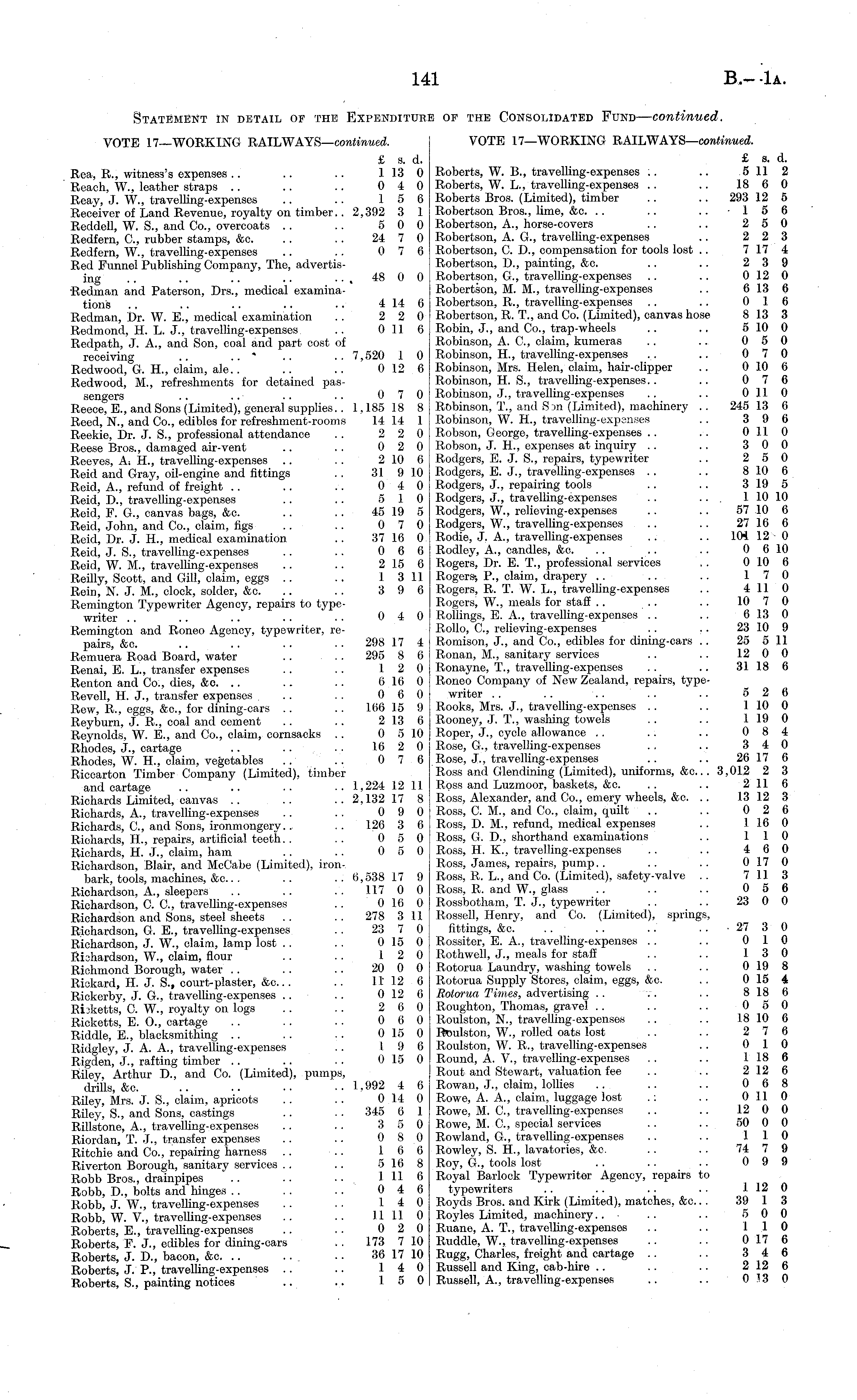 Statement in detail of the Expenditure of the Consolidated Fund — continued. VOTE 17—WORKING RAlLWAYS— continued. VOTE 17—WORKING RAlLWAYS—continued. £ s. d. £ s. d. Rea, R., witness's expenses .. .. .. 1 13 0 Roberts, W. 8., travelling-expenses .. .. 5 11 2 Reach, W., leather straps .. .. .. 0 4 0 Roberts, W. L., travelling-expenses . . .. 18 6 0 Reay, J. W., travelling-expenses .. .. 15 6 Roberts Bros. (Limited), timber .. .. 293 12 5 Receiver of Land Revenue, royalty on timber.. 2,392 3 1 Robertson Bros., lime, &c. .. .. ..156 Reddell, W. S., and Co., overcoats .. .. 5 0 0 Robertson, A., horse-covers .. .. 2 5 0 Redfern, C, rubber stamps, &c. . . .. 24 7 0 Robertson, A. G., travelling-expenses .. 2 2 3 Redfern, W., travelling-expenses .. .. 0 7 6 Robertson, C. D., compensation for tools lost .. 717 4 Red Funnel Publishing Company, The, advertis- Robertson, D., painting, &c. .. .. 2 3 9 ing . t ~ , . .. 48 0 0 Robertson, G., travelling-expenses .. .. 012 0 Redman and Paterson, Drs., medical examina- ' Robertson, M. M., travelling-expenses .. 6 13 6 tion's . . .. .. . . • • 414 6 Robertson, R., travelling-expenses .. .. 0 16 Redman, Br. W. E., medical examination . . 2 2 0 Robertson, R. T., and Co. (Limited), canvas hose 8 13 3 Redmond, H. L. J., travelling-expenses .. 0 1] 6 Robin, J., and Co., trap-wheels .. .. 5 10 0 Redpath, J. A., and Son, coal and part cost of Robinson, A. C, claim, kumeras .. .. 0 5 0 receiving .. .. * .. .. 7,520 1 0 Robinson, H., travelling-expenses .. .. 0 7 0 Redwood, G. H., claim, ale. . .. .. 012 6 Robinson, Mrs. Helen, claim, hair-clipper .. 010 6 Redwood, M., refreshments for detained pas- Robinson, H. S., travelling-expenses.. .. 0 7 6 sengers .. .. .. •• 070 Robinson, J., travelling-expenses .. .. 011 0 Reece,E., and Sons (Limited), general supplies.. 1,185 18 8 Robinson, T., and Sm (Limited), machinery .. 245 13 6 Reed, N., and Co., edibles for refreshment-rooms 14 14 1 Robinson, W. H., travelling-expenses .. 3 9 6 Reekie, Dr. J. S., professional attendance .. 2 2 0 Robson, George, travelling-expenses .. . . 0 110 Reese Bros., damaged air-vent .. . . 0 2 0 Robson, J. H., expenses at inquiry .. .. 3 0 0 Reeves, A, H., travelling-expenses .. . . 210 6 Rodgers, E. J. S., repairs, typewriter .. 2 5 0 Reid and Gray, oil-engine and fittings .. 31 910 Rodgers, E. J., travelling-expenses .. .. 810 6 Reid, A., refund of freight .. .. .. 0 4 0 Rodgers, J., repairing tools .. .. 3 19 5 Reid, D., travelling-expenses .. .. 5 10 Rodgers, J., travelling-expenses .. .. . 110 10 Reid, P. G., canvas bags, &o. .. .. 45 19 5 Rodgers, W., relieving-expenses .. .. 57 10 6 Reid, John, and Co., claim, figs .. .. 0 7 0 Rodgers, W., travelling-expenses .. .. 27 16 6 Reid, Dr. J. H., medical examination .. 37 16 0 Rodie, J. A., travelling-expenses .. .. 104 12 0 Reid, J. S., travelling-expenses .. .. 0 6 6 Rodley, A., candles, &c. .. .. .. 0 610 Reid, W. M., travelling-expenses .. .. 215 6 Rogers, Dr. E. T., professional services .. 010 6 Reilly, Scott, and Gill, claim, eggs .. .. 1 3 11 Rogers; P., claim, drapery .. .. .. 17 0 Rein, N. J. M., clock, solder, &c. .. . . 3 9 6 Rogers, R. T. W. L., travelling-expenses .. 4 110 Remington Typewriter Agency, repairs to type- Rogers, W., meals for staff .. . . .. 10 7 0 writer .. .. .. .. .. 040 Rollings, E. A., travelling-expenses . . . . 6 13 0 Remington and Roneo Agency, typewriter, re- Rollo, C, relieving-expenses . . .. 23 10 9 pairs, &c. .. .. . . . . 298 17 4 Romison, J., and Co., edibles for dining-cars .. 25 511 Remuera Road Board, water 295 8 6 Ronan, M., sanitary services .. .. 12 0 0 Renai, E. L., transfer expenses .. .. 12 0 Ronayne, T., travelling-expenses . . .. 31 18 6 Renton and Co., dies, &c. .. .. .. 616 0 Roneo Company of New Zealand, repairs, typeRevell, H. J., transfer expenses ... .. 0 6 0 writer .. .. .. .. .. 526 Rew, R., eggs, &c, for dining-cars .. .. 166 15 9 Rooks, Mrs. J., travelling-expenses .. .. 110 0 Reyburn, J. R., coal and cement .. .. 213 6 Rooney, J. T., washing towels .. .. 119 0 Reynolds, W. E., and Co., claim, cornsacks .. 0 510 Roper, J., cycle allowance . . .. .. 0 8 4 Rhodes, J., cartage .. .. . . 1.6 2 0 Rose, G., travelling-expenses .. .. 3 4 0 Rhodes, W. H., claim, vegetables .. .. 0 7 6 Rose, J., travelling-expenses .. .. 26 17 6 Riccarton Timber Company (Limited), timber Ross and Glendining (Limited), uniforms, &c... 3,012 2 3 and cartage . . .. . • ■ • 1,224 12 11 Ross and Luzmoor, baskets, &o. . . . . 211 6 Richards Limited, canvas .. .. .. 2,132 17 8 Ross, Alexander, and Co., emery wheels, &c. .. 13 12 3 Richards, A., travelling-expenses .. . . 09 0 Ross, C. M., and Co., claim, quilt .. .. 02 6 Richards, C, and Sons, ironmongery. . .. 126 3 6 Ross, D. M., refund, medical expenses .. 116 0 Richards, H., repairs, artificial teeth. . .. 0 5 0 Ross, G. D., shorthand examinations .. 110 Richards, H. J., claim, ham .. .. 0 5 0 Ross, H. X., travelling-expenses .. .. 4 6 0 Richardson, Blair, and McCabe (Limited), iron- Ross, James, repairs, pump. . .. .. 0 17 0 bark, tools, machines, &c... .. .. 6,538 17 9 Ross, R. L., and Co. (Limited), safety-valve .. 7 11 3 Richardson. A., sleepers .. .. .. 117 0 0 Ross, R. and W., glass .. .. .. 05 6 C. C, travelling-expenses .. 016 0 Rossbotham, T. J., typewriter . . .. 23 0 0 Richardson and Sons, steel sheets .. .. 278 3 11 Rossell, Henry, and Co. (Limited), springs, Richardson, G. E., travelling-expenses .. 23 7 0 fittings, &c. . . .. .. ... 27 3 0 Richardson, J. W., claim, lamp lost .. . . 015 0 Rossiter, E. A., travelling-expenses . . .. 0 10 Riohardson, W., claim, flour .. .. 12 0 Rothwell, J., meals for staff .. .. 13 0 Richmond Borough, water .. .. .. 20 0 0 Rotorua Laundry, washing towels .. .. 019 8 Rickard, H. J. S., court-plaster, &c... .. 1112 6 Rotorua Supply Stores, claim, eggs, &c. .. 0 15 4 Rickerby, J. G., travelling-expenses .. .. 012 6 Botorua Times, advertising . . -.-. . . 818 6 Ri3ketts, C. W., royalty on l