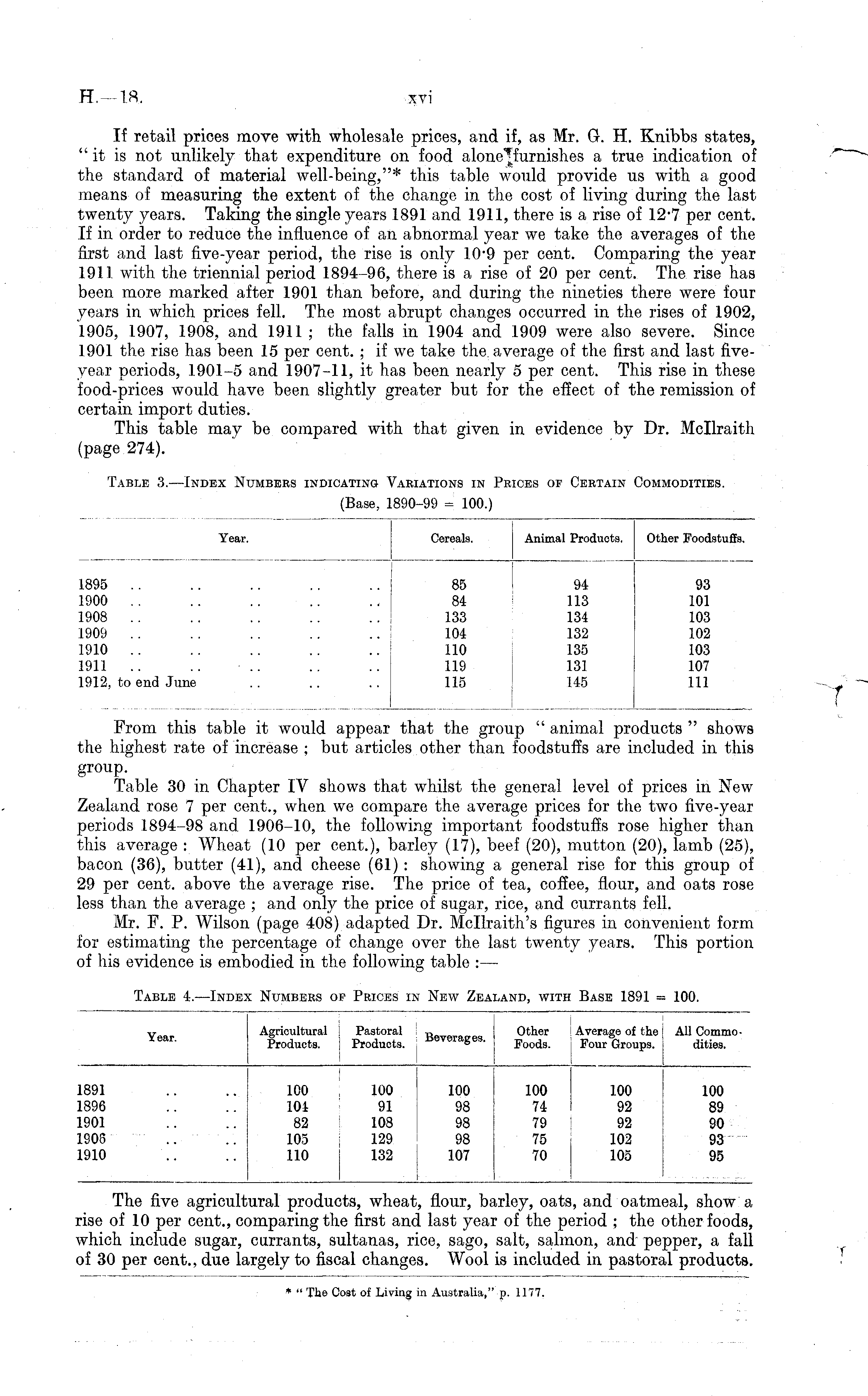 From this table it would appear that the group " animal products " shows the highest rate of increase ; but articles other than foodstuffs are included in this group. Table 30 in Chapter IV shows that whilst the general level of prices in New Zealand rose 7 per cent., when we compare the average prices for the two five-year periods 1894-98 and 1906-10, the following important foodstuffs rose higher than this average : Wheat (10 per cent.), barley (17), beef (20), mutton (20), lamb (25), bacon (36), butter (41), and cheese (61) : showing a general rise for this group of 29 per cent, above the average rise. The price of tea, coffee, flour, and oats rose less than the average ; and only the price of sugar, rice, and currants fell. Mr. F. P. Wilson (page 408) adapted Dr. Mcllraith's figures in convenient form for estimating the percentage of change over the last twenty years. This portion of his evidence is embodied in the following table : —