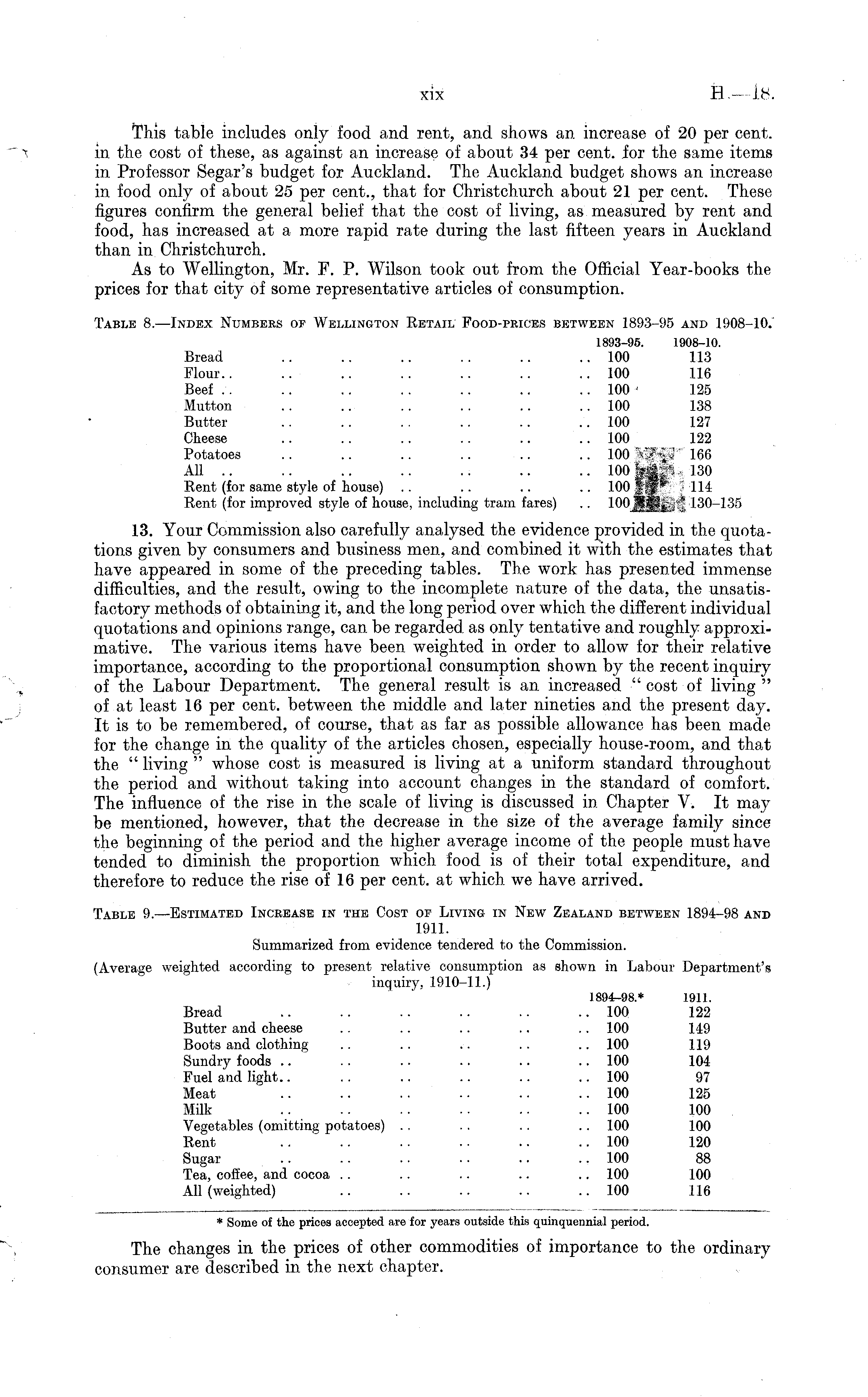 This table includes only food and rent, and shows an increase of 20 per cent, in the cost of these, as against an increase of about 34 per cent, for the same items in Professor Segar's budget for Auckland. The Auckland budget shows an increase in food only of about 25 per cent., that for Christchurch about 21 per cent. These figures confirm the general belief that the cost of living, as measured by rent and food, has increased at a more rapid rate during the last fifteen years in Auckland than in Christchurch. As to Wellington, Mr. F. P. Wilson took out from the Official Year-books the prices for that city of some representative articles of consumption. Table B.—lndex Numbers op Wellington Retail Food-prices between 1893-95 and 1908-10. 1893-95. 1908-10. Bread .. .. .. .. .. ..100 113 Flour.. .. .. .. .. .. ..100 116 Beef .. .. .. .. .. .. .. 100 125 Mutton .. .. .. .. .. .. 100 138 Butter .. .. . . .. .. .. 100 127 Cheese .. .. .. .. .. ..100 122 Potatoes .. .. .. .. .. .. 100 •'••; ! 166 All .. .. .. .. .. .. .. 100'*|/ 130 Rent (for same style of house) . . . . .. .. 100 *f v 111 Rent (for improved style of house, including tram fares) .. * 130-135 13. Your Commission also carefully analysed the evidence provided in the quotations given by consumers and business men, and combined it with the estimates that have appeared in some of the preceding tables. The work has presented immense difficulties, and the result, owing to the incomplete nature of the data, the unsatisfactory methods of obtaining it, and the long period over which the different individual quotations and opinions range, can be regarded as only tentative and roughly approximative. The various items have been weighted in order to allow for their relative importance, according to the proportional consumption shown by the recent inquiry of the Labour Department. The general result is an increased " cost of living " of at least 16 per cent, between the middle and later nineties and the present day. It is to be remembered, of course, that as far as possible allowance has been made for the change in the quality of the articles chosen, especially house-room, and that the " living " whose cost is measured is living at a uniform standard throughout the period and without taking into account changes in the standard of comfort. The influence of the rise in the scale of living is discussed in Chapter V. It may be mentioned, however, that the decrease in the size of the average family since the beginning of the period and the higher average income of the people must have tended to diminish the proportion which food is of their total expenditure, and therefore to reduce the rise of 16 per cent, at which we have arrived. Table 9.—Estimated Increase in the Cost op Living in New Zealand between 1894-98 and 1911. Summarized from evidence tendered to the Commission. (Average weighted according to present relative consumption as shown in Labour Department's inquiry, 1910-11.) 1894-98.* 1911. Bread .. .. .. .. .. ..100 122 Butter and cheese .. . . .. .. .. 100 149 Boots and clothing .. .. .. .. .. 100 119 Sundry foods .. .. .. .. .. .. 100 104 Fuel and light.. .. .. .. .. ..100 97 Meat .. .. .. .. .. ..100 125 Milk .. .. .. .. ..100 100 Vegetables (omitting potatoes) .. .. .. .. 100 100 Rent .. .. .. .. .. ..100 120 Sugar .. .. .. .. .. ..100 88 Tea, coffee, and cocoa .. .. .. .. .. 100 100 All (weighted) .. .. .. .. ..100 116