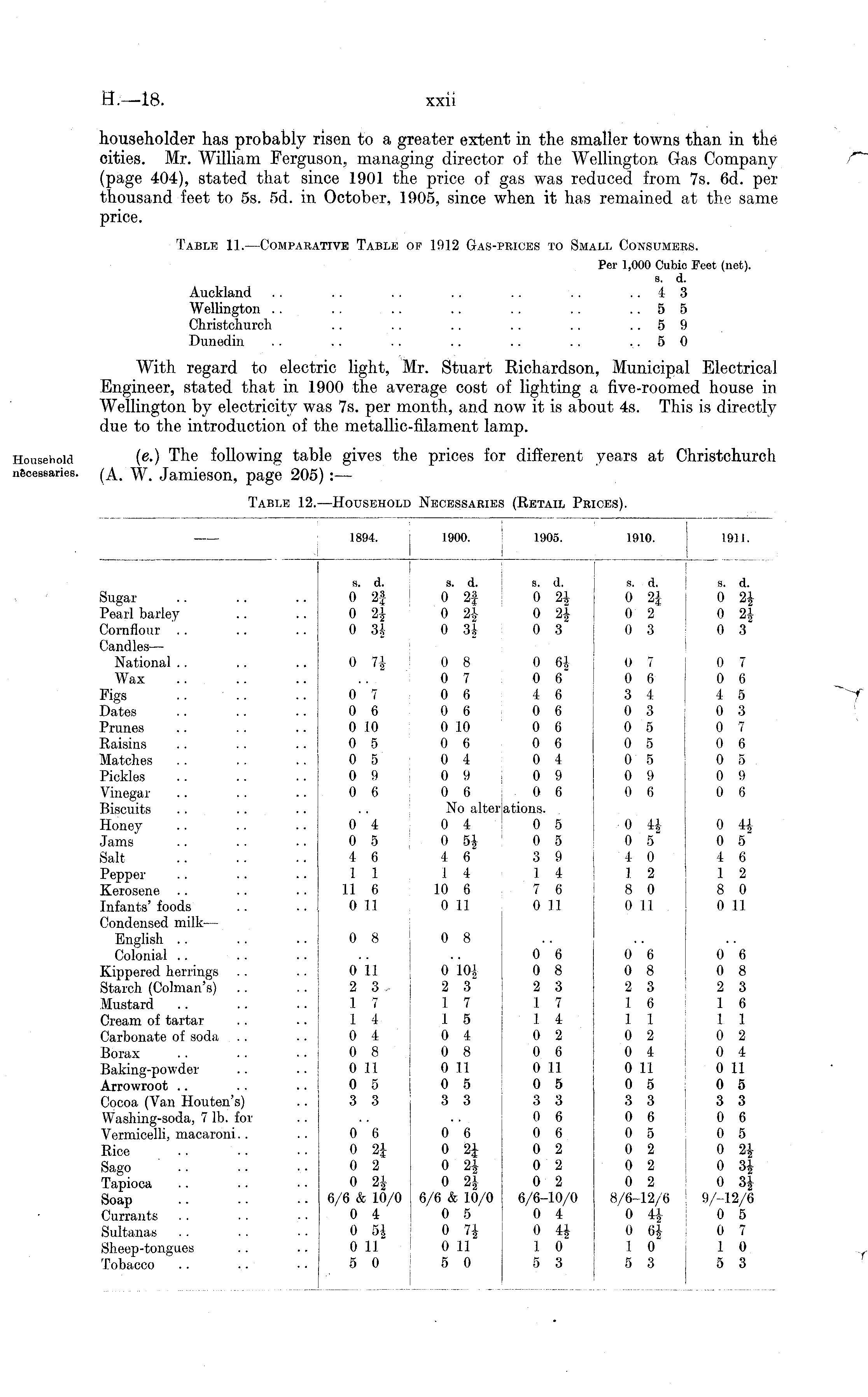 householder has probably risen to a greater extent in the smaller towns than in the cities. Mr. William Ferguson, managing director of the Wellington Gas Company (page 404), stated that since 1901 the price of gas was reduced from 7s. 6d. per thousand feet to ss. sd. in October, 1905, since when it has remained at the same price. Table 11. —Comparative Table op 1912 Gas-prices to Small Consumers. Per 1,000 Cubic Feet (net), s. d. Auckland .. .. .. .. .. .. ..43 Wellington .. .. .. .. .. .. ..55 Christchurch .. .. .. .. . . ..59 Dunedin .. .. .. .. .. .. ..50 With regard to electric light, Mr. Stuart Richardson, Municipal Electrical Engineer, stated that in 1900 the average cost of lighting a five-roomed house in Wellington by electricity was 7s. per month, and now it is about 4s. This is directly due to the introduction of the metallic-filament lamp. (c.) The following table gives the prices for different years at Christchurch (A. W. Jamieson, page 205) : —