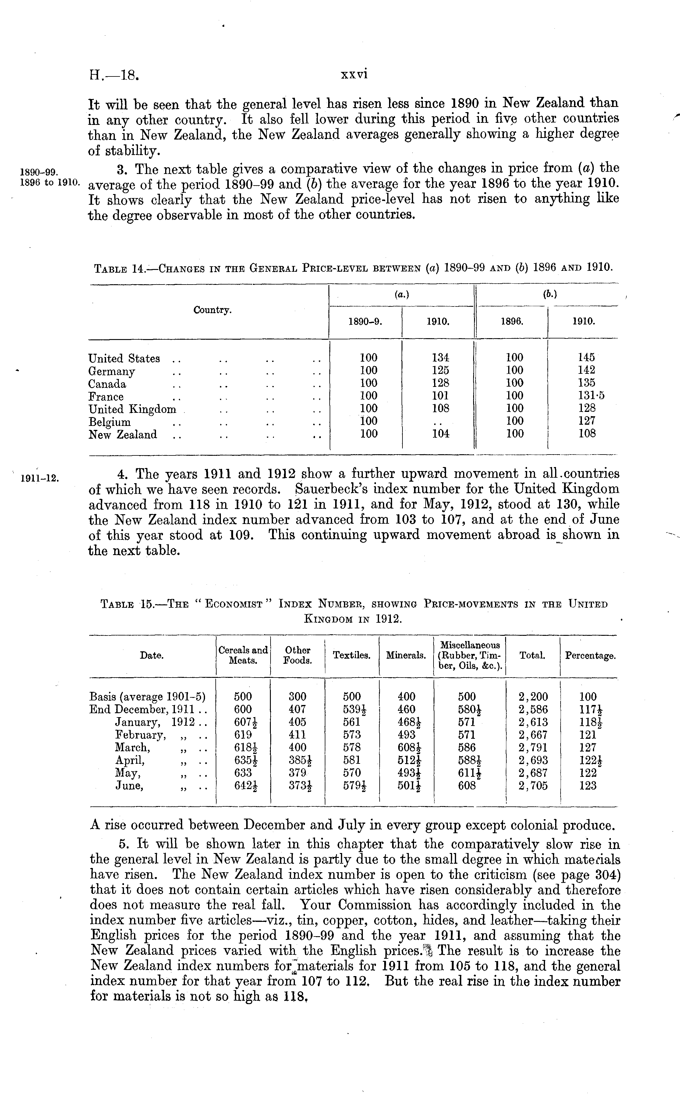 A rise occurred between December and July in every group except colonial produce. 5. It will be shown later in this chapter that the comparatively slow rise in the general level in New Zealand is partly due to the small degree in which materials have risen. The New Zealand index number is open to the criticism (see page 304) that it does not contain certain articles which have risen considerably and therefore does not measure the real fall. Your Commission has accordingly included in the index number five articles—viz., tin, copper, cotton, hides, and leather—taking their English prices for the period 1890-99 and the year 1911, and assuming that the New Zealand prices varied with the English prices. 5 ! The result is to increase the New Zealand index numbers forjmaterials for 1911 from 105 to 118, and the general index number for that year from 107 to 112, But the real rise in the index number for materials is not so high as 118,