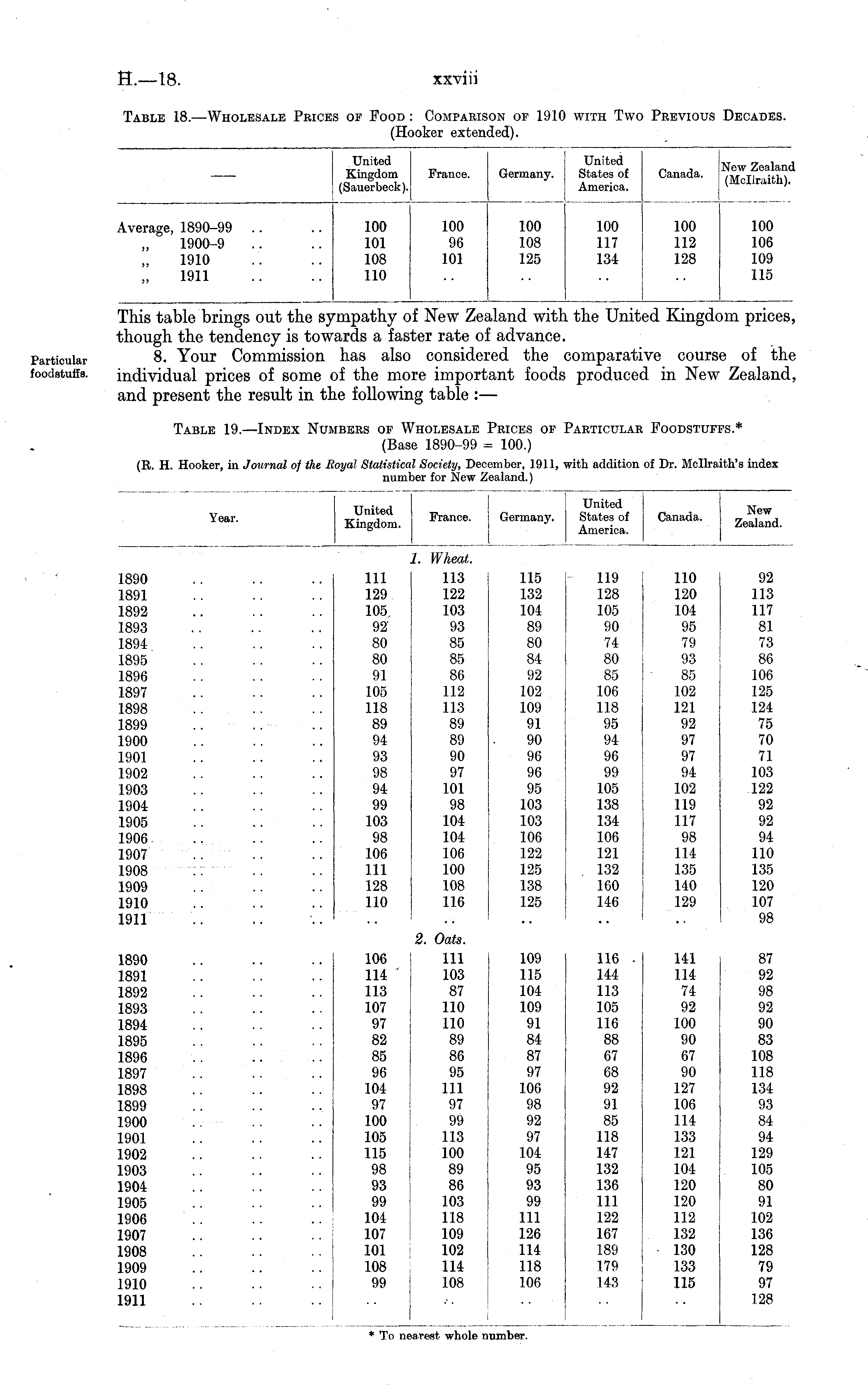 Table 19.—Index Numbers of Wholesale Prices of Particular Foodstuffs*. (Base 1890-99 = 100.) (R. H. Hooker, in Journal of the Royal Statistical Society, December, 1911, with addition of Dr. McIlraith's index number for New Zealand.)
