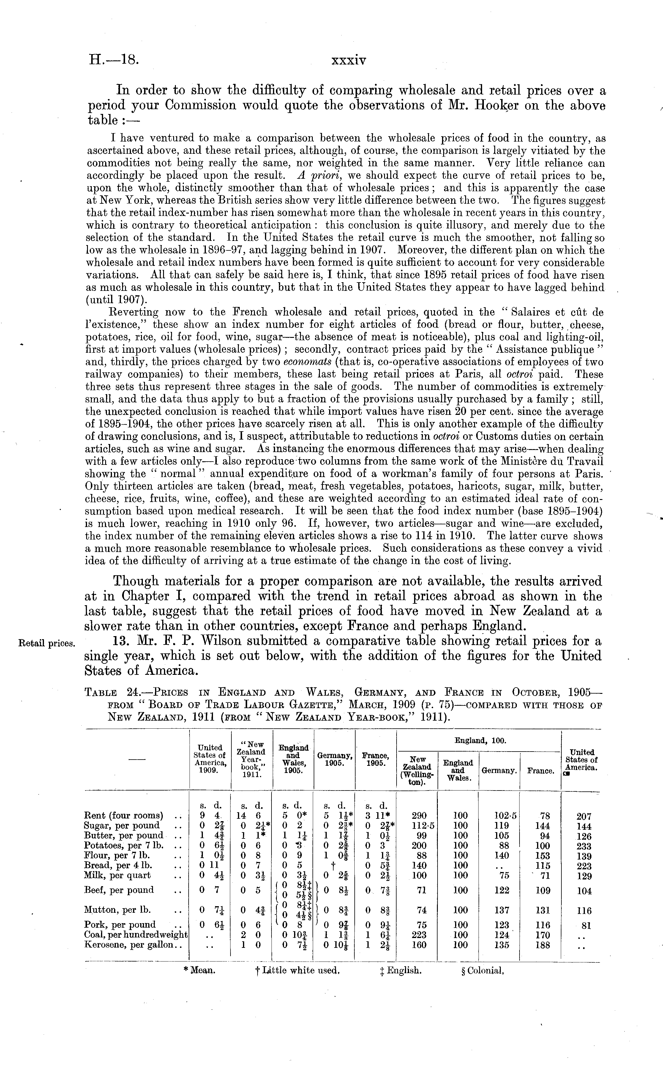 In order to show the difficulty of comparing wholesale and retail prices over a period your Commission would quote the observations of Mr. Hooker on the above table :— I have ventured to make a comparison between the wholesale prices of food in the country, as ascertained above, and these retail prices, although, of course, the comparison is largely vitiated by the commodities not being really the same, nor weighted in the same manner. Very little reliance can accordingly be placed upon the result. A friori, we should expect the curve of retail prices to be, upon the whole, distinctly smoother than that of wholesale prices ; and this is apparently the case at New York, whereas the British series show very little difference between the two. The figures suggest that the retail index-number has risen somewhat more than the wholesale in recent years in this country, which is contrary to theoretical anticipation : this conclusion is quite illusory, and merely due to the selection of the standard. In the United States the retail curve is much the smoother, not falling so low as the wholesale in 1896-97, and lagging behind in 1907. Moreover, the different plan on which the wholesale and retail index numbers have been formed is quite sufficient to account for very considerable variations. All that can safely be said here is, I think, that since 1895 retail prices of food have risen as much as wholesale in this country, but that in the United States they appear to have lagged behind (until 1907). Reverting now to the French wholesale and retail prices, quoted in the " Salaires et cut de l'existence," these show an index number for eight articles of food (bread or flour, butter, cheese, potatoes, rice, oil for food, wine, svgar —the absence of meat is noticeable), plus coal and lighting-oil, first at import values (wholesale prices) ; secondly, contract prices paid by the " Assistance publique " and, thirdly, the prices charged by two economats (that is, co-operative associations of employees of two railway companies) to their members, these last being retail prices at Paris, all octroi paid. These three sets thus represent three stages in the sale of goods. The number of commodities is extremely small, and the data thus apply to but a fraction of the provisions usually purchased by a family ; still, the unexpected conclusion is reached that while import values have risen 20 per cent, since the average of 1895-1904, the other prices have scarcely risen at all. This is only another example of the difficulty of drawing conclusions, and is, I suspect, attributable to reductions in octroi or Customs duties on certain articles, such as wine and sugar. As instancing the enormous differences that may arise—when dealing with a few articles only —I also reproduce two columns from the same work of the Ministere dv Travail showing the " normal " annual expenditure on food of a workman's family of four persons at Paris. Only thirteen articles are taken (bread, meat, fresh vegetables, potatoes, haricots, sugar, milk, butter, cheese, rice, fruits, wine, coffee), and these are weighted according to an estimated ideal rate of consumption based upon medical research. It will be seen that the food index number (base 1895-1904) is much lower, reaching in 1910 only 96. If, however, two articles —sugar and wine—are excluded, the index number of the remaining eleven articles shows a rise to 114 in 1910. The latter curve shows a much more reasonable resemblance to wholesale prices. Such considerations as these convey a vivid idea of the difficulty of arriving at a true estimate of the change in the cost of living. Though materials for a proper comparison are not available, the results arrived at in Chapter I, compared with the trend in retail prices abroad as shown in the last table, suggest that the retail prices of food have moved in New Zealand at a slower rate than in other countries, except France and perhaps England. 13. Mr. F. P. Wilson submitted a comparative table showing retail prices for a single year, which is set out below, with the addition of the figures for the United States of America.