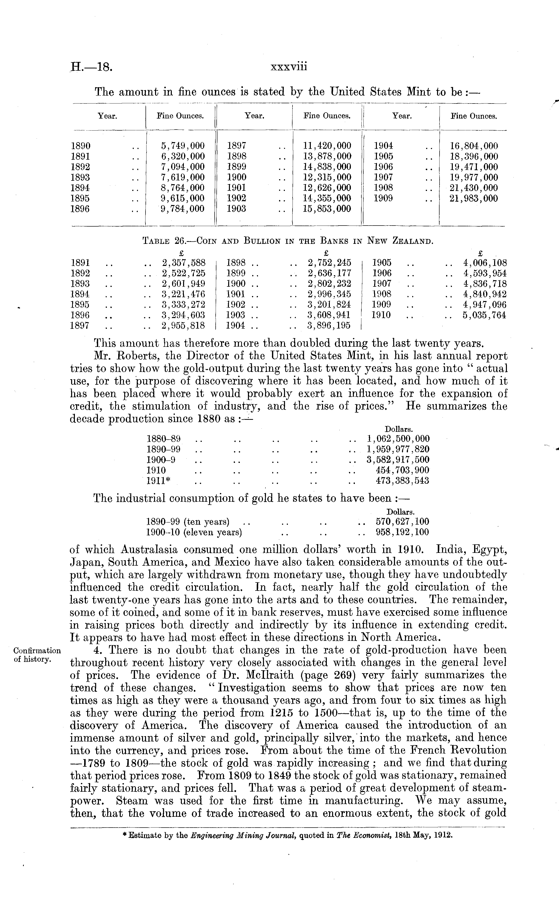 Table 26. —Coin and Bullion in the Banks in New Zealand. £ £ £ 1891 .. .. 2,357,588 1898 .. .. 2,752,245 1905 .. .. 4,006,108 1892 .. .. 2,522,725 1899 .. .. 2,636,177 1906 .. .. 4,593,954 1893 .. .. 2,601,949 1900 .. .. 2,802,232 1907 .. .. 4,836,718 1894 .. .. 3,221,476 1901 .. .. 2,996,345 1908 .. .. 4,840,942 1895 .. .. 3,333,272 1902 .. .. 3,201,824 I 1909 .. .. 4,947,096 1896 .. .. 3,294,603 1903 .. .. 3,608,941 1910 .. .. 5,035,764 1897 .. .. 2,955,818 1904.. ..3,896,195 | This amount has therefore more than doubled during the last twenty years. Mr. Roberts, the Director of the United States Mint, in his last annual report tries to show how the gold-output during the last twenty years has gone into " actual use, for the purpose of discovering where it has been located, and how much of it has been placed where it would probably exert an influence for the expansion of credit, the stimulation of industry, and the rise of prices." He summarizes the decade production since 1880 as :-£- Dollars. 1880-89 .. .. .. .. .. 1,062,500,000 1890-99 .. .. .. .. .. 1,959,977,820 1900-9 .. .. .. .. .. 3,582,917,500 1910 .. .. .. .. .. 454,703,900 1911* .. .. .. .. .. 473,383,543 The industrial consumption of gold he states to have been : — Dollars. 1890-99 (ten years) .. .. .. .. 570,627,100 1900-10 (eleven years) .. .. .. 958,192,100 of which Australasia consumed one million dollars' worth in 1910. India, Egypt, Japan, South America, and Mexico have also taken considerable amounts of the output, which are largely withdrawn from monetary use, though they have undoubtedly influenced the credit circulation. In fact, nearly half the gold circulation of the last twenty-one years has gone into the arts and to these countries. The remainder, some of it coined, and some of it in bank reserves, must have exercised some influence in raising prices both directly and indirectly by its influence in extending credit. It appears to have had most effect in these directions in North America. 4. There is no doubt that changes in the rate of gold-production have been throughout recent history very closely associated with changes in the general level of prices. The evidence of Dr. Mcllraith (page 269) very fairly summarizes the trend of these changes. " Investigation seems to show that prices are now ten times as high as they were a thousand years ago, and from four to six times as high as they were during the period from 1215 to 1500 —that is, up to the time of the discovery of America. The discovery of America caused the introduction of an immense amount of silver and gold, principally silver, into the markets, and hence into the currency, and prices rose. From about the time of the French Revolution —1789 to 1809 —the stock of gold was rapidly increasing ; and we find that during that period prices rose. From 1809 to 1849 the stock of gold was stationary, remained fairly stationary, and prices fell. That was a period of great development of steampower. Steam was used for the first time in manufacturing. We may assume, then, that the volume of trade increased to an enormous extent, the stock of gold