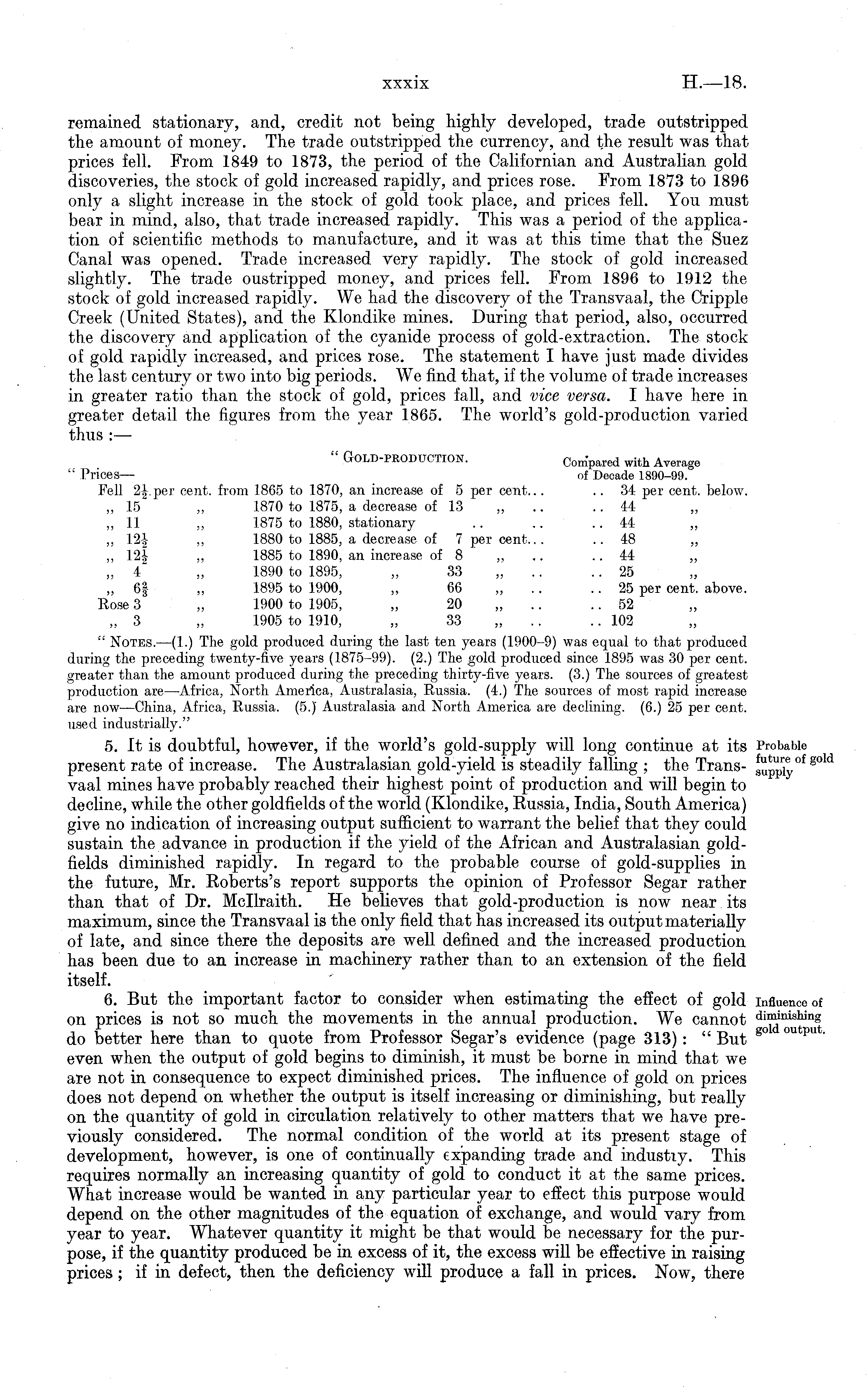 remained stationary, and, credit not being highly developed, trade outstripped the amount of money. The trade outstripped the currency, and the result was that prices fell. From 1849 to 1873, the period of the Californian and Australian gold discoveries, the stock of gold increased rapidly, and prices rose. From 1873 to 1896 only a slight increase in the stock of gold took place, and prices fell. You must bear in mind, also, that trade increased rapidly. This was a period of the application of scientific methods to manufacture, and it was at this time that the Suez Canal was opened. Trade increased very rapidly. The stock of gold increased slightly. The trade oustripped money, and prices fell. From 1896 to 1912 the stock of gold increased rapidly. We had the discovery of the Transvaal, the Cripple Creek (United States), and the Klondike mines. During that period, also, occurred the discovery and application of the cyanide process of gold-extraction. The stock of gold rapidly increased, and prices rose. The statement I have just made divides the last century or two into big periods. We find that, if the volume of trade increases in greater ratio than the stock of gold, prices fall, and vice versa. I have here in greater detail the figures from the year 1865. The world's gold-production varied thus:— " Gold-production. Compared with Average . " Prices— of Decade 1890-99. Fell 2|.per cent, from 1865 to 1870, an increase of 5 per cent... .. 34 per cent, below. „ 15 „ 1870 to 1875, a decrease of 13 „ .. .. 44 „ 11 „ 1875 to 1880, stationary .. .. ..44 ~ 12|- ~ 1880 to 1885, a decrease of 7 per cent... ..48 „ „ 12J „ 1885 to 1890, an increase of 8 „ .. 44 „ 4 „ 1890 to 1895, „ 33 „ .. 25 „ 6| „ 1895 to 1900, „ 66 „ .. 25 per cent, above. Rose 3 „ 1900 to 1905, „ 20 „ .. 52 „ 3 „ 1905 to 1910, „ 33 „ .. 102 " Notes. —(1.) The gold produced during the last ten years (1900-9) was equal to that produced during the preceding twenty-five years (1875-99). (2.) The gold produced since 1895 was 30 per cent, greater than the amount produced during the preceding thirty-five years. (3.) The sources of greatest production are —Africa, North America, Australasia, Russia. (4.) The sources of most rapid increase are now—China, Africa, Russia. (5.) Australasia and North America are declining. (6.) 25 per cent, used industrially." 5. It is doubtful, however, if the world's gold-supply will long continue at its present rate of increase. The Australasian gold-yield is steadily falling ; the Transvaal mines have probably reached their highest point of production and will begin to decline, while the other goldfields of the world (Klondike, Russia, India, South America) give no indication of increasing output sufficient to warrant the belief that they could sustain the advance in production if the yield of the African and Australasian goldfields diminished rapidly. In regard to the probable course of gold-supplies in the future, Mr. Roberts's report supports the opinion of Professor Segar rather than that of Dr. Mcllraith. He believes that gold-production is now near its maximum, since the Transvaal is the only field that has increased its output materially of late, and since there the deposits are well defined and the increased production has been due to an increase in machinery rather than to an extension of the field itself. 6. But the important factor to consider when estimating the effect of gold on prices is not so much the movements in the annual production. We cannot do better here than to quote from Professor Segar's evidence (page 313): " But even when the output of gold begins to diminish, it must be borne in mind that we are not in consequence to expect diminished prices. The influence of gold on prices does not depend on whether the output is itself increasing or diminishing, but really on the quantity of gold in circulation relatively to other matters that we have previously considered. The normal condition of the world at its present stage of development, however, is one of continually expanding trade and industry. This requires normally an increasing quantity of gold to conduct it at the same prices. What increase would be wanted in any particular year to effect this purpose would depend on the other magnitudes of the equation of exchange, and would vary from year to year. Whatever quantity it might be that would be necessary for the purpose, if the quantity produced be in excess of it, the excess will be effective in raising prices; if in defect, then the deficiency will produce a fall in prices. Now, there