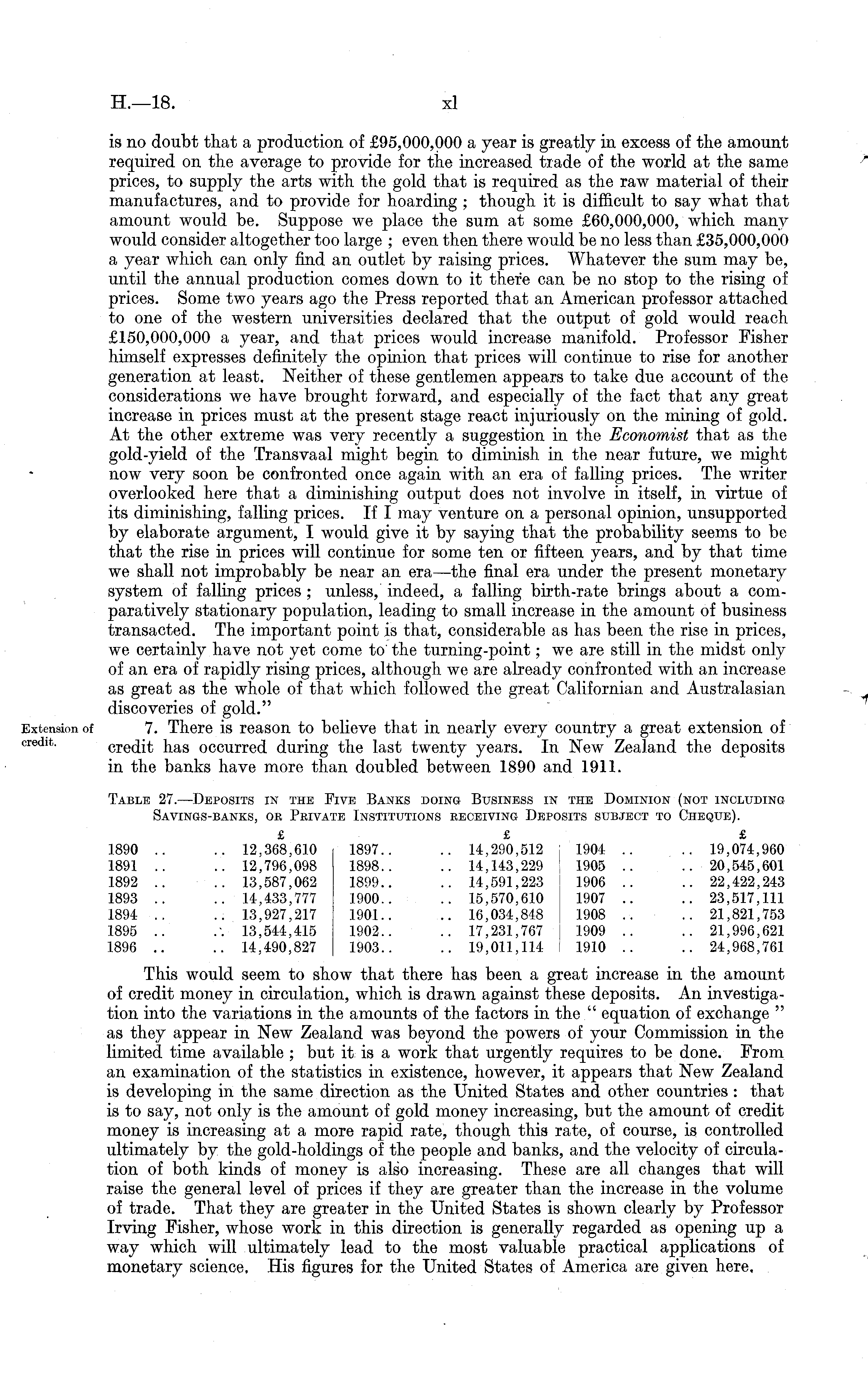 is no doubt that a production of £95,000,000 a year is greatly in excess of the amount required on the average to provide for the increased trade of the world at the same prices, to supply the arts with the gold that is required as the raw material of their manufactures, and to provide for hoarding ; though it is difficult to say what that amount would be. Suppose we place the sum at some £60,000,000, which many would consider altogether too large ; even then there would be no less than £35,000,000 a year which can only find an outlet by raising prices. Whatever the sum may be, until the annual production comes down to it there can be no stop to the rising of prices. Some two years ago the Press reported that an American professor attached to one of the western universities declared that the output of gold would reach £150,000,000 a year, and that prices would increase manifold. Professor Fisher himself expresses definitely the opinion that prices will continue to rise for another generation at least. Neither of these gentlemen appears to take due account of the considerations we have brought forward, and especially of the fact that any great increase in prices must at the present stage react injuriously on the mining of gold. At the other extreme was very recently a suggestion in the Economist that as the gold-yield of the Transvaal might begin to diminish in the near future, we might now very soon be confronted once again with an era of falling prices. The writer overlooked here that a diminishing output does not involve in itself, in virtue of its diminishing, falling prices. If I may venture on a personal opinion, unsupported by elaborate argument, I would give it by saying that the probability seems to be that the rise in prices will continue for some ten or fifteen years, and by that time we shall not improbably be near an era—the final era under the present monetary system of falling prices ; unless, indeed, a falling birth-rate brings about a comparatively stationary population, leading to small increase in the amount of business transacted. The important point is that, considerable as has been the rise in prices, we certainly have not yet come to' the turning-point; we are still in the midst only of an era of rapidly rising prices, although we are already confronted with an increase as great as the whole of that which followed the great Californian and Australasian discoveries of gold." 7. There is reason to believe that in nearly every country a great extension of credit has occurred during the last twenty years. In New Zealand the deposits in the banks have more than doubled between 1890 and 1911. Table 27. —Deposits in the Five Banks doing Business in the Dominion (not including Savings-banks, or Private Institutions receiving Deposits subject to Cheque). £ £ £ 1890 .. .. 12,368,610 1897.. .. 14,290,512 I 1904 .. .. 19,074,960 1891 .. .. 12,796,098 1898.. .. 14,143,229 1905 .. .. 20,545,601 1892 .. .. 13,587,062 1899.. .. 14,591,223 1906 .. .. 22,422,243 1893 .. .. 14,433,777 1900.. .. 15,570,610 1907 .. .. 23,517,111 1894 .. .. 13,927,217 1901.. .. 16,034,848 1908 .. .. 21,821,753 1895 .. .'. 13,544,415 1902.. .. 17,231,767 1909 .. .. 21,996,621 1896 .. .. 14,490,827 1903.. .. 19,011,114 i 1910 .. .. 24,968,761 This would seem to show that there has been a great increase in the amount of credit money in circulation, which is drawn against these deposits. An investigation into the variations in the amounts of the factors in the " equation of exchange " as they appear in New Zealand was beyond the powers of your Commission in the limited time available ; but it is a work that urgently requires to be done. From an examination of the statistics in existence, however, it appears that New Zealand is developing in the same direction as the United States and other countries : that is to say, not only is the amount of gold money increasing, but the amount of credit money is increasing at a more rapid rate, though this rate, of course, is controlled ultimately by the gold-holdings of the people and banks, and the velocity of circulation of both kinds of money is also increasing. These are all changes that will raise the general level of prices if they are greater than the increase in the volume of trade. That they are greater in the United States is shown clearly by Professor Irving Fisher, whose work in this direction is generally regarded as opening up a way which will ultimately lead to the most valuable practical applications of monetary science. His figures for the United States of America are given here.