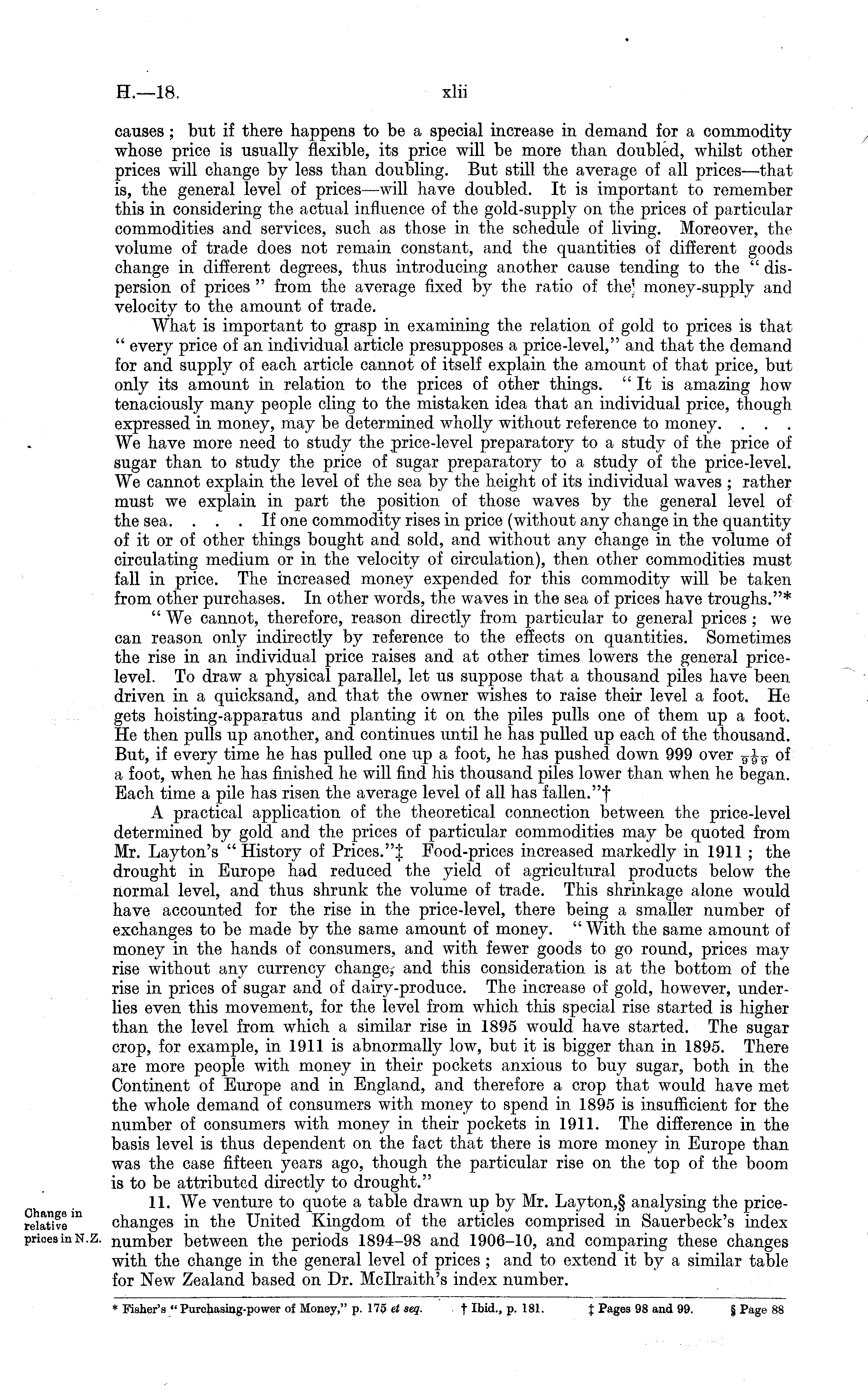causes; but if there happens to be a special increase in demand for a commodity whose price is usually flexible, its price will be more than doubled, whilst other prices will change by less than doubling. But still the average of all prices—that is, the general level of prices—will have doubled. It is important to remember this in considering the actual influence of the gold-supply on the prices of particular commodities and services, such as those in the schedule of living. Moreover, the volume of trade does not remain constant, and the quantities of different goods change in different degrees, thus introducing another cause tending to the " dispersion of prices " from the average fixed by the ratio of the] money-supply and velocity to the amount of trade. What is important to grasp in examining the relation of gold to prices is that " every price of an individual article presupposes a price-level," and that the demand for and supply of each article cannot of itself explain the amount of that price, but only its amount in relation to the prices of other things. "It is amazing how tenaciously many people cling to the mistaken idea that an individual price, though expressed in money, may be determined wholly without reference to money. . . . We have more need to study the price-level preparatory to a study of the price of sugar than to study the price of sugar preparatory to a study of the price-level. We cannot explain the level of the sea by the height of its individual waves ; rather must we explain in part the position of those waves by the general level of the sea. ... If one commodity rises in price (without any change in the quantity of it or of other things bought and sold, and without any change in the volume of circulating medium or in the velocity of circulation), then other commodities must fall in price. The increased money expended for this commodity will be taken from other purchases. In other words, the waves in the sea of prices have troughs."* "We cannot, therefore, reason directly from particular to general prices; we can reason only indirectly by reference to the effects on quantities. Sometimes the rise in an individual price raises and at other times lowers the general pricelevel. To draw a physical parallel, let us suppose that a thousand piles have been driven in a quicksand, and that the owner wishes to raise their level a foot. He gets hoisting-apparatus and planting it on the piles pulls one of them up a foot. He then pulls up another, and continues until he has pulled up each of the thousand. But, if every time he has pulled one up a foot, he has pushed down 999 over g^ ff of a foot, when he has finished he will find his thousand piles lower than when he began. Bach time a pile has risen the average level of all has fallen."f A practical application of the theoretical connection between the price-level determined by gold and the prices of particular commodities may be quoted from Mr. Layton's "History of Prices."! Food-prices increased markedly in 1911 ; the drought in Europe had reduced the yield of agricultural products below the normal level, and thus shrunk the volume of trade. This shrinkage alone would have accounted for the rise in the price-level, there being a smaller number of exchanges to be made by the same amount of money. " With the same amount of money in the hands of consumers, and with fewer goods to go round, prices may rise without any currency change; and this consideration is at the bottom of the rise in prices of sugar and of dairy-produce. The increase of gold, however, underlies even this movement, for the level from which this special rise started is higher than the level from which a similar rise in 1895 would have started. The sugar crop, for example, in 1911 is abnormally low, but it is bigger than in 1895. There are more people with money in their pockets anxious to buy sugar, both in the Continent of Europe and in England, and therefore a crop that would have met the whole demand of consumers with money to spend in 1895 is insufficient for the number of consumers with money in their pockets in 1911. The difference in the basis level is thus dependent on the fact that there is more money in Europe than was the case fifteen years ago, though the particular rise on the top of the boom is to be attributed directly to drought." 11. We venture to quote a table drawn up by Mr. Layton,§ analysing the pricechanges in the United Kingdom of the articles comprised in Sauerbeck's index number between the periods 1894-98 and 1906-10, and comparing these changes with the change in the general level of prices; and to extend it by a similar table for New Zealand based on Dr. Mcllraith's index number.