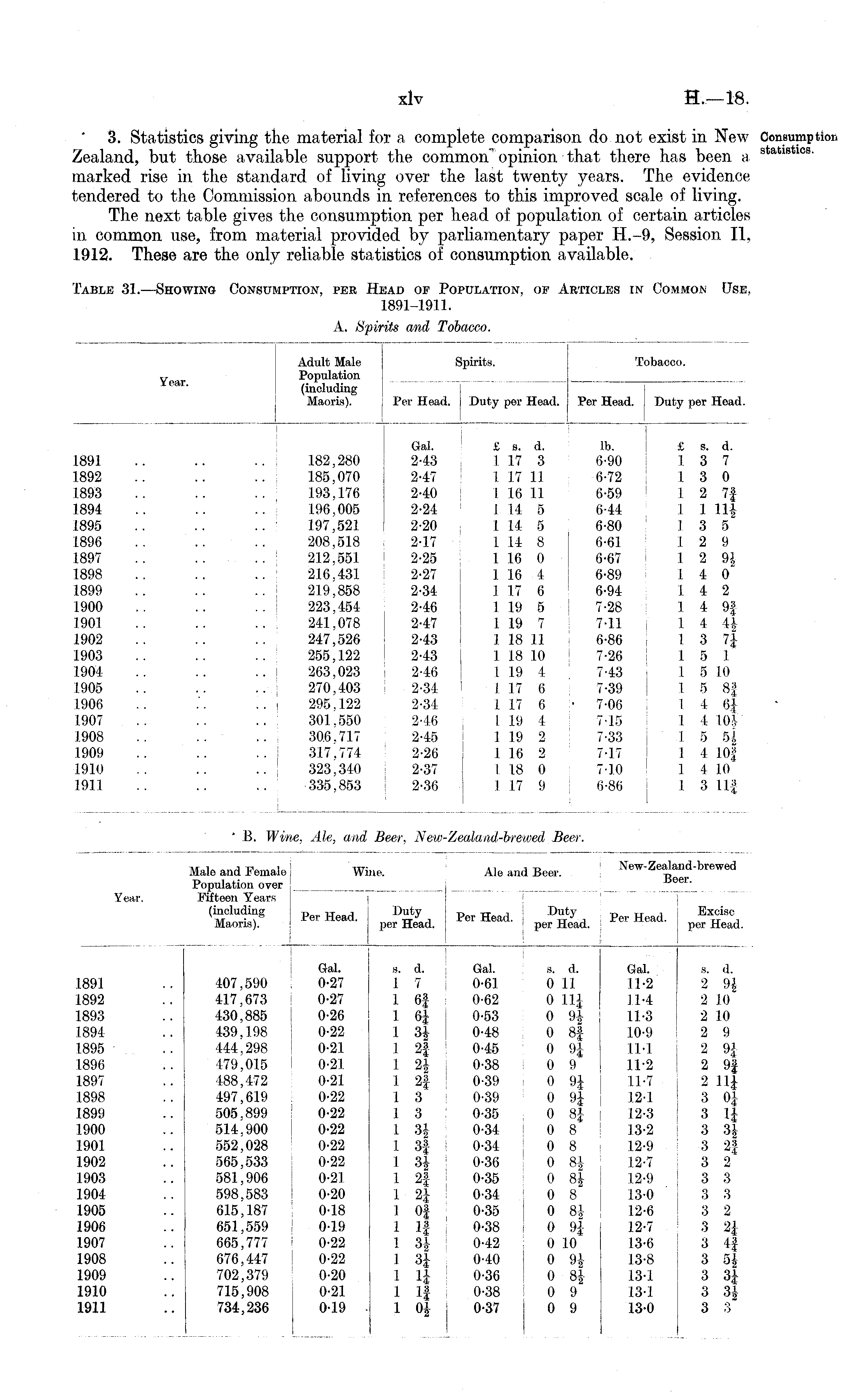 3. Statistics giving the material for a complete comparison do not exist in New Zealand, but those available support the common opinion that there has been a marked rise in the standard of living over the last twenty years. The evidence tendered to the Commission abounds in references to this improved scale of living. The next table gives the consumption per head of population of certain articles in common use, from material provided by parliamentary paper H.-9, Session 11, 1912. These are the only reliable statistics of consumption available.