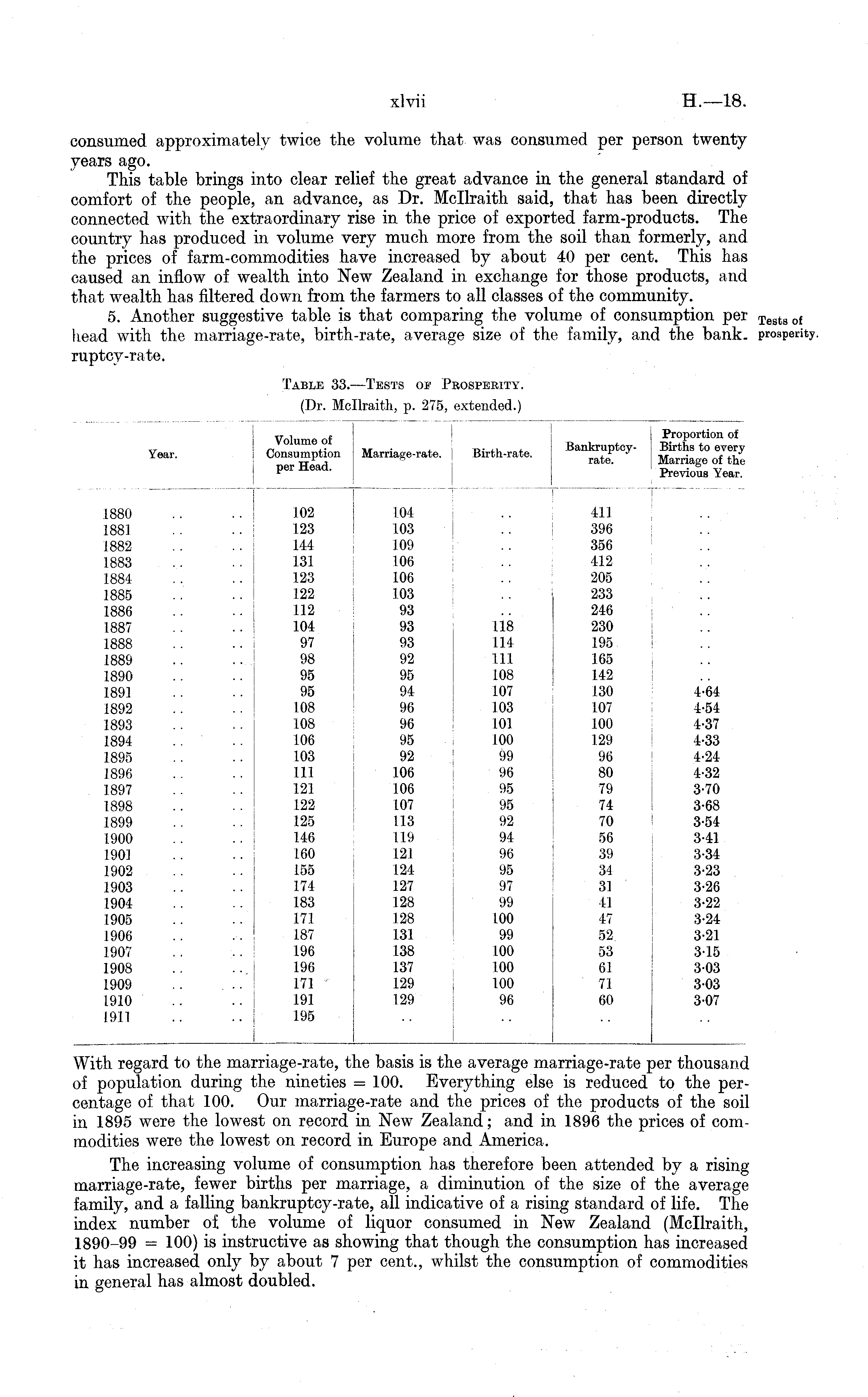 consumed approximately twice the volume that was consumed per person twenty years ago. This table brings into clear relief the great advance in the general standard of comfort of the people, an advance, as Dr. Mcllraith said, that has been directly connected with the extraordinary rise in the price of exported farm-products. The country has produced in volume very much more from the soil than formerly, and the prices of farm-commodities have increased by about 40 per cent. This has caused an inflow of wealth into New Zealand in exchange for those products, and that wealth has filtered down from the farmers to all classes of the community. 5. Another suggestive table is that comparing the volume of consumption per head with the marriage-rate, birth-rate, average size of the family, and the bank, ruptcy-rate.