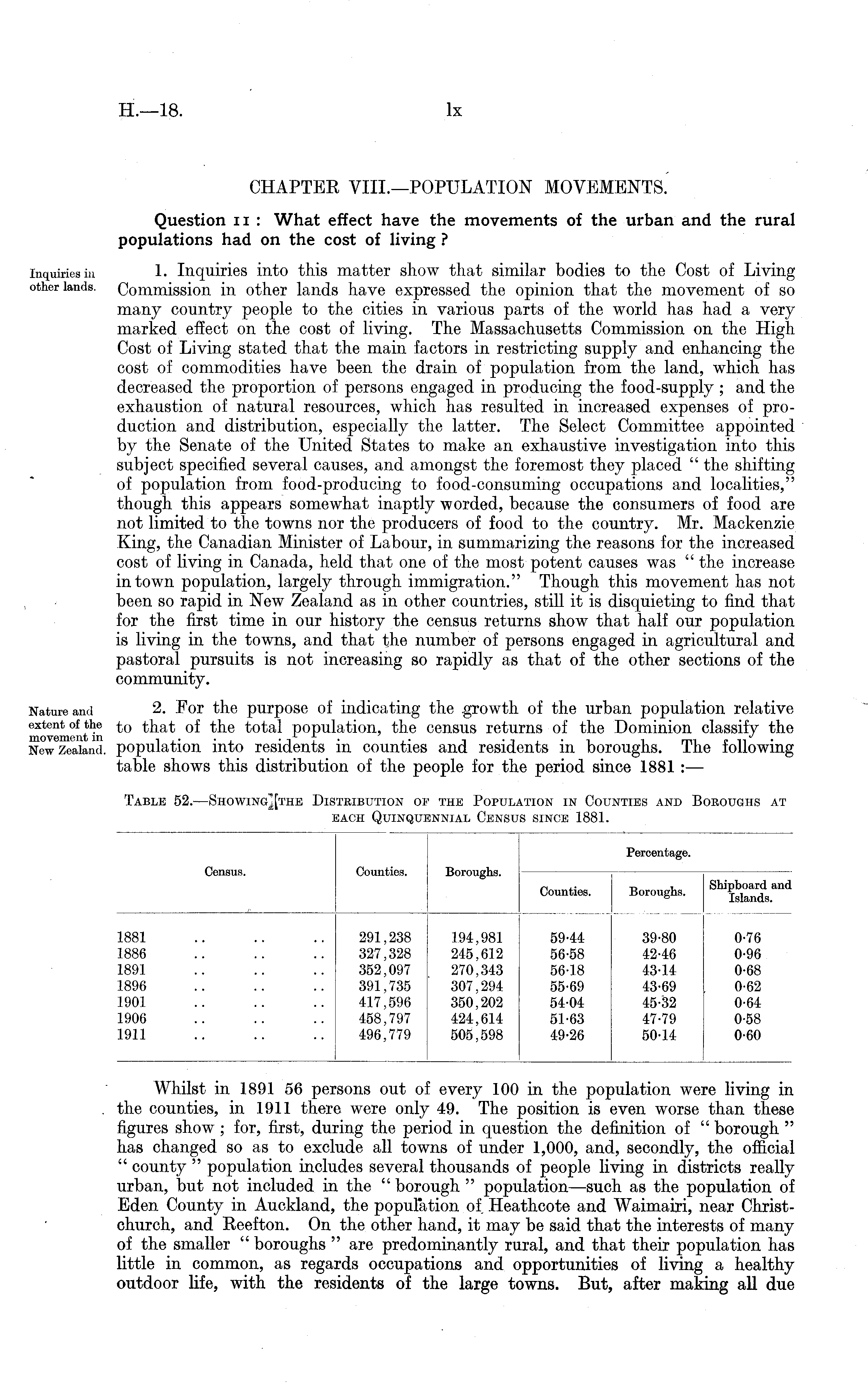 CHAPTER VIII.—POPULATION MOVEMENTS. Question n : What effect have the movements of the urban and the rural populations had on the cost of living ? 1. Inquiries into this matter show that similar bodies to the Cost of Living Commission in other lands have expressed the opinion that the movement of so many country people to the cities in various parts of the world has had a very marked effect on the cost of living. The Massachusetts Commission on the High Cost of Living stated that the main factors in restricting supply and enhancing the cost of commodities have been the drain of population from the land, which has decreased the proportion of persons engaged in producing the food-supply ; and the exhaustion of natural resources, which has resulted in increased expenses of production and distribution, especially the latter. The Select Committee appointed by the Senate of the United States to make an exhaustive investigation into this subject specified several causes, and amongst the foremost they placed " the shifting of population from food-producing to food-consuming occupations and localities," though this appears somewhat inaptly worded, because the consumers of food are not limited to the towns nor the producers of food to the country. Mr. Mackenzie King, the Canadian Minister of Labour, in summarizing the reasons for the increased cost of living in Canada, held that one of the most potent causes was " the increase in town population, largely through immigration." Though this movement has not been so rapid in New Zealand as in other countries, still it is disquieting to find that for the first time in our history the census returns show that half our population is living in the towns, and that the number of persons engaged in agricultural and pastoral pursuits is not increasing so rapidly as that of the other sections of the community. 2. For the purpose of indicating the growth of the urban population relative to that of the total population, the census returns of the Dominion classify the population into residents in counties and residents in boroughs. The following table shows this distribution of the people for the period since 1881 : —