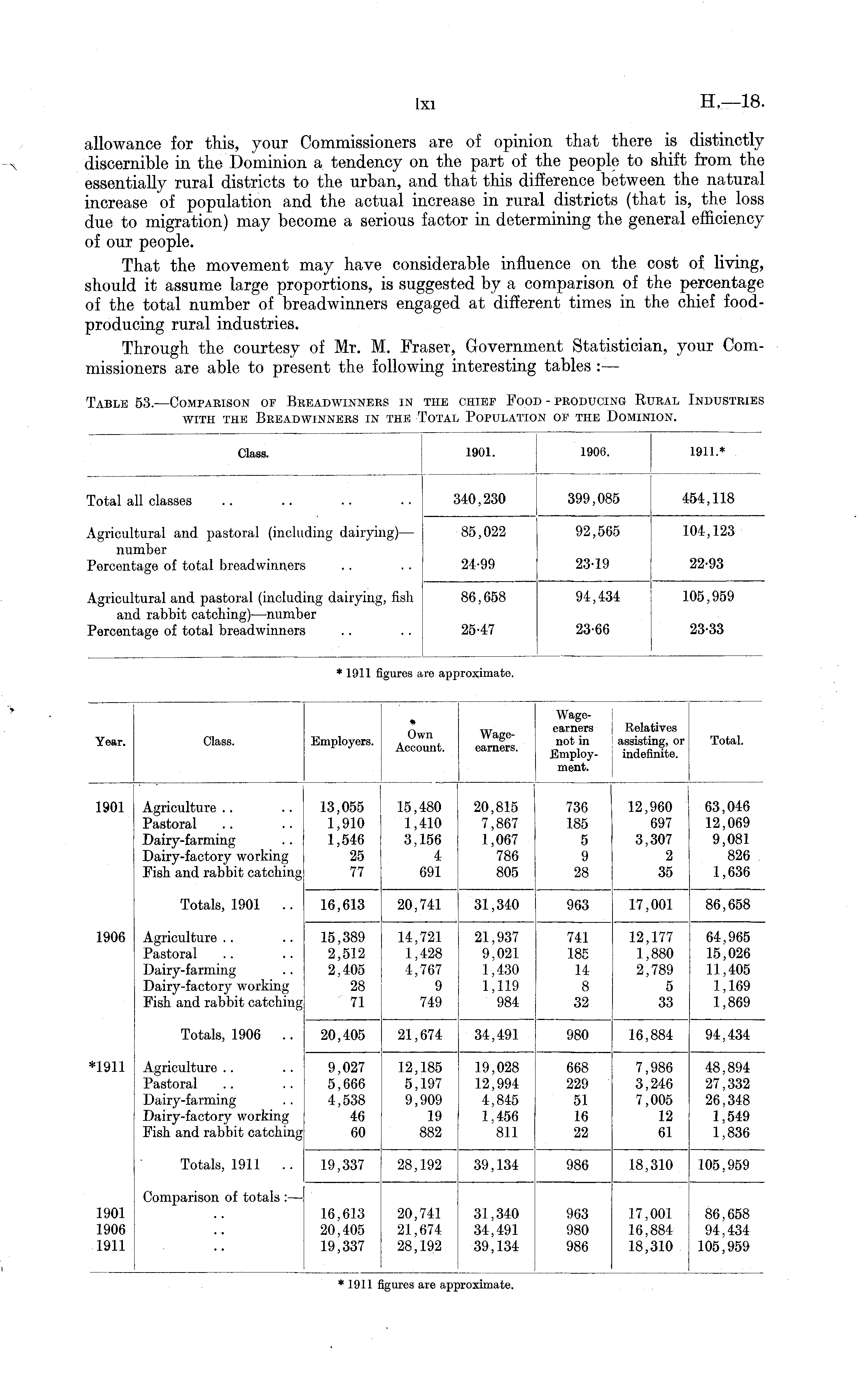 allowance for this, your Commissioners are of opinion that there is distinctly discernible in the Dominion a tendency on the part of the people to shift from the essentially rural districts to the urban, and that this difference between the natural increase of population and the actual increase in rural districts (that is, the loss due to migration) may become a serious factor in determining the general efficiency of our people. That the movement may have considerable influence on the cost of living, should it assume large proportions, is suggested by a comparison of the percentage of the total number of breadwinners engaged at different times in the chief foodproducing rural industries. Through the courtesy of Mr. M. Fraser, Government Statistician, your Commissioners are able to present the following interesting tables : —