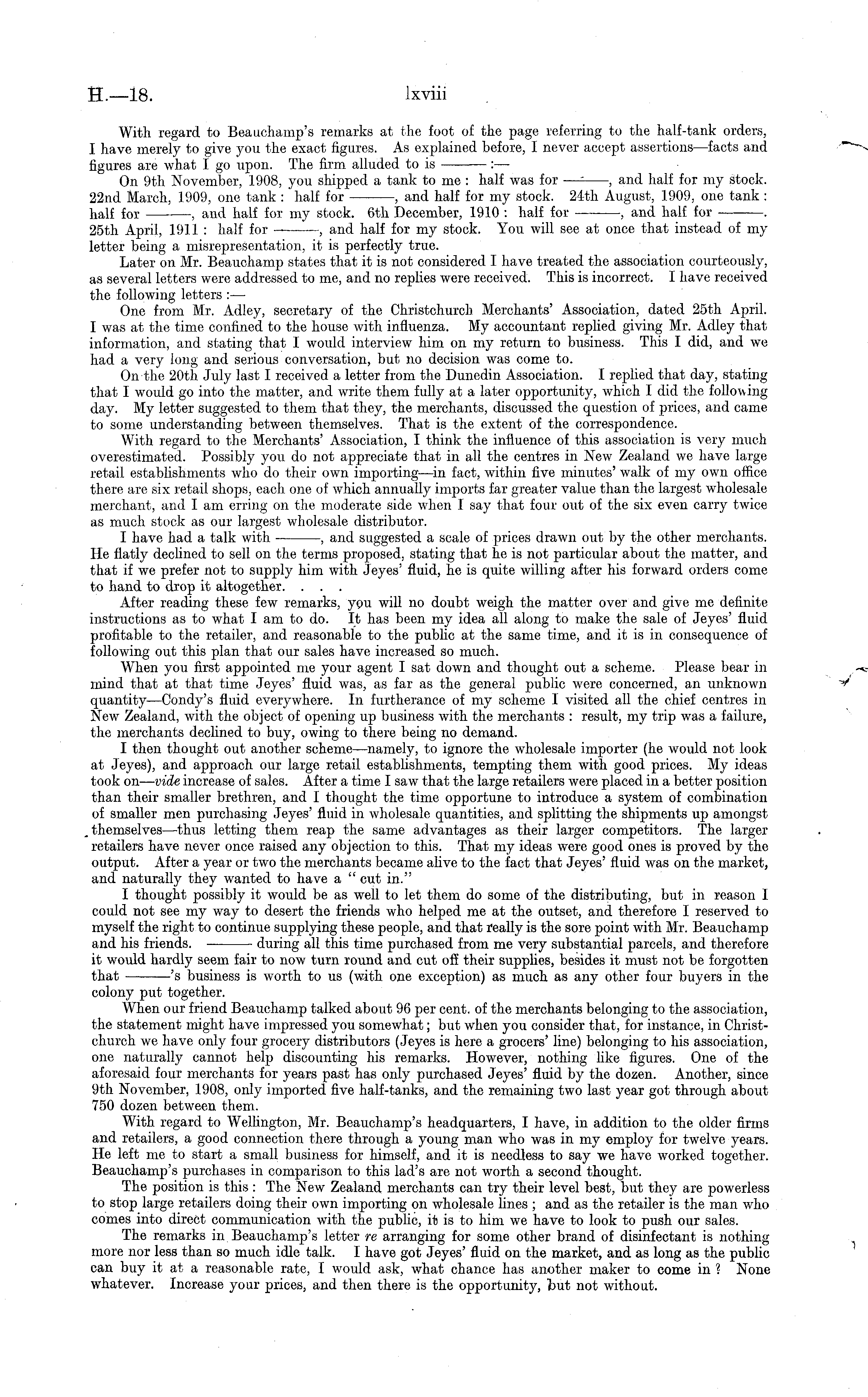 With regard to Beauchamp's remarks at the foot of the page referring to the half-tank orders, I have merely to give you the exact figures. As explained before, I never accept assertions—facts and figures are what Igo upon. The firm alluded to is : — On 9th November, 1908, you shipped a tank to me : half was for — , and half for my stock. 22nd March, 1909, one tank : half for , and half for my stock. 24th August, 1909, one tank : half for , and half for my stock. 6th December, 1910 : half for , and half for . 25th April, 1911 : half for , and half for my stock. You will see at once that instead of my letter being a misrepresentation, it is perfectly true. Later on Mr. Beauchamp states that it is not considered I have treated the association courteously, as several letters were addressed to me, and no replies were received. This is incorrect. I have received the following letters : — One from Mr. Adley, secretary of the Christchurch Merchants' Association, dated 25th April. I was at the time confined to the house with influenza. My accountant replied giving Mr. Adley that information, and stating that I would interview him on my return to business. This I did, and we had a very long and serious conversation, but no decision was come to. On the 20th July last I received a letter from the Dunedin Association. I replied that day, stating that I would go into the matter, and write them fully at a later opportunity, which I did the following day. My letter suggested to them that they, the merchants, discussed the question of prices, and came to some understanding between themselves. That is the extent of the correspondence. With regard to the Merchants' Association, I think the influence of this association is very much overestimated. Possibly you do not appreciate that in all the centres in New Zealand we have large retail establishments who do their own importing—in fact, within five minutes' walk of my own office there are six retail shops, each one of which annually imports far greater value than the largest wholesale merchant, and I am erring on the moderate side when I say that four out of the six even carry twice as much stock as our largest wholesale distributor. I have had a talk with , and suggested a scale of prices drawn out by the other merchants. He flatly declined to sell on the terms proposed, stating that he is not particular about the matter, and that if we prefer not to supply him with Jeyes' fluid, he is quite willing after his forward orders come to hand to drop it altogether. . . . After reading these few remarks, you will no doubt weigh the matter over and give me definite instructions as to what lam to do. It has been my idea all along to make the sale of Jeyes' fluid profitable to the retailer, and reasonable to the public at the same time, and it is in consequence of following out this plan that our sales have increased so much. When you first appointed me your agent I sat down and thought out a scheme. Please bear in mind that at that time Jeyes' fluid was, as far as the general public were concerned, an unknown quantity—Condy's fluid everywhere. In furtherance of my scheme I visited all the chief centres in New Zealand, with the object of opening up business with the merchants : result, my trip was a failure, the merchants declined to buy, owing to there being no demand. I then thought out another scheme —namely, to ignore the wholesale importer (he would not look at Jeyes), and approach our large retail establishments, tempting them with good prices. My ideas took on — vide increase of sales. After a time I saw that the large retailers were placed in a better position than their smaller brethren, and I thought the time opportune to introduce a system of combination of smaller men purchasing Jeyes' fluid in wholesale quantities, and splitting the shipments up amongst , themselves—thus letting them reap the same advantages as their larger competitors. The larger retailers have never once raised any objection to this. That my ideas were good ones is proved by the output. After a year or two the merchants became alive to the fact that Jeyes' fluid was on the market, and naturally they wanted to have a " cut in." I thought possibly it would be as well to let them do some of the distributing, but in reason I could not see my way to desert the friends who helped me at the outset, and therefore I reserved to myself the right to continue supplying these people, and that really is the sore point with Mr. Beauchamp and his friends. during all this time purchased from me very substantial parcels, and therefore it would hardly seem fair to now turn round and cut off their supplies, besides it must not be forgotten that 's business is worth to us (with one exception) as much as any other four buyers in the colony put together. When our friend Beauchamp talked about 96 per cent, of the merchants belonging to the association, the statement might have impressed you somewhat; but when you consider that, for instance, in Christchurch we have only four grocery distributors (Jeyes is here a grocers' line) belonging to his association, one naturally cannot help discounting his remarks. However, nothing like figures. One of the aforesaid four merchants for years past has only purchased Jeyes' fluid by the dozen. Another, since 9th November, 1908, only imported five half-tanks, and the remaining two last year got through about 750 dozen between them. With regard to Wellington, Mr. Beauchamp's headquarters, I have, in addition to the older firms and retailers, a good connection there through a young man who was in my employ for twelve years. He left me to start a small business for himself, and it is needless to say we have worked together. Beauchamp's purchases in comparison to this lad's are not worth a second thought. The position is this : The New Zealand merchants can try their level best, but they are powerless to stop large retailers doing their own importing on who