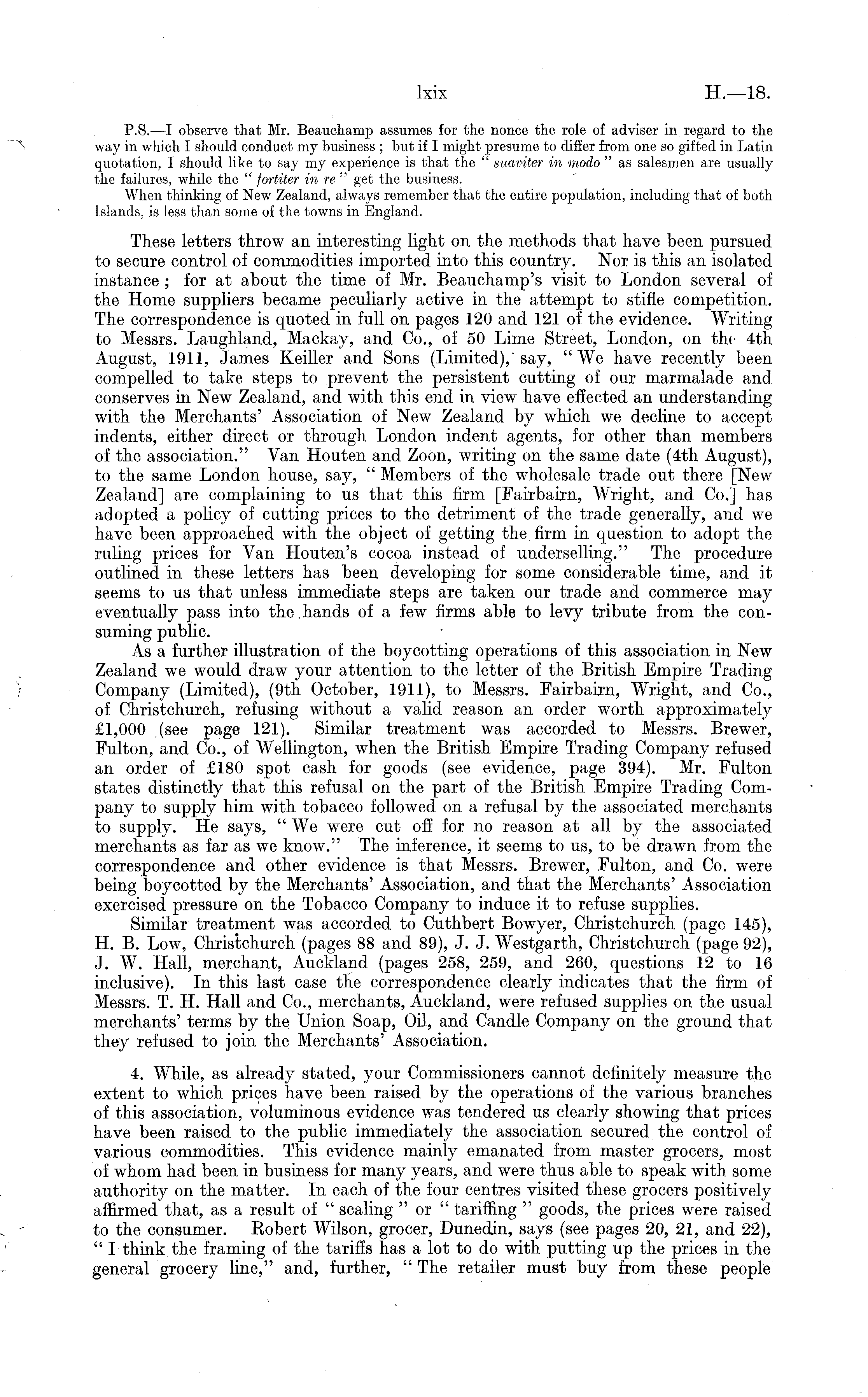 P.S.—I observe that Mr. Beauchamp assumes for the nonce the role of adviser in regard to the way in which I should conduct my business ; but if I might presume to differ from one so gifted in Latin quotation, I should like to say my experience is that the " suaoiter in modo " as salesmen are usually the failures, while the " fortiter in re " get the business. When thinking of New Zealand, always remember that the entire population, including that of both Islands, is less than some of the towns in England. These letters throw an interesting light on the methods that have been pursued to secure control of commodities imported into this country. Nor is this an isolated instance ; for at about the time of Mr. Beauchamp's visit to London several of the Home suppliers became peculiarly active in the attempt to stifle competition. The correspondence is quoted in full on pages 120 and 12.1 of the evidence. Writing to Messrs. Laughland, Mackay, and Co., of 50 Lime Street, London, on the 4th August, 1911, James Keiller and Sons (Limited),'say, "We have recently been compelled to take steps to prevent the persistent cutting of our marmalade and conserves in New Zealand, and with this end in view have effected an understanding with the Merchants' Association of New Zealand by which we decline to accept indents, either direct or through London indent agents, for other than members of the association." Van Houten and Zoon, writing on the same date (4th August), to the same London house, say, " Members of the wholesale trade out there [New Zealand] are complaining to us that this firm [Fairbairn, Wright, and Co.] has adopted a policy of cutting prices to the detriment of the trade generally, and we have been approached with the object of getting the firm in question to adopt the ruling prices for Van Houten's cocoa instead of underselling." The procedure outlined in these letters has been developing for some considerable time, and it seems to us that unless immediate steps are taken our trade and commerce may eventually pass into the.hands of a few firms able to levy tribute from the consuming public. As a further illustration of the boycotting operations of this association in New Zealand we would draw your attention to the letter of the British Empire Trading Company (Limited), (9th October, 1911), to Messrs. Fairbairn, Wright, and Co., of Christchurch, refusing without a valid reason an order worth approximately £1,000 (see page 121). Similar treatment was accorded to Messrs. Brewer, Fulton, and Co., of Wellington, when the British Empire Trading Company refused an order of £180 spot cash for goods (see evidence, page 394). Mr. Fulton states distinctly that this refusal on the part of the British Empire Trading Company to supply him with tobacco followed on a refusal by the associated merchants to supply. He says, "We were cut off for no reason at all by the associated merchants as far as we know." The inference, it seems to us, to be drawn from the correspondence and other evidence is that Messrs. Brewer, Fulton, and Co. were being boycotted by the Merchants' Association, and that the Merchants' Association exercised pressure on the Tobacco Company to induce it to refuse supplies. Similar treatment was accorded to Cuthbert Bowyer, Christchurch (page 145), H. B. Low, Christchurch (pages 88 and 89), J. J. Westgarth, Christchurch (page 92), J. W. Hall, merchant, Auckland (pages 258, 259, and 260, questions 12 to 16 inclusive). In this last case the correspondence clearly indicates that the firm of Messrs. T. H. Hall and Co., merchants, Auckland, were refused supplies on the usual merchants' terms by the Union Soap, Oil, and Candle Company on the ground that they refused to join the Merchants' Association. 4. While, as already stated, your Commissioners cannot definitely measure the extent to which prices have been raised by the operations of the various branches of this association, voluminous evidence was tendered us clearly showing that prices have been raised to the public immediately the association secured the control of various commodities. This evidence mainly emanated from master grocers, most of whom had been in business for many years, and were thus able to speak with some authority on the matter. In each of the four centres visited these grocers positively affirmed that, as a result of " scaling " or " tariffing " goods, the prices were raised to the consumer. Robert Wilson, grocer, Dunedin, says (see pages 20, 21, and 22), " I think the framing of the tariffs has a lot to do with putting up the prices in the general grocery line," and, further, " The retailer must buy from these people