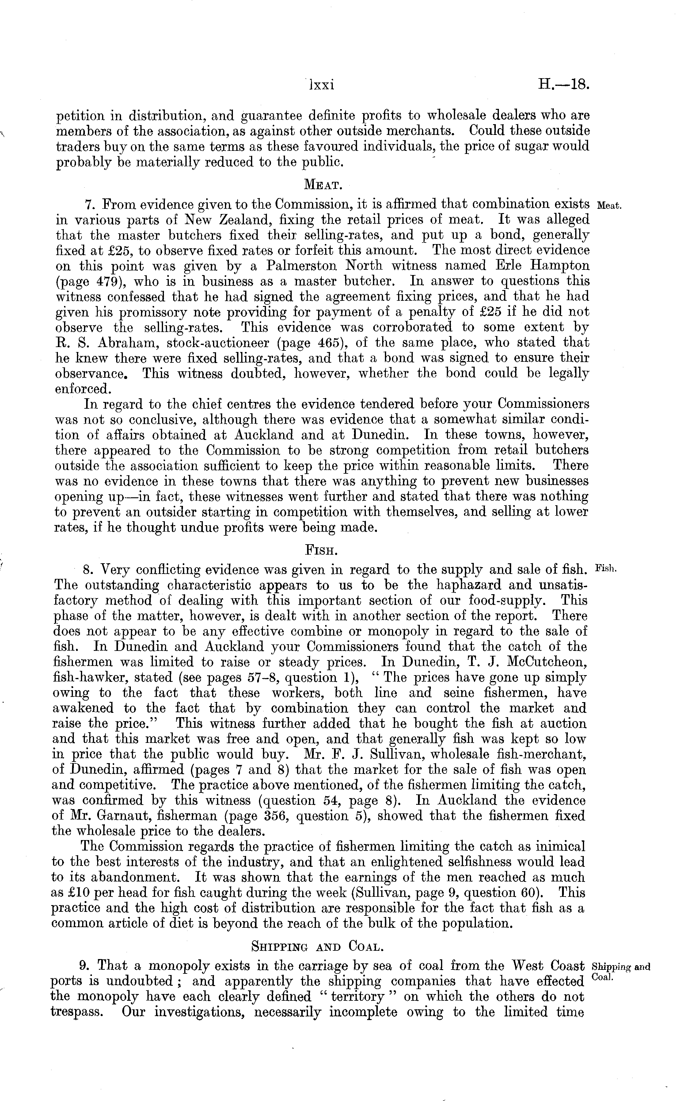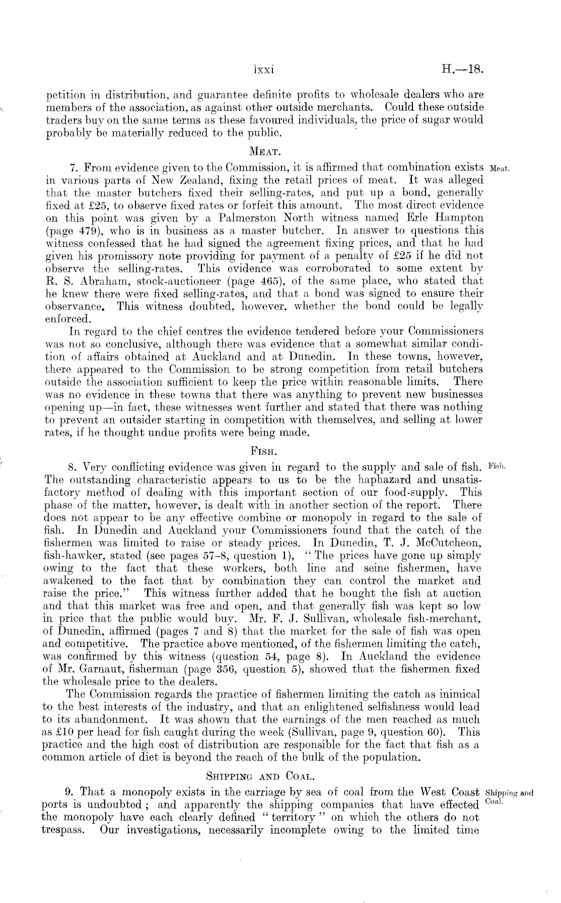 petition in distribution, and guarantee definite profits to wholesale dealers who are members of the association, as against other outside merchants. Could these outside traders buy on the same terms as these favoured individuals, the price of sugar would probably be materially reduced to the public. Meat. 7. From evidence given to the Commission, it is affirmed that combination exists in various parts of New Zealand, fixing the retail prices of meat. It was alleged that the master butchers fixed their selling-rates, and put up a bond, generally fixed at £25, to observe fixed rates or forfeit this amount. The most direct evidence on this point was given by a Palmerston North witness named Erie Hampton (page 479), who is in business as a master butcher. In answer to questions this witness confessed that he had signed the agreement fixing prices, and that he had given his promissory note providing for payment of a penalty of £25 if he did not observe the selling-rates. This evidence was corroborated to some extent by R. S. Abraham, stock-auctioneer (page 465), of the same place, who stated that he knew there were fixed selling-rates, and that a bond was signed to ensure their observance. This witness doubted, however, whether the bond could be legally enforced. In regard to the chief centres the evidence tendered before your Commissioners was not so conclusive, although there was evidence that a somewhat similar condition of affairs obtained at Auckland and at Dunedin. In these towns, however, there appeared to the Commission to be strong competition from retail butchers outside the association sufficient to keep the price within reasonable limits. There was no evidence in these towns that there was anything to prevent new businesses opening vp —in fact, these witnesses went further and stated that there was nothing to prevent an outsider starting in competition with themselves, and selling at lower rates, if he thought undue profits were being made. Fish. 8. Very conflicting evidence was given in regard to the supply and sale of fish. The outstanding characteristic appears to us to be the haphazard and unsatisfactory method of dealing with this important section of our food-supply. This phase of the matter, however, is dealt with in another section of the report. There does not appear to be any effective combine or monopoly in regard to the sale of fish. In Dunedin and Auckland your Commissioners found that the catch of the fishermen was limited to raise or steady prices. In Dunedin, T. J. McCutcheon, fish-hawker, stated (see pages 57-8, question 1), " The prices have gone up simply owing to the fact that these workers, both line and seine fishermen, have awakened to the fact that by combination they can control the market and raise the price." This witness further added that he bought the fish at auction and that this market was free and open, and that generally fish was kept so low in price that the public would buy. Mr. F. J. Sullivan, wholesale fish-merchant, of Dunedin, affirmed (pages 7 and 8) that the market for the sale of fish was open and competitive. The practice above mentioned, of the fishermen limiting the catch, was confirmed by this witness (question 54, page 8). In Auckland the evidence of Mr. Garnaut, fisherman (page 356, question 5), showed that the fishermen fixed the wholesale price to the dealers. The Commission regards the practice of fishermen limiting the catch as inimical to the best interests of the industry, and that an enlightened selfishness would lead to its abandonment. It was shown that the earnings of the men reached as much as £10 per head for fish caught during the week (Sullivan, page 9, question 60). This practice and the high cost of distribution are responsible for the fact that fish as a common article of diet is beyond the reach of the bulk of the population. Shipping and Coal. 9. That a monopoly exists in the carriage by sea of coal from the West Coast ports is undoubted ; and apparently the shipping companies that have effected the monopoly have each clearly defined " territory " on which the others do not trespass. Our investigations, necessarily incomplete owing to the limited time