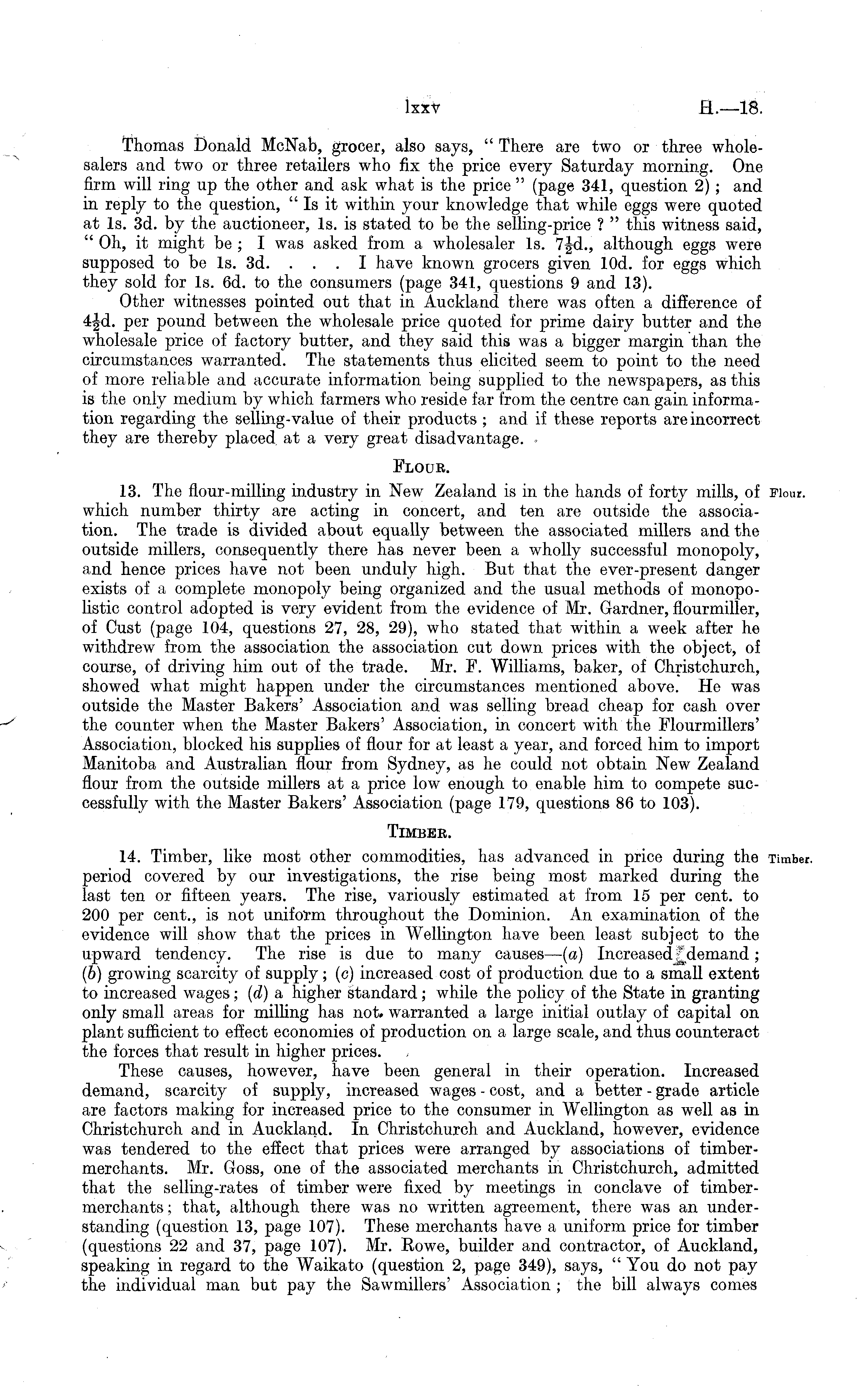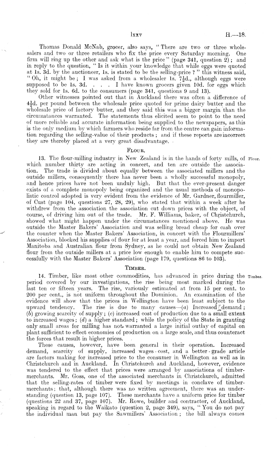 Thomas Donald McNab, grocer, also says, " There are two or three wholesalers and two or three retailers who fix the price every Saturday morning. One firm will ring up the other and ask what is the price " (page 341, question 2) ; and in reply to the question, "Is it within your knowledge that while eggs were quoted at Is. 3d. by the auctioneer, Is. is stated to be the selling-price ? " this witness said, " Oh, it might be ; I was asked from a wholesaler Is. 7|d., although eggs were supposed to be Is. 3d. ... I have known grocers given lOd. for eggs which they sold for Is. 6d. to the consumers (page 341, questions 9 and 13). Other witnesses pointed out that in Auckland there was often a difference of 4|d. per pound between the wholesale price quoted for prime dairy butter and the wholesale price of factory butter, and they said this was a bigger margin than the circumstances warranted. The statements thus elicited seem to point to the need of more reliable and accurate information being supplied to the newspapers, as this is the only medium by which farmers who reside far from the centre can gain information regarding the selling-value of their products ; and if these reports are incorrect they are thereby placed at a very great disadvantage. . Flour. 13. The flour-milling industry in New Zealand is in the hands of forty mills, of which number thirty are acting in concert, and ten are outside the association. The trade is divided about equally between the associated millers and the outside millers, consequently there has never been a wholly successful monopoly, and hence prices have not been unduly high. But that the ever-present danger exists of a complete monopoly being organized and the usual methods of monopolistic control adopted is very evident from the evidence of Mr. Gardner, flourmiller, of Cust (page 104, questions 27, 28, 29), who stated that within a week after he withdrew from the association the association cut down prices with the object, of course, of driving him out of the trade. Mr. F. Williams, baker, of Christchurch, showed what might happen under the circumstances mentioned above. He was outside the Master Bakers' Association and was selling bread cheap for cash over the counter when the Master Bakers' Association, in concert with the Flourmillers' Association, blocked his supplies of flour for at least a year, and forced him to import Manitoba and Australian flour from Sydney, as he could not obtain New Zealand flour from the outside millers at a price low enough to enable him to compete successfully with the Master Bakers' Association (page 179, questions 86 to 103). Timber. 14. Timber, like most other commodities, has advanced in price during the period covered by our investigations, the rise being most marked during the last ten or fifteen years. The rise, variously estimated at from 15 per cent, to 200 per cent., is not uniform throughout the Dominion. An examination of the evidence will show that the prices in Wellington have been least subject to the upward tendency. The rise is due to many causes— (a) Increased ; (b) growing scarcity of supply; (c) increased cost of production due to a small extent to increased wages; (d) a higher standard; while the policy of the State in granting only small areas for milling has not. warranted a large initial outlay of capital on plant sufficient to effect economies of production on a large scale, and thus counteract the forces that result in higher prices. These causes, however, have been general in their operation. Increased demand, scarcity of supply, increased wages - cost, and a better - grade article are factors making for increased price to the consumer in Wellington as well as in Christchurch and in Auckland. In Christchurch and Auckland, however, evidence was tendered to the effect that prices were arranged by associations of timbermerchants. Mr. Goss, one of the associated merchants in Christchurch, admitted that the selling-rates of timber were fixed by meetings in conclave of timbermerchants ; that, although there was no written agreement, there was an understanding (question 13, page 107). These merchants have a uniform price for timber (questions 22 and 37, page 107). Mr. Rowe, builder and contractor, of Auckland, speaking in regard to the Waikato (question 2, page 349), says, " You do not pay the individual man but pay the Sawmillers' Association ; the bill always comes