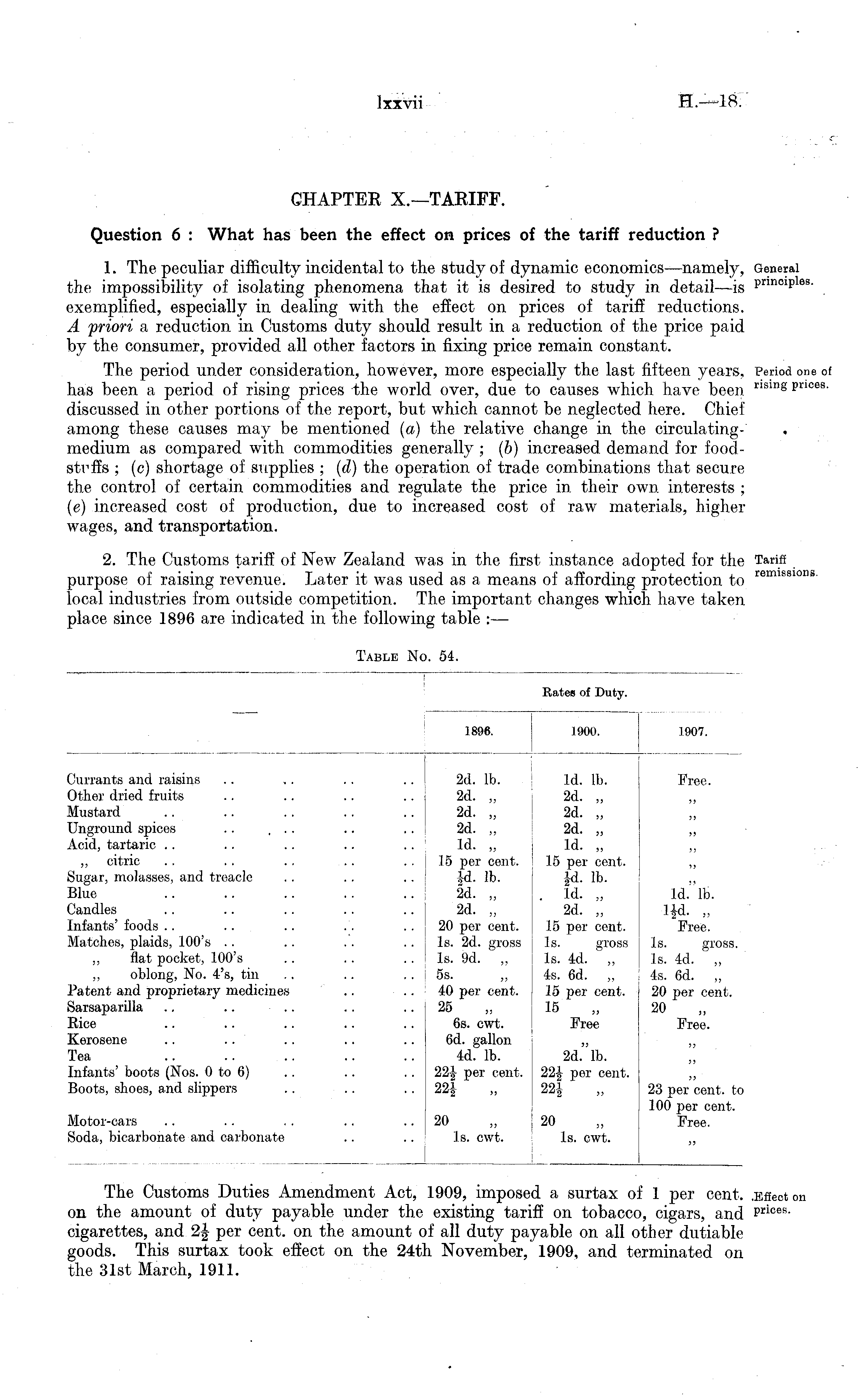 CHAPTER X.— TARIFF. Question 6 : What has been the effect on prices of the tariff reduction ? 1. The peculiar difficulty incidental to the study of dynamic economics—namely, the impossibility of isolating phenomena that it is desired to study in detail—is exemplified, especially in dealing with the effect on prices of tariff reductions. A priori a reduction in Customs duty should result in a reduction of the price paid by the consumer, provided all other factors in fixing price remain constant. The period under consideration, however, more especially the last fifteen years, has been a period of rising prices the world over, due to causes which have been discussed in other portions of the report, but which cannot be neglected here. Chief among these causes may be mentioned (a) the relative change in the circulatingmedium as compared with commodities generally ; (o) increased demand for foodstrffs ; (c) shortage of supplies ; (d) the operation of trade combinations that secure the control of certain commodities and regulate the price in their own. interests ; (c) increased cost of production, due to increased cost of raw materials, higher wages, and transportation. 2. The Customs tariff of New Zealand was in the first instance adopted for the purpose of raising revenue. Later it was used as a means of affording protection to local industries from outside competition. The important changes which have taken place since 1896 are indicated in the following table :—