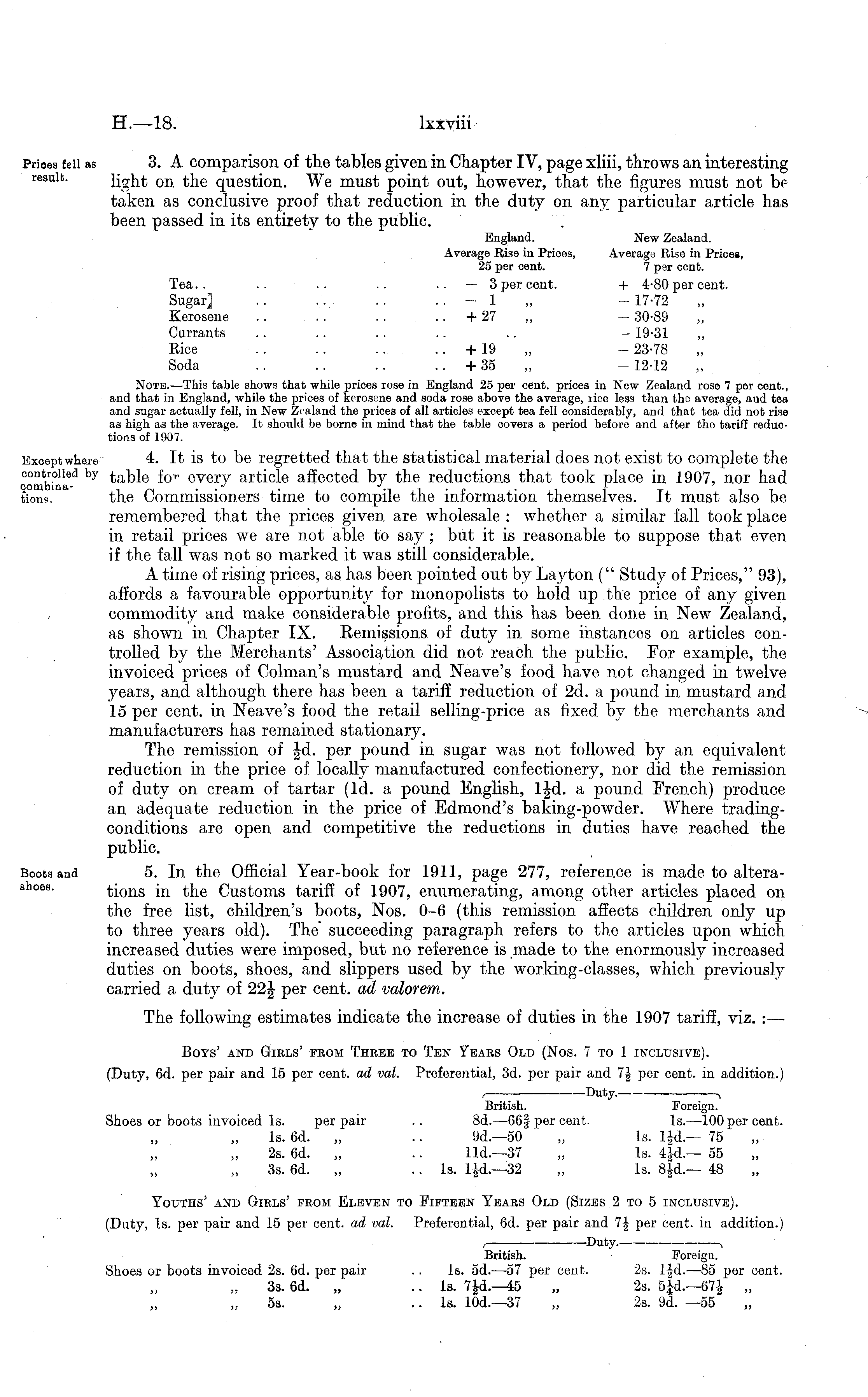 3. A comparison of the tables given in Chapter IV, page xliii, throws an interesting light on the question. We must point out, however, that the figures must not be taken as conclusive proof that reduction in the duty on any particular article has been passed in its entirety to the public. England. New Zealand. Average Rise in Prioes, Average Rise in Prices, 25 per cent. 7 per cent. Tea.. .. .. .. .. — 3 per cent. + 4-80 per cent. Sugar] .. .;.. .. .. - 1 „ -17-72 „ Kerosene .. .. .. .. +27 „ - 30-89 Currants . . .. .. .. .. - 19-31 Rice .. .. .. ... +19 - 23-78 Soda .. .. .. .. + 35 „ - 12-12 Note.—This table shows that while prices rose in England 25 per cent, prices in New Zealand rose 7 per cent., and that in England, while the prices of kerosene and soda rose above the average, rice less than the average, and tea and sugar actually fell, in New Zealand the prices of all articles except tea fell considerably, and that tea did not rise as high as the average. It should be borne in mind that the table covers a period before and after the tariff reductions of 1907. 4. It is to be regretted that the statistical material does not exist to complete the table fo r every article affected by the reductions that took place in 1907, nor had the Commissioners time to compile the information themselves. It must also be remembered that the prices given are wholesale : whether a similar fall took place in retail prices we are not able to say ; but it is reasonable to suppose that even if the fall was not so marked it was still considerable. A time of rising prices, as has been pointed out by Layton (" Study of Prices," 93), affords a favourable opportunity for monopolists to hold up the price of any given commodity and make considerable profits, and this has been done in New Zealand, as shown in Chapter IX. Remissions of duty in some instances on articles controlled by the Merchants' Association did not reach the public. For example, the invoiced prices of Colman's mustard and Neave's food have not changed in twelve years, and although there has been a tariff reduction of 2d. a pound in mustard and 15 per cent, in Neave's food the retail selling-price as fixed by the merchants and manufacturers has remained stationary. The remission of Jd. per pound in sugar was not followed by an equivalent reduction in the price of locally manufactured confectionery, nor did the remission of duty on cream of tartar (Id. a pound English, ljd. a pound French) produce an adequate reduction in the price of Edmond's baking-powder. Where tradingconditions are open and competitive the reductions in duties have reached the public. 5. In the Official Year-book for 1911, page 277, reference is made to alterations in the Customs tariff of 1907, enumerating, among other articles placed on the free list, children's boots, Nos. 0-6 (this remission affects children only up to three years old). The' succeeding paragraph refers to the articles upon which increased duties were imposed, but no reference is made to the enormously increased duties on boots, shoes, and slippers used by the working-classes, which previously carried a duty of 22J per cent, ad valorem. The following estimates indicate the increase of duties in the 1907 tariff, viz. : — Boys' and Girls' from Three to Ten Years Old (Nos. 7 to 1 inclusive). (Duty, 6d. per pair and 15 per cent, ad vol. Preferential, 3d. per pair and 7| per cent, in addition.) , Duty. , British. Foreign. Shoes or boots invoiced Is. per pair .. 8d. —66| per cent. Is. —100 per cent. Is. 6d. „ .. 9d.—50 „ Is. l|d —75 2s. 6d. „ .. lid.—37 „ Is. 4£d.— 55 3s. 6d. „ .. Is. l|d.—32 „ Is. B|d.— 48 Youths' and Girls' from Eleven to Fifteen Years Old (Sizes 2 to 5 inclusive). (Duty, Is. per pair and 15 per cent, ad vol. Preferential, 6d. per pair and 7| per cent, in addition.) , . Duty. ■ ■ —, British. Foreign. Shoes or boots invoiced 2s. 6d. per pair . . Is. 5d.—57 per cent. 2s. l|d.—Bs per cent. 3s. 6d. „ .. Is. 7|d.—45 „ 2s. sJd.—67* „ ss. „ ~ Is. 10d.—37 „ 2s. 9d. —55