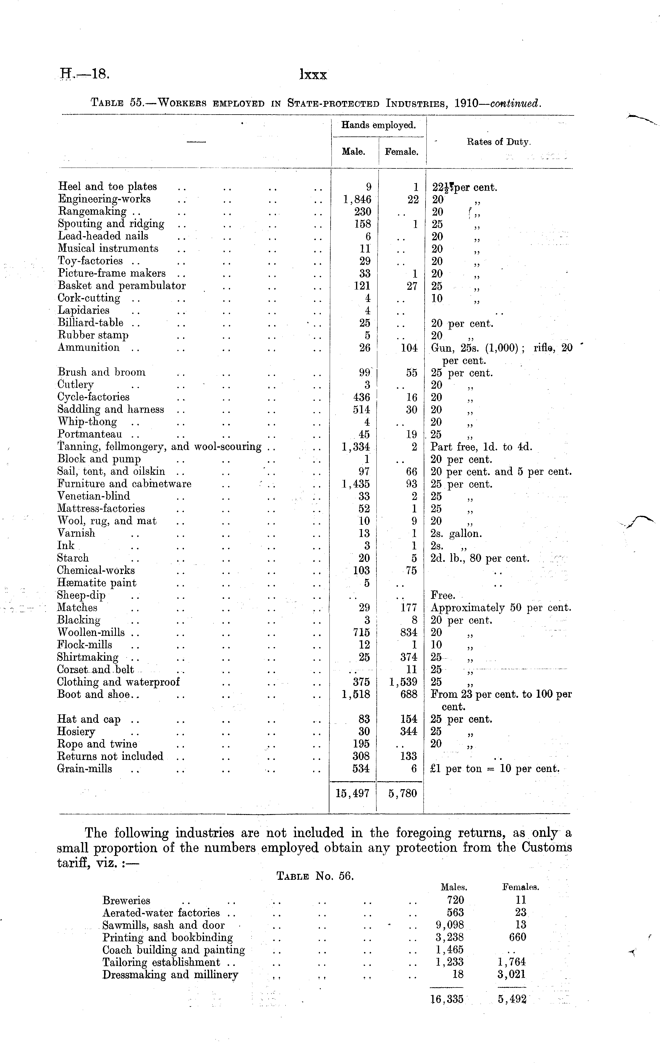 The following industries are not included in the foregoing returns, as only a small proportion of the numbers employed obtain any protection from the Customs tariff, viz. : — Table No. 56. Males. Females. Breweries .. .. .. .. .. .. 720 11 Aerated-water factories .. .. .. .. .. 563 23 Sawmills, sash and door .. .. .. 9,098 13 Printing and bookbinding .. .. .. .. 3,238 660 Coach building and painting .. .. .. .. 1,465 Tailoring establishment .. .. .. .. .. 1,233 1,764 Dressmaking and millinery ~ ~ ~ .. 18 3,021 16,335 5,492
