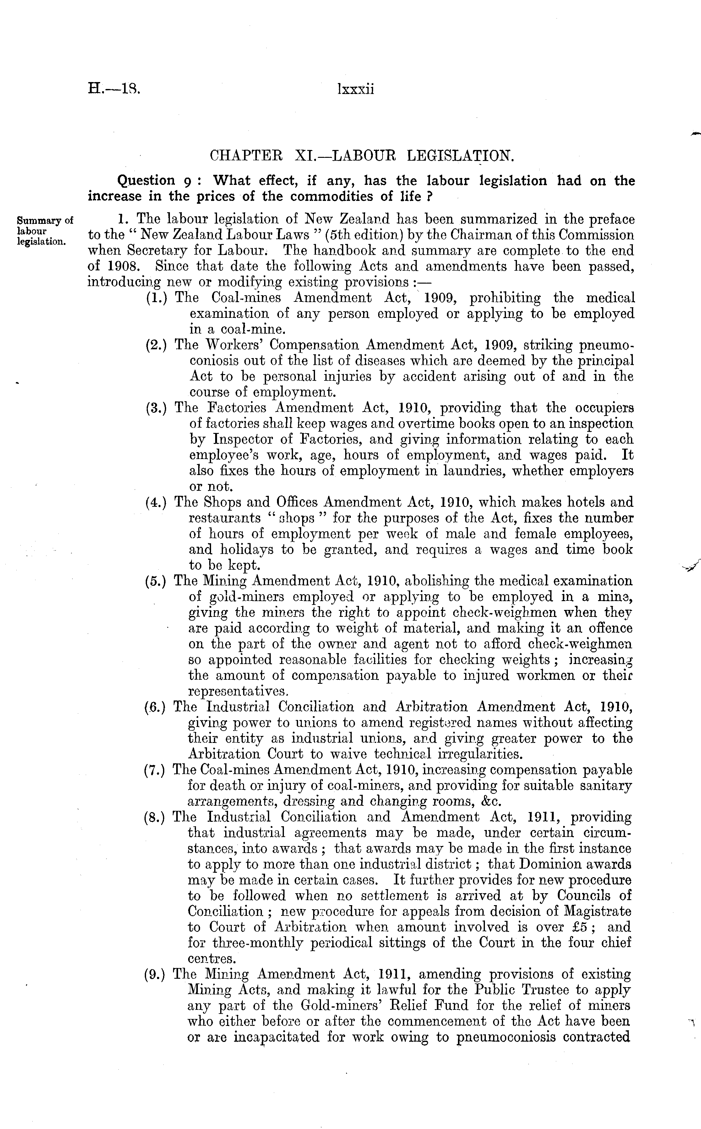 CHAPTER XL—LABOUR LEGISLATION. Question 9 : What effect, if any, has the labour legislation had on the increase in the prices of the commodities of life ? 1. The labour legislation of New Zealand has been summarized in the preface to the " New Zealand Labour Laws " (sth edition) by the Chairman of this Commission when Secretary for Labour. The handbook and summary are complete to the end of 1908. Since that date the following Acts and amendments have been passed, introducing new or modifying existing provisions : — (1.) The Coal-mines Amendment Act, 1909, prohibiting the medical examination of any person employed or applying to be employed in a coal-mine. (2.) The Workers' Compensation Amendment Act, 1909, striking pneumoconiosis out of the list of diseases which are deemed by the principal Act to be personal injuries by accident arising out of and in the course of employment. (3.) The Factories Amendment Act, 1910, providing that the occupiers of factories shall keep wages and overtime books open to an inspection by Inspector of Factories, and giving information relating to each employee's work, age, hours of employment, and wages paid. It also fixes the hours of employment in laundries, whether employers or not. (4.) The Shops and Offices Amendment Act, 1910, which makes hotels and restaurants " shops " for the purposes of the Act, fixes the number of hours of employment per week of male and female employees, and holidays to be granted, and requires a wages and time book to be kept. (5.) The Mining Amendment Act, 1910, abolishing the medical examination of gold-miners employed or applying to be employed in a mine, giving the miners the right to appoint check-weighmen when they are paid according to weight of material, and making it an offence on the part of the owner and agent not to afford check-weighmen so appointed reasonable facilities for checking weights; increasing the amount of compensation payable to injured workmen or their representatives. (6.) The Industrial Conciliation and Arbitration Amendment Act, 1910, giving power to unions to amend registered names without affecting their entity as industrial unions, and giving greater power to the Arbitration Court to waive technical irregularities. (7.) The Coal-mines Amendment Act, 1910, increasing compensation payable for death or injury of coal-miners, and providing for suitable sanitary arrangements, dressing and changing rooms, &c. (8.) The Industrial Conciliation and Amendment Act, 1911, providing that industrial agreements may be made, under certain circumstances, into awards ; that awards may be made in. the first instance to apply to more than one industrial district; that Dominion awards may be made in certain cases. It further provides for new procedure to be followed when no settlement is arrived at by Councils of Conciliation ; new procedure for appeals from decision of Magistrate to Court of Arbitration when amount involved is over £5 ; and for three-monthly periodical sittings of the Court in the four chief centres. (9.) The Mining Amendment Act, 1911, amending provisions of existing Mining Acts, and making it lawful for the Public Trustee to apply any part of the Gold-miners' Relief Fund for the relief of miners who either before or after the commencement of the Act have been or are incapacitated for work owing to pneumoconiosis contracted