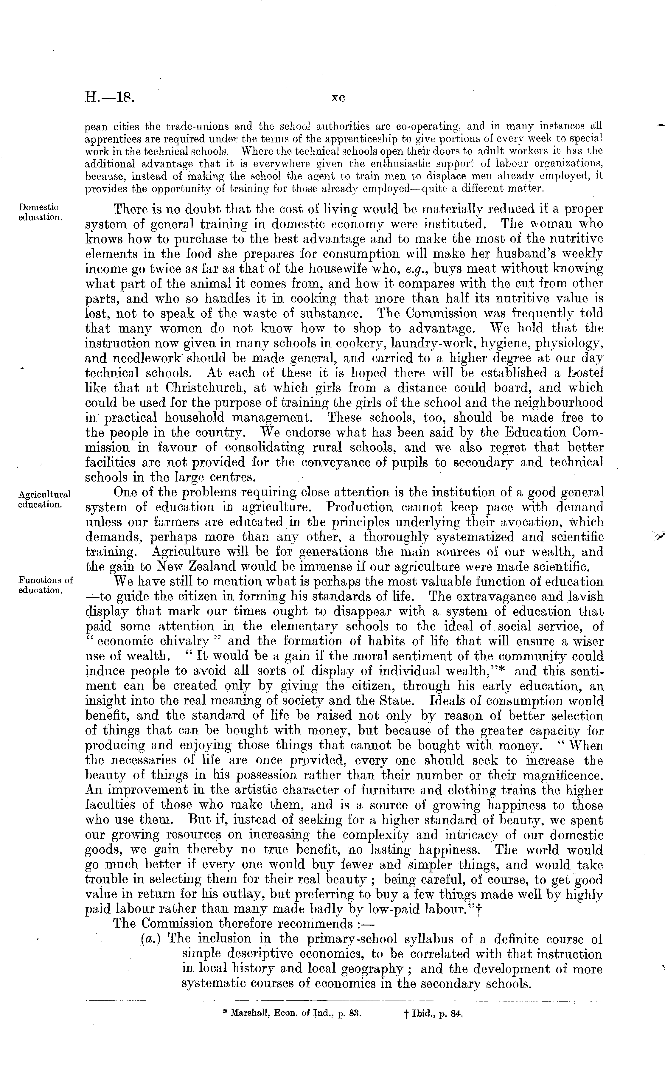 pean cities the trade-unions and the school authorities are co-operating, and in many instances all apprentices are required under the terms of the apprenticeship to give portions of every week to special work in the technical schools. Where the technical schools open their doors to adult workers it has the additional advantage that it is everywhere given the enthusiastic support of labour organizations, because, instead of making the school the agent to train men to displace men already employed, it provides the opportunity of training for those already employed—quite a different matter. There is no doubt that the cost of living would be materially reduced if a proper system of general training in domestic economy were instituted. The woman who knows how to purchase to the best advantage and to make the most of the nutritive elements in the food she prepares for consumption will make her husband's weekly income go twice as far as that of the housewife who, e.g., buys meat without knowing what part of the animal it comes from, and how it compares with the cut from other parts, and who so handles it in cooking that more than half its nutritive value is lost, not to speak of the waste of substance. The Commission was frequently told that many women do not know how to shop to advantage. We hold that the instruction now given in many schools in cookery, laundry-work, hygiene, physiology, and needlework should be made general, and carried to a higher degree at our day technical schools. At each of these it is hoped there will be established a bostel like that at Christchurch, at which girls from a distance could board, and which could be used for the purpose of training the girls of the school and the neighbourhood in' practical household management. These schools, too, should be made free to the people in the country. We endorse what has been said by the Education Commission in favour of consolidating rural schools, and we also regret that better facilities are not provided for the conveyance of pupils to secondary and technical schools in the large centres. One of the problems requiring close attention is the institution of a good general system of education in agriculture. Production cannot keep pace with demand unless our farmers are educated in the principles underlying their avocation, which demands, perhaps more than any other, a thoroughly systematized and scientific training. Agriculture will be for generations the main sources of our wealth, and the gain to New Zealand would be immense if our agriculture were made scientific. We have still to mention what is perhaps the most valuable function of education —to guide the citizen in forming his standards of life. The extravagance and lavish display that mark our times ought to disappear with a system of education that paid some attention in the elementary schools to the ideal of social service, of " economic chivalry " and the formation of habits of life that will ensure a wiser use of wealth. "It would be a gain if the moral sentiment of the community could induce people to avoid all sorts of display of individual wealth,"* and this sentiment can be created only by giving the citizen, through his early education, an insight into the real meaning of society and the State. Ideals of consumption would benefit, and the standard of life be raised not only by reason of better selection of things that can be bought with money, but because of the greater capacity for producing and enjoying those things that cannot be bought with money. " When the necessaries of life are once provided, every one should seek to increase the beauty of things in his possession rather than their number or their magnificence. An improvement in the artistic character of furniture and clothing trains the higher faculties of those who make them, and is a source of growing happiness to those who use them. But if, instead of seeking for a higher standard of beauty, we spent our growing resources on increasing the complexity and intricacy of our domestic goods, we gain thereby no true benefit, no lasting happiness. The world would go much better if every one would buy fewer and simpler things, and would take trouble in selecting them for their real beauty ; being careful, of course, to get good value in return for his outlay, but preferring to buy a few things made well by highly paid labour rather than many made badly by low-paid labour."f The Commission therefore recommends :— (a.) The inclusion in the primary-school syllabus of a definite course of simple descriptive economics, to be correlated with that instruction in local history and local geography; and the development of more systematic courses of economics in the secondary schools.