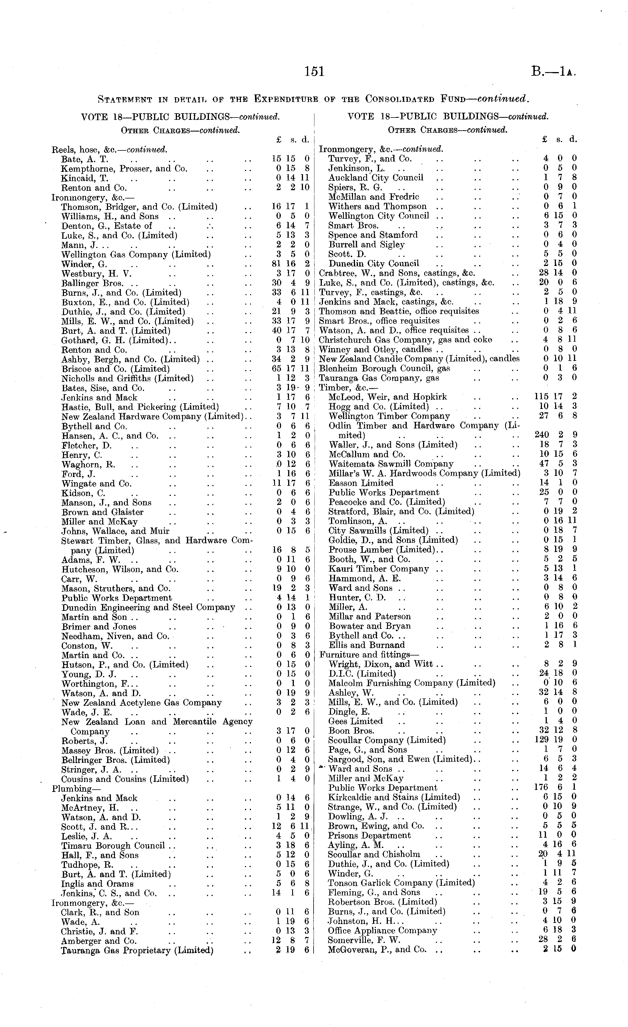 Statement in detail op the Expenditure of the Consolidated Fund— continued. VOTE 18—PUBLIC BUlLDlNGS— continued. ! VOTE 18—PUBLIC BUlLDlNGS— continued. Other Charges— continued. Other Charges— continued. £ s. d. £ s. d. Reels, hose, &c.— continued. Ironmongery, &c.— continued. Bate, A. T. . . . . .. .. 15 15 0 j Turvey, F., and Co. .. .. .. 40 0 Kempthorne, Prosser, and Co. . . .. 015 8 Jenkinson, L. .. .. .. 0 5 0 Kincaid, T. .. .. . . .. 0 14 11 Auckland City Council .. .. .. 17 8 Renton and Co. . . .. .. 2 210 Spiers, R. G. . . .. .. .. 0 9 0 Ironmongery, &c. — McMillan and Fredric . . .. .. 0 7 0 Thomson, Bridger, and Co. (Limited) .. 16 17 1 Withers and Thompson .. .. .. 0 6 1 Williams, H., and Sons . . .. . . 0 5 0 Wellington City Council .. .. .. 6 15 0 Denton, G., Estate of .-. . . 614 7 Smart Bros. .. .. .. .. 3 7 3 Luke, S., and Co. (Limited) .. .. 513 3 Spence and Stamford .. .. .. 0 6 0 Mann, J .. . . .. 2 2 0' Burrell and Sigley .. .. .. 040 Wellington Gas Company (Limited) .. 3 5 0 Scott. D. .. . . .. .. 5 5 0 Winder, G. .. .. ■• •■ 81 16 2 Dunedin City Council .. .. .. 215 0 Westbury, H. V. .. .. .. 3 17 0 Crabtree, W., and Sons, castings, &c. .. 28 14 0 Ballinger Bros. .. .. .. .. 30 4 9 Luke, S., and Co. (Limited), castings, &c. .. 20 0 6 Burns, J., and Co. (Limited) .. .. 33 611 Turvey, F., castings, &c. .. .. 2 5 0 Buxton, E., and Co. (Limited) . . .. 4 011 Jenkins and Mack, castings, &c. .. .. 1 18 9 Duthie, J., and Co. (Limited) . . . . 21 9 3 Thomson and Beattie, office requisites .. 0 411 Mills, E. W., and Co. (Limited) .. .. 33 17 9 Smart Bros., office requisites .. .. 0 2 6 Burt, A. and T. (Limited) .. .. 40 17 7 Watson, A. and D., office requisites .. .. 0 8 6 Gothard, G. H. (Limited).. .. .. 0 7 10 Christehurch Gas Company, gas and coke .. 4 8 11 Renton and Co. . . . . .. 313 8 Winney and Otley, candles .. .. .. 0 8 0 Ashby, Bergh, and Co. (Limited) .. .. 34 2 9 New Zealand Candle Company (Limited), candles 0 10 11 Briscoe and Co. (Limited) . . .. 65 17 11 Blenheim Borough Council, gas .. .. 0 16 Nicholls and Griffiths (Limited) .. .. 1 12 3 Tauranga Gas Company, gas .. . . 0 3 0 Bates, Sise, and Co. .. .. . . 3 19-9 Timber, &c— Jenkins and Mack . . . . .. 1 17 6 McLeod, Weir, and Hopkirk .. .. 115 17 2 Hastie, Bull, and Pickering (Limited) .. 710 7 Hogg and Co. (Limited) .. .. .. 10 14 3 New Zealand Hardware Company (Limited).. 3 7 11 Wellington Timber Company .. .. 27 6 8 Bythell and Co. .. .. .. 0 6 6 Odlin Timber and Hardware Company (LiHansen, A. C, and Co. .. .. .. 12 0 mited) .. .. .. 240 2 9 Fletcher, D. .. .. .. .. 0 6 6 Waller, J., and Sons (Limited) .. .. 18 7 3 Henry, C. .. .. .. .. 310 6 McCallum and Co. .. . . .. 10 15 6 Waghorn, R. .. . . . . .. .0 12 6 Waitemata Sawmill Company .. .. 47 5 3 Ford, J. .. .. .. .. 116 6 Millar's W. A. Hardwoods Company (Limited) 310 7 Wingate and Co. .. .. .. 11 17 6 Easson Limited . . .. .. 14 1 0 Kidson, C. . . .. . . .. 0 6 6, Public Works Department .. .. 25 0 0 Manson, J., and Sons .. . . .. 2 0 6 Peacocke and Co. (Limited) .. .. 7 7 0 Brown and Glaister . . .. .. 0 4 6; Stratford, Blair, and Co. (Limited) .. 019 2 Miller and McKay .. .. . . 0 3 3 Tomlinson, A. .. .. .. . . 016 11 Johns, Wallace, and Muir . . .. 015 6 City Sawmills (Limited) .. .. . . 018 7 Stewart Timber, Glass, and Hardware Com- Goldie, D., and Sons (Limited) .. .. 015 1 pany (Limited) .. .. .. 16 8 5 Prouse Lumber (Limited). . .. .. 819 9 Adams, F. W. .. .. . . .. 011 6 Booth, W., and Co. .. .. .. 5 2 5 Hutcheson, Wilson, and Co. . . .. 910 0 Kauri Timber Company .. .. .. 513 1 Carr, W. .. . . .. .. 0 9 6 Hammond, A. E. .. .. .. 314 6 Mason, Struthers, and Co. .. .. 19 2 3 Ward and Sons .. .. .. .. 0 8 0 Public Works Department . . .. 414 1 Hunter, CD... .. .. .. 080 Dunedin Engineering and Steel Company .. 013 0 Miller, A. .. .. .. .. 610 2 Martin and Son . . .. .. .. 0 16 Millar and Paterson .. .. .. 2 0 0 Brimer and Jones .. .. • .. 0 9 0 Bowater and Bryan .. .. .. 116 6 Needham, Niven, and Co. .. .. 0 3 6 Bythell and Co. .. .. .. .. 117 3 Conston, W. .. .. .. .. 0 8 3 Ellis and Burnand . . .. . . 2 8 1 Martin and Co. .. .. .. .. 0 6 0 Furniture and fittings— Hutson, P., and Co. (Limited) .. . . 015 0 Wright, Dixon, and Witt .. .. .. 8 2 9 Young, D. J. .. .. .. .. 015 0 I D.I.C. (Limited) .. .. .. 24 18 0 Worthington, F... .. .. .. 0 1 0 Malcolm Furnishing Company (Limited) .. 010 6 Watson, A. and D. .. .. .. 019 9 Ashley, W. . . .. .. .. 32 14 8 New Zealand Acetylene Gas Company . . 3 2 3 Mills, E. W., and Co. (Limited) .. .. 6 0 0 Wade, J. E. . . .. .. .. 0 2 6 Dingle, E. .. .. .. .. 10 0 New Zealand Loan and Mercantile Agency Gees Limited .. .. .. .. 14 0 Company .. .. .. .. 317 0 Boon Bros. .. .. .. .. 32 12 8 Roberts, J. .. .. .. .. 0 6 0 Scoullar Company (Limited) .. .. 129 19 0 Massey Bros. (Limited) .. . . .. 012 6 Page, G., and Sons .. .. .. 17 0 Bellringer Bros. (Limited) .. .. 0 4 0 Sargood, Son, and Ewen (Limited).. .. 6 5 3 Stringer, J. A. .. .. .. .. 0 2 9"' Ward and Sons .. .. .. .. 14 6 4 Cousins and Cousins (Limited) .. .. 14 0 Miller and McKay .. .. .. 12 2 Plumbing— Public Works Department .. .. 176 6 1 Jenkins and Mack .. .. .. 014 6 Kirkcaldie and Stains (Limited) . . .. 615 0 McArtney, H. .. .. .. .. 511 0 Strange, W., and Co. (Limited) .. .. 010 9 Watson, A. and D. .. .. .. 12 9 Dowling, A. J. .. .. .. .. 0 5 0 Scott, J. and R... .. .. .. 12 611 Brown, Ewing, and Co. .. .. .. 5 5 5 Leslie, J. A. .. . . .. .. 4 5 0 Prisons Department .. .. .. 110 0 Timaru Borough Council .. . . .. 318 6 Ayling, A. M. .. .. . . .. 416 6 Hall, F., and Sons .. .. .. 512 0 Scoullar and Chisholm .. .. .. 20 411 Tudhope, R. . . .. .. .. 015 6 Duthie, J., and Co. (Limited) .. . . 19 5 Burt, A. and T. (Limited) .. .. 5 0 6 Winder, G. .. .. .. .. 111 7 Inglis and Orams . . .. .. 5 6 8 Tonson Garlick Company (Limited) .. 4 2 6 Jenkins,' C. S., and Co. .. .. .. 14 1 6 Fleming, G., and Sons .. .. 19 5 6 Iro