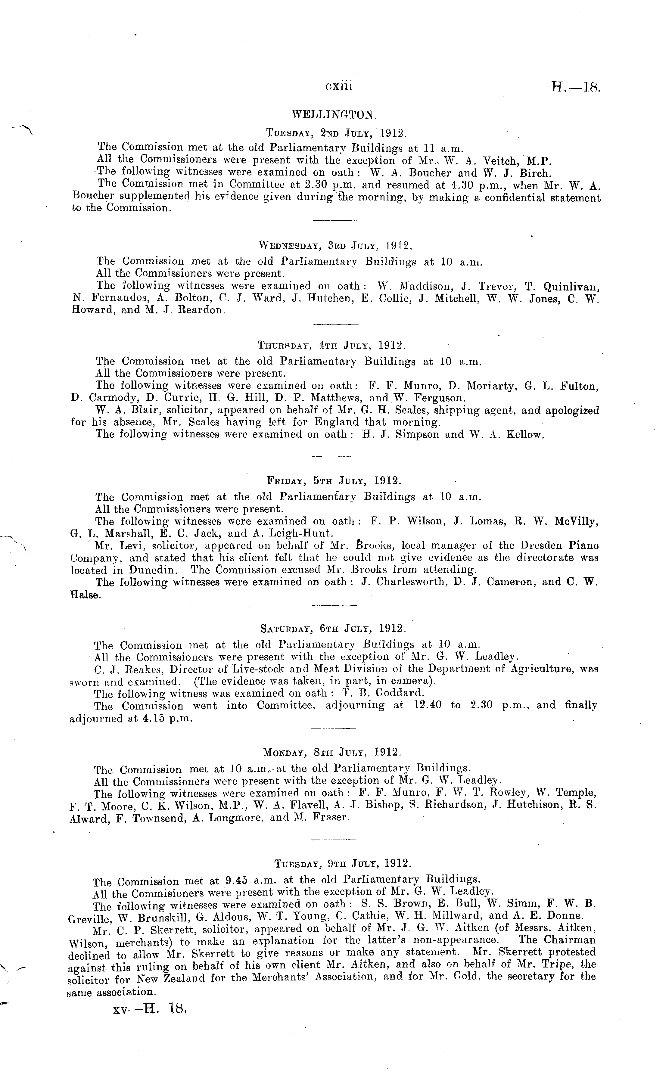 WELLINGTON. Tuesday, 2nd July, 1912. The Commission met at the old Parliamentary Buildings at 11 a.m. All the Commissioners were present with the exception of Mr.. W. A. Veitch, M.P. The following witnesses were examined on oath : W. A. Boucher and W. J. Birch. The Commission, met in Committee at 2.30 p.m. and resumed at 4.30 p.m., when Mr. W. A. Boucher supplemented his evidence given during the morning, by making a confidential statement to the Commission. Wednesday, 3rd Jcjly, 1.912. The Commission met at the old Parliamentary Buildings at 10 a.m. All the Commissioners were present. The following witnesses were examined on oath : W. Maddison, J. Trevor, T. Quinlivan, N. Fernandos, A. Bolton, C. J. Ward, J. Hutchen, E. Collie, J. Mitchell, W. W. Jones, C. W. Howard, and M. J. Reardon. Thursday, 4th July, 1912. The Commission met at the old Parliamentary Buildings at 10 a.m. All the Commissioners were present. The following witnesses were examined on oath: F. F. Munro, D. Moriarty, G. L. Fulton, D. Carmody, D. Currie, H. G. Hill, D. P. Matthews, and W. Ferguson. W. A. Blair, solicitor, appeared on behalf of Mr. G. H. Scales, shipping agent, and apologized for his absence, Mr. Scales having left for England that morning. The following witnesses were examined on oath : H. J. Simpson and W. A. Kellow. Friday, sth July, 1912. The Commission met at the old Parliamentary Buildings at 10 a.m. All the Commissioners were present. The following witnesses were examined on oath : F. P. Wilson, J. Lomas, R. W. McVilly, G. L. Marshall, E. C. Jack, and A. Leigh-Hunt. Mr. Levi, solicitor, appeared on behalf of Mr. Brooks, local manage) - of the Dresden Piano Company, and stated that his client felt that he could not give evidence as the directorate was located in Dunedin. The Commission excused Mr. Brooks from attending. The following witnesses were examined on oath : J. Charlesworth, D. J. Cameron, and C. W. Halse. Saturday, 6th July, 1912. The Commission met at the old Parliamentary Buildings at 10 a.m. All the Commissioners were present with the exception of Mr. G. W. Leadley. C. J. Reakes, Director of Live-stock and Meat Division of the Department of Agriculture, was sworn and examined. (The evidence was taken, in part, in camera). The following witness was examined on oath : T. B. Goddard. The Commission went into Committee, adjourning at 12.40 to 2.30 p.m., and finally adjourned at 4.15 p.m. Monday, Bth July, 1912. The Commission met at .1.0 a.m.. at the old Parliamentary Buildings. All the Commissioners were present with the exception of Mr. G. W. Leadley. The following witnesses were examined on oath : F. F. Munro, F. W. T. Rowley, W. Temple, F. T. Moore, C. K. Wilson, M.P., W. A. Flavell, A. J. Bishop, S. Richardson, J. Hutchison, R. S. Alward, F. Townsend, A. Longmore, and M. Fraser. Tuesday, 9th July, 1912. The Commission met at 9.45 a.m. at the old Parliamentary Buildings. All the Commisioners were present with the exception of Mr. G. W. Leadley. The following witnesses were examined on oath : S. S. Brown, E. Bull, W. Simm, F. W. B. Greville, W. Brunskill, G. Aldous, W. T. Young, C. Cathie, W. H. Millward, and A. E. Donne. Mr.' C. P. Skerrett, solicitor, appeared on behalf of Mr. J. G. W. Aitken (of Messrs. Aitken, Wilson merchants) to make an explanation for the latter's non-appearance. The Chairman declined to allow Mr. Skerrett to give reasons or make any statement. Mr. Skerrett protested against this ruling on behalf of his own client Mr. Aitken, and also on behalf of Mr. Tripe, the solicitor for New Zealand for the Merchants' Association, and for Mr. Gold, the secretary for the same association.