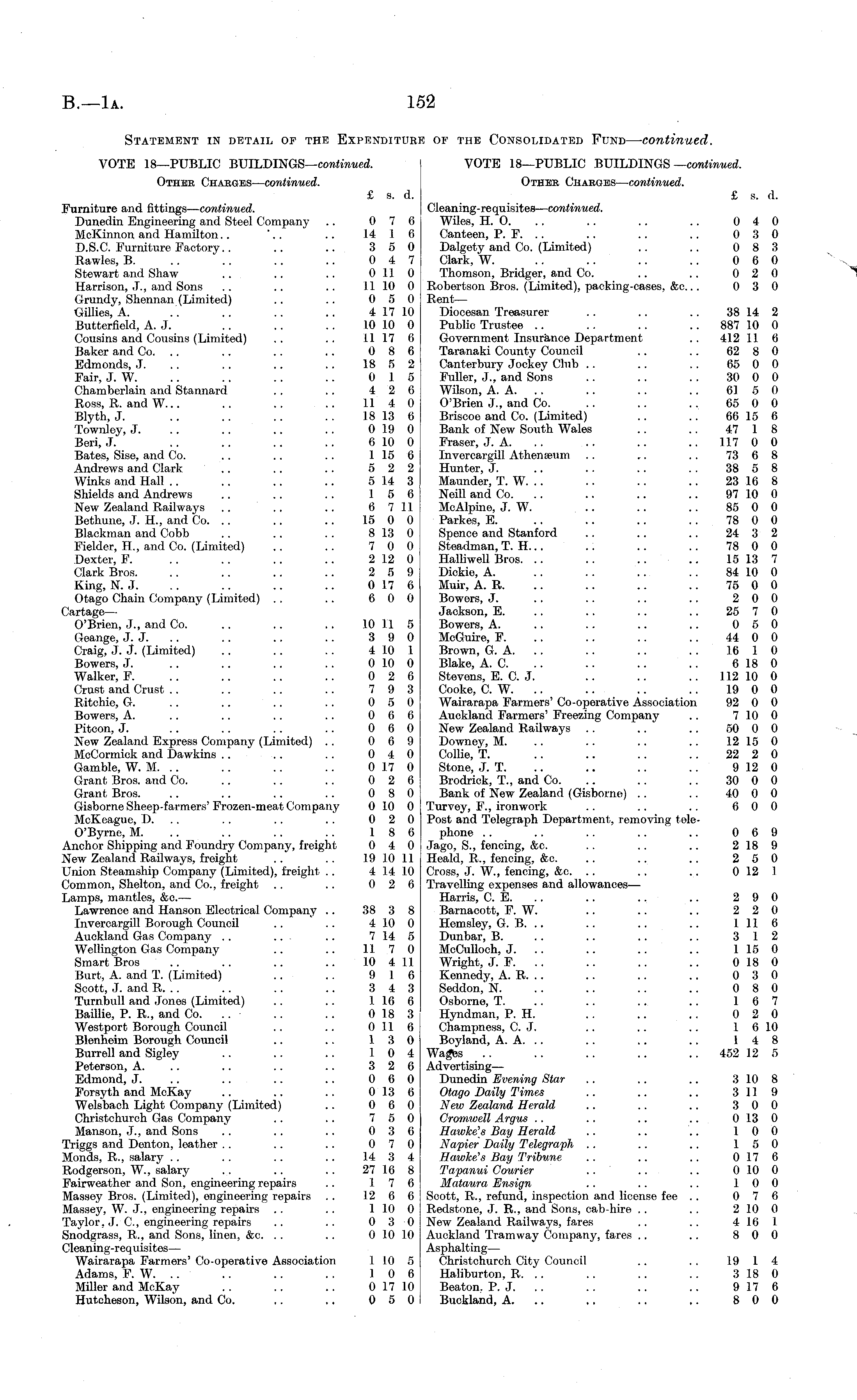 Statement in detail of the Expenditure of the Consolidated Fund— continued. VOTE 18—PUBLIC BUlLDlNGS— continued. VOTE 18—PUBLIC BUILDINGS —continued. Other Charges— continued. Other Charges— continued. £ s. d. £ s. d. Furniture and fittings— continued. Cleaning-requisites— continued. Dunedin Engineering and Steel Company .. 0 7 6 Wilea, H. 0. .. .. .. .. 0 4 0 McKinnon and Hamilton.. ".. .. 14 1 6 Canteen, P. F. .. .. .. .. 0 3 0 D.S.C. Furniture Factory.. .. .. 3 5 0 Dalgety and Co. (Limited) .. .. 0 8 3 Rawles, B. .. .. .. .. 0 4 7 Clark, W. .. . . .. .. 0 6 0 Stewart and Shaw .. .. .. 0 11 0 Thomson, Bridger, and Co. .. .. 0 2 0 Harrison, J., and Sons .. .. .. II 10 0 Robertson Bros. (Limited), packing-cases, &c... 0 3 0 Grundy, Shennan (Limited) .. .. 0 5 0 Rent — Gillies, A. .. .. .. .. 4 17 10 Diocesan Treasurer .. .. .. 38 14 2 Butterfield, A. J. .. .. .. 10 10 0 Public Trustee .. . . .. 887 10 0 Cousins and Cousins (Limited) .. .. 11 17 6 Government Insurance Department .. 412 11 6 Baker and Co. .. .. .. .. 0 8 6 Taranaki County Council .. .. 62 8 0 Edmonds, J. .. .. .. .. 18 5 2 Canterbury Jockey Club .. .. .. 65 0 0 Fair, J. W. .. .. .. .. 0 15 Fuller, J., and Sons .. .. .. 30 0 0 Chamberlain and Stannard .. .. 4 2 6 Wilson, A. A. . . .. .. .. 61 5 0 Ross, R. and W... .. .. .. 11 4 0 O'Brien J., and Co. .. .. .. 65 0 0 Blyth, J. .. .. .. . . 18 13 6 Briseoe and Co. (Limited) .. .. 66 15 6 Townley, J. .. .. .. .. 019 0 Bank of New South Wales . . .. 47 1 8 Beri, J. .. . . .. .. 610 0 Fraser, J. A. .. .. . . 117 0 0 Bates, Sise, and Co. .. .. .. 115 6 Invercargill Athenseum .. .. . . 73 6 8 Andrews and Clark .. .. .. 5 2 2 Hunter, J. .. .. .. . . 38 5 8 Winks and Hall .. .. .. .. 514 3 Maunder, T. W. .. .. .. .. 23 16 8 Shields and Andrews .. .. . . 15 6 Neill and Co. .. .. .. 97 10 0 New Zealand Railways .. .. .. 6 711 McAlpine, J. W. .. .. .. 85 0 0 Bethune, J. H., and Co. .. .. .. 15 0 0 Parkes, E. .. .. .. .. 78 0 0 Blackman and Cobb .. .. .. 813 0 Spence and Stanford .. .. .. 24 3 2 Fielder, H., and Co. (Limited) .. .. 7 0 0 Steadman, T. H... .. .. .. 78 0 0 Dexter, F. .. .. .. .. 212 0 Halliwell Bros. .. .. .. .. 15 13 7 Clark Bros. .. .. .. .. 2 5 9 Dickie, A. .. .. .. .. 84 10 0 King, N. J. .. .. .. .. 017 6 Muir, A. R. .. .. .. .. 75 0 0 Otago Chain Company (Limited) .. .. 6 0 0 Bowers, J. .. .. .. .. 2 0 0 Cartage— Jackson, E. .. .. .. .. 25 7 0 O'Brien, J., and Co. .. .. .. 10 11 5 Bowers, A. .. .. .. .. 0 5 0 Geange, J. J. .. .. .. 3 9 0 McGuire, F. .. .. .. .. 44 0 0 Craig, J. J. (Limited) .. .. .. 410 1 Brown, G. A. .. .. .. .. 16 1 0 Bowers, J. .. .. .. .. 010 0 Blake, A. C. .. .. .. .. 618 0 Walker, F. .. .. .. .. 0 2 6 Stevens, E. C. J. .. .. .. 112 10 0 Crust and Crust .. .. .. .. 7 9 3 Cooke, C. W. .. .. .. .. 19 0 0 Ritchie, G. .. .. .. .. 0 5 0 Wairarapa Farmers' Co-operative Association 92 0 0 Bowers, A. .. .. .. .. 0 6 6 Auckland Farmers' Freezing Company .. 710 0 Pitcon, J. .. .. .. .. 0 6 0 New Zealand Railways .. .. .. 50 0 0 New Zealand Express Company (Limited) .. 0 6 9 Downey, M. .. .. .. .. 12150 McCormick and Dawkins .. .. .. 0 4 0 Collie, T. .. .. .. .. 22 2 0 Gamble, W. M. .. .. .. .. 017 0 Stone, J. T. .. .. .. .. 912 0 Grant Bros, and Co. .. .. .. 0 2 6 Brodrick, T., and Co. .. .. .. 30 0 0 Grant Bros. .. .. .. .. 0 8 0 Bank of New Zealand (Gisborne) .. .. 40 0 0 Gisborne Sheep-farmers' Frozen-meat Company 0 10 0 Turvey, F., ironwork .. .. .. 6 0 0 McKeague, D. .. .. .. .. 0 2 0 Post and Telegraph Department, removing teleO'Byrne, M. .. .. .. .. 18 6 phone .. .. .. .. .. 069 Anchor Shipping and Foundry Company, freight 0 4 0 Jago, S., fencing, &c. .. .. .. 2 18 9 New Zealand Railways, freight .. .. 19 10 11 Heald, R., fencing, &c. .. .. .. 2 S 0 Union Steamship Company (Limited), freight .. 4 14 10 Cross, J. W., fencing, &c. . . .. .. 0 12 1 Common, Shelton, and Co., freight .. .. 0 2 6 Travelling expenses and allowances— Lamps, mantles, &c.— Harris, C. E. .. .. .. .. 2 9 0 Lawrence and Hanson Electrical Company .. 38 3 8 Barnacott, F. W. .. .. .. 2 2 0 Invercargill Borough Council .. . . 410 0 Hemsley, G. 8... .. .. .. 1116 Auckland Gas Company . . ... .. 714 5 Dunbar, B. . . .. .. .. 312 Wellington Gas Company .. .. 11 7 0 McCulloch, J. .. .. .. .. 115 0 Smart Bros .. .. .. .. 10 411 Wright, J. F. .. .. .. .. 018 0 Burt, A. and T. (Limited) .. .. 9 16 Kennedy, A. R. .. .. .. .. 0 3 0 Scott, J. and R. .. .. .. .. 3 4 3 Seddon, N. .. .. .. .. 0 8 0 Turnbull and Jones (Limited) .. .. 116 6 Osborne, T. .. .. .. .. 16 7 Baillie, P. R., and Co. .. .. 018 3 Hyndman, P. H. .. .. .. 0 2 0 Westport Borough Council .. .. 0 11 6 Champness, C. J. .. .. .. I 6 10 Blenheim Borough Council .. .. 13 0 Boyland, A. A. .. .. .. .. 14 8 Burrell and Sigley .. .. .. 10 4 Wages .. .. .. .. 452 12 5 Peterson, A. .. .. .. .. 3 2 6 Advertising— Edmond, J. .. .. .. .. 0 6 0 Dunedin Evening Star .. .. .. 310 8 Forsyth and McKay .. .. .. 0 13 6 Otago Daily Times .. .. .. 3 11 9 Welsbach Light Company (Limited) .. 0 6 0 New Zealand Herald .. .. .. 3 0 0 Christchurch Gas Company .. .. 7 5 0 Cromwell Argus .. .. .. .. 013 0 Manson, J. , and Sons . . . . .. 0 3 6 Hawke's Bay Herald .. .. .. 10 0 Triggs and Denton, leather .. .. .. 07 0 Napier Daily Telegraph .. .. .. 15 0 Monds, R., salary .. . . . . .. 14 3 4 Hawke's Bay Tribune .. .. .. 017 6 Rodgerson, W., salary .. .. . . 27 16 8 Tapanui Courier .. .. .. 010 0 Fairweather and Son, engineering repairs .. 17 6 Mataura Ensign .. .. .. 10 0 Massey Bros. (Limited), engineering repairs .. 12 6 6 Scott, R., refund, inspection and license fee . . 0 7 6 Massey, W. J., engineering repairs .. .. 1 10 0 Redstone, J. R., and Sons, cab-hire .. .. 2 10 0 Taylor, J. C, engineering repairs .. .. 0 3 0 New Zealand Railways, fares .. .. 416 1 Snodgrass, R., and Sons, linen, &c. .. .. 0 10 10 Auckland Tramway Company, fares .. .. 8 0 0 Cleaning-requisites— Asphalting— Wairarapa Farmers' Co-operative Associati
