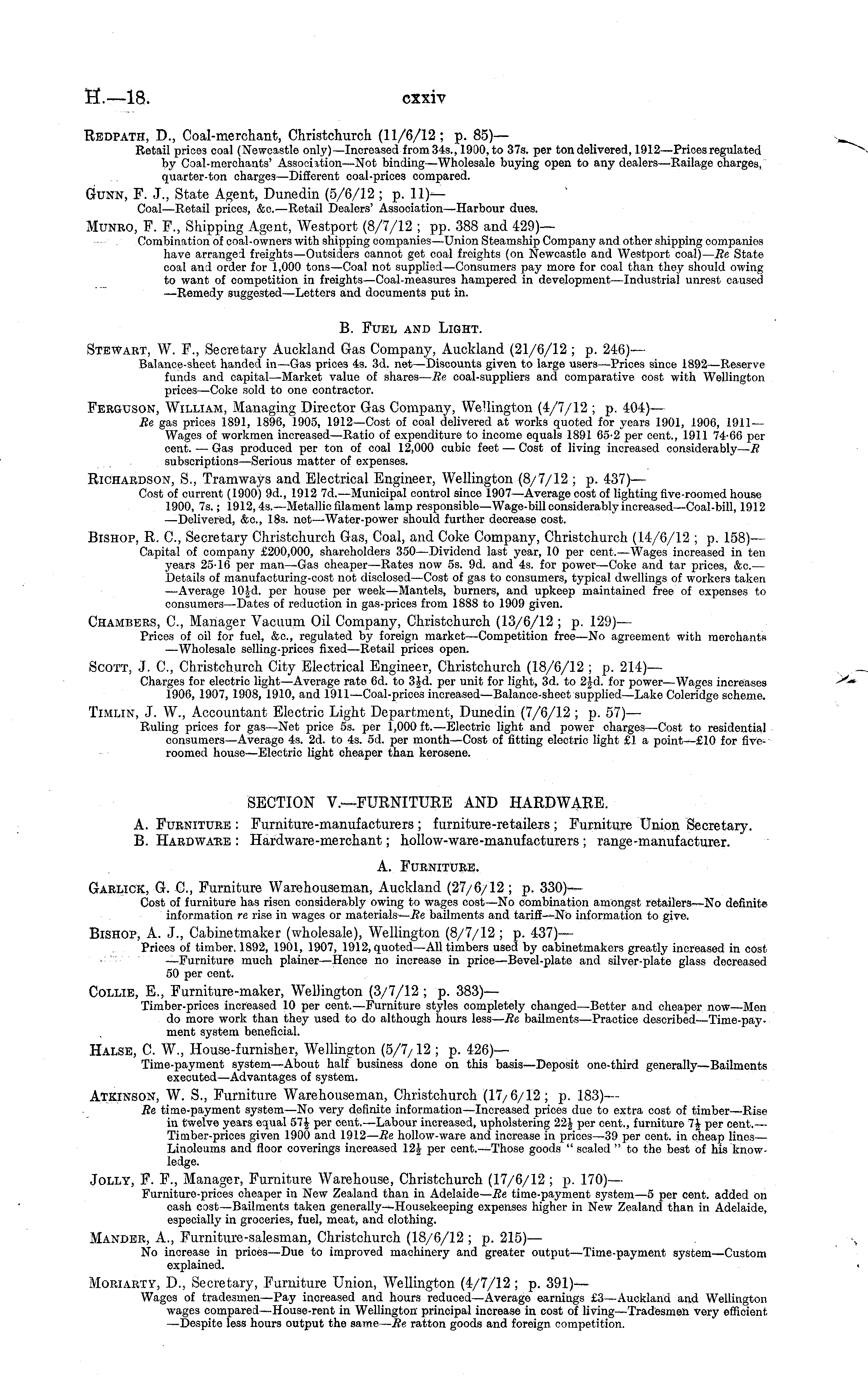 Redpath, D., Coal-merchant, Christchurch (11/6/12 ; p. 85) — Retail prices coal (Newcastle only)—lncreased from 345., 1900, to 375. per ton delivered, 1912—Prices regulated by Coal-merchants' Associxtion—Not binding—Wholesale buying open to any dealers—Railage charges, quarter-ton charges—Different coal-prices compared. Gunn, F. J., State Agent, Dunedin (5/6/12 ; p. 11)— Coal—Retail prices, &c.—Retail Dealers' Association—Harbour dues. Munro, F. F., Shipping Agent, Westport (8/7/12 ; pp. 388 and 429)— Combination of coal-owners with shipping companies—Union Steamship Company and other shipping companies have arranged freights—Outsiders cannot get coal freights (on Newcastle and Westport coal) — Be State coal and order for 1,000 tons—Coal not supplied—Consumers pay more for coal than they should owing to want of competition in freights—Coal-measures hampered in development—lndustrial unrest caused —Remedy suggested—Letters and documents put in. B. Fuel and Light. Stewart, W. F., Secretary Auckland Gas Company, Auckland (21/6/12 ; p. 246) — Balance-sheet handed in—Gas prices 4s. 3d. net —Discounts given to large users—Prices since 1892—Reserve funds and capital—Market value of shares— Re coal-suppliers and comparative cost with Wellington, prices—Coke sold to one contractor. Ferguson, William, Managing Director Gas Company, Wellington (4/7/12 ; p. 404) — Re gas prices 1891, 1896, 1905, 1912—Cost of coal delivered at works quoted for years 1901, 1906, 1911 — Wages of workmen increased—Ratio of expenditure to income equals 1891 65-2 per cent., 1911 74-66 per cent. — Gas produced per ton of coal 12,000 cubic feet — Cost of living increased considerably— B subscriptions —Serious matter of expenses. Richardson, S., Tramways and Electrical Engineer, Wellington (8/7/12 ; p. 437) — Cost of current (1900) 9d., 1912 7d.—Municipal control since 1907—Average cost of lighting five-roomed house 1900, 75.; 1912,4s. —Metallic filament lamp responsible—Wage-bill considerably increased—Coal-bill, 1912 —Delivered, &c, 18s. net—Water-power should further decrease cost. Bishop, R. C, Secretary Christchurch Gas, Coal, and Coke Company, Christchurch (14/6/12 ; p. 158) — Capital of company £200,000, shareholders 350—Dividend last year, 10 per cent.—Wages increased in ten years 25-16 per man—Gas cheaper—Rates now ss. 9d. and 4s. for power —Coke and tar prices, &c.— Details of manufacturing-cost not disclosed—Cost of gas to consumers, typical dwellings of workers taken —Average 10|d. per house per week—Mantels, burners, and upkeep maintained free of expenses to consumers—Dates of reduction in gas-prices from 1888 to 1909 given. Chambers, C, Manager Vacuum Oil Company, Christchurch (13/6/12 ; p. 129) — Prices of oil for fuel, &c., regulated by foreign market—Competition free—No agreement with merchants —Wholesale selling-prices fixed—Retail prices open. Scott, J. C, Christchurch City Electrical Engineer, Christchurch (18/6/12 ; p. 214) — Charges for electric light—Average rate 6d. to 3-|d. per unit for light, 3d. to 2Jd. for power—Wages increases 1906, 1907, 1908, 1910, and 1911—Coal-prices increased—Balance-sheet supplied—Lake Coleridge scheme. Timlin, J. W., Accountant Electric Light Department, Dunedin (7/6/12 ; p. 57) — Ruling prices for gas—Net price ss. per 1,000 ft.—Electric light and power charges—Cost to residential consumers—Average 4s. 2d. to 4s. sd. per month—Cost of fitting electric light £1 a point—£lo for fiveroomed house—Electric light cheaper than kerosene. SECTION V.—FURNITURE AND HARDWARE. A. Furniture : Furniture-manufacturers ; furniture-retailers ; Furniture Union Secretary. B. Hardware : Hardware-merchant; hollow-ware-manufacturers ; range-manufacturer. A. Furniture. Garlick, G. C, Furniture Warehouseman, Auckland (27/6/12 ; p. 330) — Cost of furniture has risen considerably owing to wages cost—No combination amongst retailers—No definite information re rise in wages or materials— Be bailments and tariff—No information to give. Bishop, A. J., Cabinetmaker (wholesale), Wellington (8/7/12; p. 437) — Prices of timber, 1892, 1901, 1907, 1912, quoted—All timbers used by cabinetmakers greatly increased in cost —Furniture much plainer—Hence no increase in price—Bevel-plate and silver-plate glass decreased 50 per cent. Collie, E., Furniture-maker, Wellington (3/7/12 ; p. 383)— Timber-prices increased 10 per cent.—Furniture styles completely changed—Better and cheaper now—Men do more work than they used to do although hours less— Be bailments—Practice described—Time-pay-ment system beneficial. Halse, C. W., House-furnisher, Wellington (5/7/12 ;p. 426)— Time-payment system —About half business done on this basis—Deposit one-third generally—Bailments executed—Advantages of system. Atkinson, W. S., Furniture Warehouseman, Christchurch (17/6/12; p. 183) — Re time-payment system —No very definite information—lncreased prices due to extra cost of timber—Rise in twelve years equal 57J per cent.—Labour increased, upholstering 22J per cent., furniture 7| per cent.— Timber-prices given 1900 and 1912— Re hollow-ware and increase in prices—39 per cent, in cheap lines— Linoleums and floor coverings increased 12J per cent.—Those goods " scaled " to the best of his knowledge. Jolly, F. F., Manager, Furniture Warehouse, Christchurch (17/6/12 ; p. 170)— Furniture-prices cheaper in New Zealand than in Adelaide— Re time-payment system—s per cent, added on cash cost—Bailments taken generally—Housekeeping expenses higher in New Zealand than in Adelaide, especially in groceries, fuel, meat, and clothing. Mander, A., Furniture-salesman, Christchurch (18/6/12 ; p. 215) — No increase in prices—Due to improved machinery and greater output—Time-payment system—Custom explained. Moriarty, D., Secre