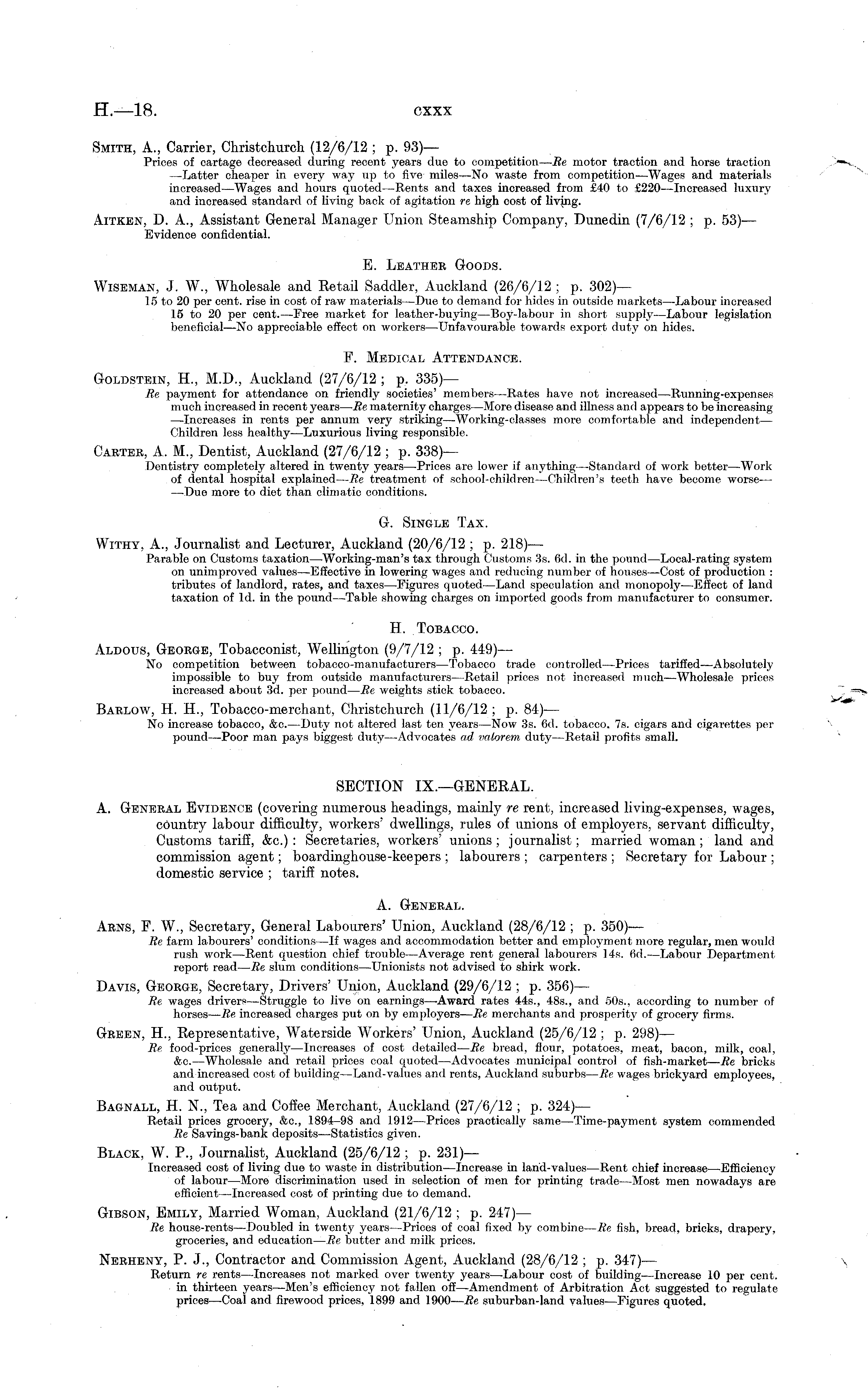 Smith, A., Carrier, Christchurch (12/6/12 ; p. 93) — Prices of cartage decreased during recent years due to competition— Be motor traction and horse traction —Latter cheaper in every way up to five miles—No waste from competition—Wages and materials increased—Wages and hours quoted—Rents and taxes increased from £40 to £220—Increased luxury and increased standard of living back of agitation re high cost of living. Aitken, D. A., Assistant General Manager Union Steamship Company, Dunedin (7/6/12 ; p. 53) — Evidence confidential. E. Leather Goods. Wiseman, J. W., Wholesale and Retail Saddler, Auckland (26/6/12 ; p. 302)— 15 to 20 per cent, rise in cost of raw materials—Due to demand for hides in outside markets—Labour increased 15 to 20 per cent.—Free market for leather-buying—Boy-labour in short supply—Labour legislation beneficial—No appreciable effect on workers —Unfavourable towards export duty on hides. F. Medical Attendance. Goldstein, H., M.D., Auckland (27/6/12 ; p. 335)— Be payment for attendance on friendly societies' members—Rates have not increased—Running-expenses much increased in recent years— Re maternity charges—More disease and illness and appears to be increasing —Increases in rents per annum very striking—Working-classes more comfortable and independent— Children less healthy—Luxurious living responsible. Carter, A. M., Dentist, Auckland (27/6/12 ; p. 338)— Dentistry completely altered in twenty years—Prices are lower if anything—Standard of work better—Work of dental hospital explained— Be treatment of school-children—Children's teeth have become worse— —Due more to diet than climatic conditions. G. Single Tax. Withy, A., Journalist and Lecturer, Auckland (20/6/12 ; p. 218) — Parable on Customs taxation—Working-man's tax through Customs 3s. 6d. in the pound—Local-rating system on unimproved values—Effective in lowering wages and reducing number of nouses—Cost of production : tributes of landlord, rates, and taxes—Figures quoted—Land speculation and monopoly—Effect of land taxation of Id. in the pound—Table showing charges on imported goods from manufacturer to consrrmer. H. Tobacco. Aldous, George, Tobacconist, Wellington (9/7/12 ; p. 449) — No competition between tobacco-manufacturers—Tobacco trade controlled—Prices tariffed—Absolutely impossible to buy from outside manufacturers—Retail prices not increased much—Wholesale prices increased about 3d. per pound— Be weights stick tobacco. Barlow, H. H., Tobacco-merchant, Christchurch (11/6/12 ; p. 84) — No increase tobacco, &c. —Duty not altered last ten years—Now 3s. 6d. tobacco. 7s. cigars and cigarettes per pound—Poor man pays biggest duty—Advocates ad valorem duty—Retail profits small. SECTION IX.—GENERAL. A. General Evidence (covering numerous headings, mainly re rent, increased living-expenses, wages, cbuntry labour difficulty, workers' dwellings, rules of unions of employers, servant difficulty, Customs tariff, &c.) : Secretaries, workers' unions; journalist; married woman; land and commission agent; boardinghouse-keepers ; labourers ; carpenters ; Secretary for Labour ; domestic service ; tariff notes. A. General. Arns, F. W., Secretary, General Labourers' Union, Auckland (28/6/12 ; p. 350)- — Be farm labourers' conditions—lf wages and accommodation better and employment more regular, men would rush work—Rent question chief trouble—Average rent general labourers 14s. 6d.—Labour Department report read— Be slum conditions—Unionists not advised to shirk work. Davis, George, Secretary, Drivers' Union, Auckland (29/6/12 ; p. 356) — Re wages drivers—Struggle to live on earnings—Award rates 445., 485., and 505., according to number of horses— Re increased charges put on by employers— Re merchants and prosperity of grocery firms. Green, H., Representative, W r aterside Workers' Union, Auckland (25/6/12 ; p. 298) — Re food-prices generally—lncreases of cost detailed— Re bread, flour, potatoes, meat, bacon, milk, coal, &c.—Wholesale and retail prices coal quoted—Advocates municipal control of fish-market— Re bricks and increased cost of building—Land-values and rents, Auckland suburbs— Re wages brickyard employees, and output. Bagnall, H. N., Tea and Coffee Merchant, Auckland (27/6/12 ; p. 324)— Retail prices grocery, &c, 1894-98 and 1912—Prices practically same—Time-payment system commended Re Savings-bank deposits—Statistics given. Black, W. P., Journalist, Auckland (25/6/12 ; p. 231)— Increased cost of living due to waste in distribution—lncrease in land-values—Rent chief increase—Efficiency of labour—More discrimination used in selection of men for printing trade—Most men nowadays are efficient—lncreased cost of printing due to demand. Gibson, Emily, Married Woman, Auckland (21/6/12 ; p. 247) — Be house-rents—Doubled in twenty years—Prices of coal fixed by combine— Be fish, bread, bricks, drapery, groceries, and education— Be butter and milk prices. Nerheny, P. J., Contractor and Commission Agent, Auckland (28/6/12 ; p. 347) — Return re rents—lncreases not marked over twenty years—Labour cost of building—lncrease 10 per cent, in thirteen years—Men's efficiency not fallen off—Amendment of Arbitration Act suggested to regulate prices—Coal and firewood prices, 1899 and 1900— Be suburban-land values—Figures quoted.