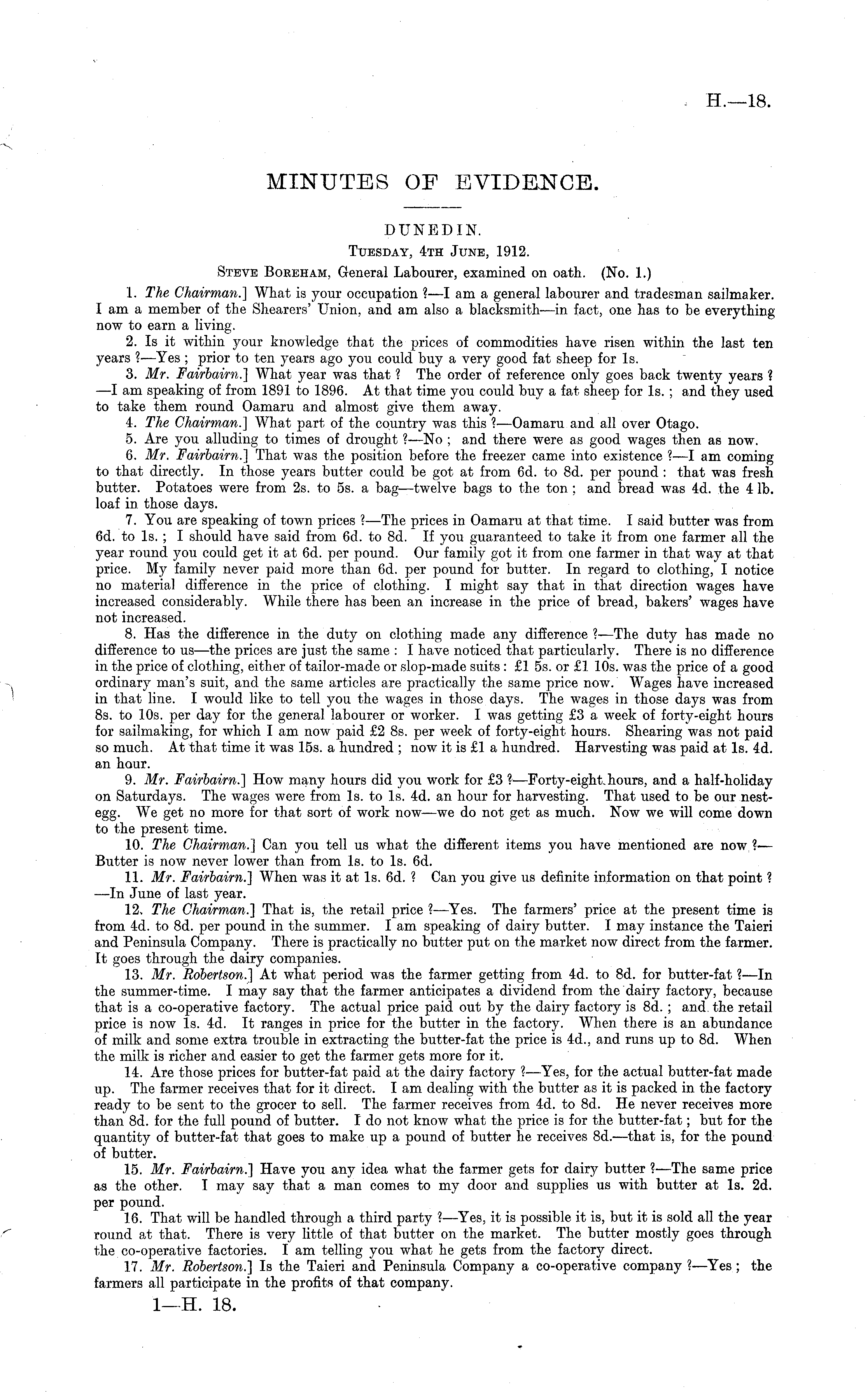 DUNEDIN. Tuesday, 4th June, 1912. Steve Boreham, General Labourer, examined on oath. (No. 1.) 1. The Chairman.] What is your occupation ?—I am a general labourer and tradesman sailmaker. lam a member of the Shearers' Union, and am also a blacksmith-—in fact, one has to he everything now to earn a living. 2. Is it within your knowledge that the prices of commodities have risen within the last ten years ? —Yes; prior to ten years ago you could buy a very good fat sheep for Is. 3. Mr. Fairbairn.] What year was that ? The order of reference only goes back twenty years ? —I am speaking of from 1891 to 1896. At that time you could buy a fat sheep for Is. ; and they used to take them round Oamaru and almost give them away. 4. The Chairman.] What part of the country was this ?—Oamaru and all over Otago. 5. Are you alluding to times of drought ? —No : and there were as good wages then as now. 6. Mr. Fairbairn.] That was the position before the freezer came into existence ?—I am coming to that directly. In those years butter could be got at from 6d. to Bd. per pound : that was fresh butter. Potatoes were from 2s. to ss. a bag—twelve bags to the ton; and bread was 4d. the 4 lb. loaf in those days. 7. You are speaking of town prices ?—The prices in Oamaru at that time. I said butter was from 6d. to Is. ; I should have said from 6d. to Bd. If you guaranteed to take it from one farmer all the year round you could get it at 6d. per pound. Our family got it from one farmer in that way at that price. My family never paid more than 6d. per pound for butter. In regard to clothing, I notice no material difference in the price of clothing. I might say that in that direction wages have increased considerably. While there has been an increase in the price of bread, bakers' wages have not increased. 8. Has the difference in the duty on clothing made any difference ?—The duty has made no difference to vs —the prices are just the same : I have noticed that particularly. There is no difference in the price of clothing, either of tailor-made or slop-made suits : £1 ss. or £1 10s. was the price of a good ordinary man's suit, and the same articles are practically the same price now. Wages have increased in that line. I would like to tell you the wages in those days. The wages in those days was from Bs. to 10s. per day for the general labourer or worker. I was getting £3 a week of forty-eight hours for sailmaking, for which lam now paid £2 Bs. per week of forty-eight hours. Shearing was not paid so much. At that time it was 15s. a hundred ; now it is £1 a hundred. Harvesting was paid at Is. 4d. an hour. 9. Mr. Fairbairn.] How many hours did you work for £3 ?■—Forty-eight, hours, and a half-holiday on Saturdays. The wages were from Is. to Is. 4d. an hour for harvesting. That used to be our nestegg. We get no more for that sort of work now —we do not get as much. Now we will come down to the present time. 10. The Chairman.] Can you tell us what the different items you have mentioned are now ?— Butter is now never lower than from Is. to Is. 6d. 11. Mr. Fairbairn.] When was it at Is. 6d. ? Can you give us definite information on that point ? —In June of last year. 12. The Chairman.] That is, the retail price ? —Yes. The farmers' price at the present time is from 4d. to Bd. per pound in the summer. lam speaking of dairy butter. I may instance the Taieri and Peninsula Company. There is practically no butter put on the market now direct from the farmer. It goes through the dairy companies. 13. Mr. Robertson.] At what period was the farmer getting from 4d. to Bd. for butter-fat ? —ln the summer-time. I may say that the farmer anticipates a dividend from the dairy factory, because that is a co-operative factory. The actual price paid out by the dairy factory is Bd. ; and. the retail price is now Is. 4d. It ranges in price for the butter in the factory. When there is an abundance of milk and some extra trouble in extracting the butter-fat the price is 4d., and runs up to Bd. When the milk is richer and easier to get the farmer gets more for it. 14. Are those prices for butter-fat paid at the dairy factory ?—Yes, for the actual butter-fat made up. The farmer receives that for it direct. lam dealing with the butter as it is packed in the factory ready to be sent to the grocer to sell. The farmer receives from 4d. to Bd. He never receives more than Bd. for the full pound of butter. Ido not know what the price is for the butter-fat; but for the quantity of butter-fat that goes to make up a pound of butter he receives Bd.—that is, for the pound of butter. 15. Mr. Fairbairn.] Have you any idea what the farmer gets for dairy butter ? —The same price as the other. I may say that a man comes to my door and supplies us with butter at Is. 2d. per pound. 16. That will be handled through a third party ?—Yes, it is possible it is, but it is sold all the year round at that. There is very little of that butter on the market. The butter mostly goes through the co-operative factories. I am telling you what he gets from the factory direct. 17. Mr. Robertson.] Is the Taieri and Peninsula Company a co-operative company ?—Yes; the farmers all participate in the profits of that company.