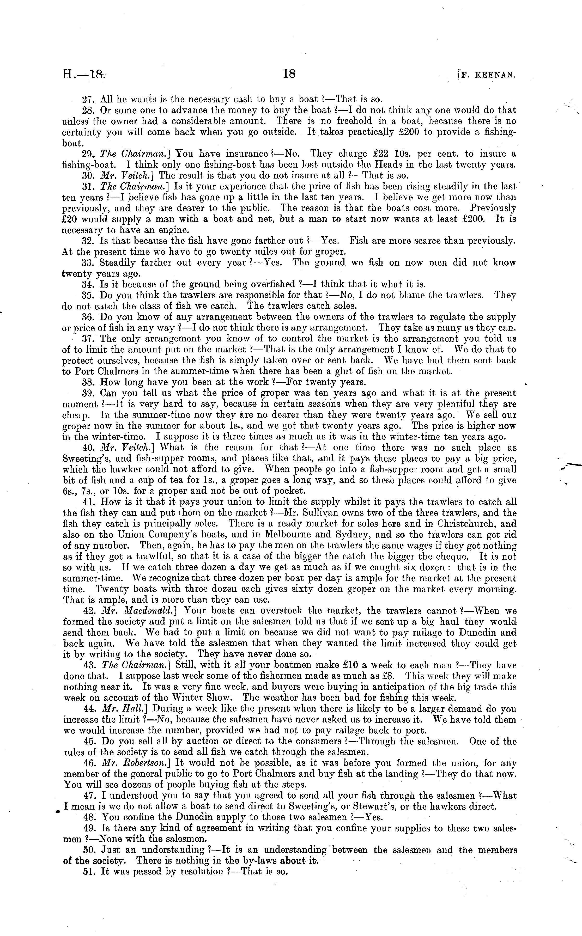 27. All he wants is the necessary cash to buy a boat ? —That is so. 28. Or some one to advance the money to buy the boat I —l do not think any one would do that unless the owner had a considerable amount. There is no freehold in a boat, because there is no, certainty you will come back when you go outside. It takes practically £200 to provide a fishingboat. 29. The Chairman.] You have insurance ?—No. They charge £22 10s. per cent, to insure a fishing-boat. I think only one fishing-boat has been lost outside the Heads in the last twenty years. 30. Mr. Veitch.] The result is that you do not insure at all ?—That is so. 31. The Chairman.] Is it your experience that the price of fish has been rising steadily in the last ten years ?—I believe fish has gone up a little in the last ten years. I believe we get more now than previously, and they are dearer to the public. The reason is that the boats cost more. Previously £20 would supply a man with a boat and net, but a man to start now wants at least £200. It is necessary to have an engine. 32. Is that because the fish have gone farther out ? —Yes. Fish are more scarce than previously. At the present time we have to go twenty miles out for groper. 33. Steadily farther out every year ?—Yes. The ground we fish on now men did not know twenty years ago. 34. Is it because of the ground being overfished ?—I think that it what it is. 35. Do you think the trawlers are responsible for that ?—No, Ido not blame the trawlers. They do not catch the class of fish we catch. The trawlers catch soles. 36. Do you know of any arrangement between the owners of the trawlers to regulate the supply or price of fish in any way ? —I do not think there is any arrangement. They take as many as they can. 37. The only arrangement you know of to control the market is the arrangement you told us of to limit the amount put on the market ? —That is the only arrangement I know of. We do that to protect ourselves, because the fish is simply taken over or sent back. We have had them sent back to Port Chalmers in the summer-time when there has been a glut of fish on the market. 38. How long have you been at the work ? —For twenty years. 39. Can you tell us what the price of groper was ten years ago and what it is at the present moment ?—lt is very hard to say, because in certain seasons when they are very plentiful they are cheap. In the summer-time now the)'' are no dearer than they were twenty years ago. We sell our groper now in the summer for about Is., and we got that twenty years ago. The price is higher now in the winter-time. I suppose it is three times as much as it was in the winter-time ten years ago. 40. Mr. Veitch.] What is the reason for that ?—At one time there was no such place as Sweeting's, and fish-supper rooms, and places like that, and it pays these places to pay a big price, which the hawker could not afford to give. When people go into a fish-supper room and get a small bit of fish and a cup of tea for Is., a groper goes a long way, and so these places could afford to give 65., 75., or 10s. for a groper and not be out of pocket. 41. How is it that it pays your union to limit the supply whilst it pays the trawlers to catch all the fish they can and put i hem on the market ? —Mr. Sullivan owns two of the three trawlers, and the fish they catch is principally soles. There is a ready market for soles here and in Christchurch, and also on the Union Company's boats, and in Melbourne and Sydney, and so the trawlers can get rid of any number. Then, again, he has to pay the men on the trawlers the same wages if they get nothing as if they got a trawlful, so that it is a case of the bigger the catch the bigger the cheque. It is not so with us. If we catch three dozen a day we get as much as if we caught six dozen : that is in the summer-time. We recognize that three dozen per boat per day is ample for the market at the present time. Twenty boats with three dozen each gives sixty dozen groper on the market every morning. That is ample, and is more than they can use. 42. Mr. Macdonald.] Your boats can overstock the market, the trawlers cannot ?—When we formed the society and put a limit on the salesmen told us that if we sent up a big haul they would send them back. We had to put a limit on because we did not want to pay railage to Dunedin and back again. We have told the salesmen that when they wanted the limit increased they could get it by writing to the society. They have never done so. 43. The Chairman.] Still, with it all your boatmen make £10 a week to each man ?—They have done that. I suppose last week some of the fishermen made as much as £8. This week they will make nothing near it. It was a very fine week, and buyers were buying in anticipation of the big trade this week on account of the Winter Show. The weather has been bad for fishing this week. 44. Mr. Hall.] During a week like the present when there is likely to be a larger demand do you increase the limit ?—No, because the salesmen have never asked us to increase it. We have told them we would increase the number, provided we had not to pay railage back to port. 45. Do you sell all by auction or direct to the consumers ? —Through the salesmen. One of the rules of the society is to send all fish we catch through the salesmen. 46. Mr. Robertson.] It would not be possible, as it was before you formed the union, for any member of the general public to go to Port Chalmers and buy fish at the landing ?—They do that now. You will see dozens of people buying fish at the steps. 47. I understood you to say that you agreed to send all your fish through the salesmen ?—What I mean is we do not allow a boat to send direct to Sweeting's, or Stewart's, or the hawkers direct. 48. You confine the Dunedin supply to those two salesmen ? —Yes. 49. Is there any kind of agreement in writing that you confine your supplies to these two salesmen ? —None with the salesmen. 50. Jus
