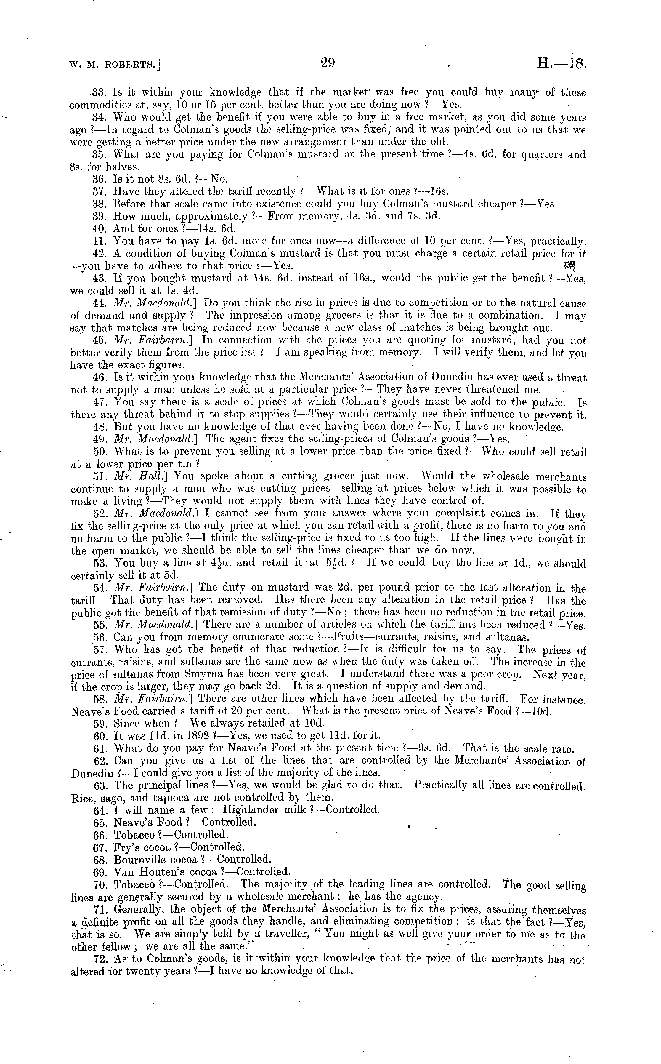 33. Is it within your knowledge that if the market' was free you could buy many of these commodities at, say, 10 or 15 per cent, better than you are doing now ? —Yes. 34. Who would get the benefit if you were able to buy in a free market, as you did some years ago ? —ln regard to Colman's goods the selling-price was fixed, and it was pointed out to us that we were getting a better price under the new arrangement than under the old. 35. What are you paying for Colman's mustard at the present time ?—4s. 6d. for quarters and Bs. for halves. 36. Is it not Bs. 6d. ?—No. 37. Have they altered the tariff recently ? What is it for ones ?—l6s. 38. Before that scale came into existence could you buy Colman's mustard cheaper ?—Yes. 39. How much, approximately ? —From memory, 4s. 3d. and 7s. 3d. 40. And for ones ?—l4s. 6d. 41. You have to pay Is. 6d. more for ones now—a difference of 10 per cent, i —Yes, practically. 42. A condition of buying Colman's mustard is that you must charge a certain retail price for it —you have to adhere to that price ?—Yes. Kl| 43. If you bought mustard at 14s. 6d. instead of 165., would the public get the benefit ?—Yes, we could sell it at Is. 4d. 44. Mr. Macdonald.] Do you think the rise in prices is due to competition or to the natural cause of demand and supply ? —The impression among grocers is that it is due to a combination. I may say that matches are being reduced, now because a new class of matches is being brought out. 45. Mr. Fairbairn.] In connection with the prices you are quoting for mustard, had you not better verify them from the price-list ?-—I am speaking from memory. I will verify them, and let you have the exact figures. 46. Is it within your knowledge that the Merchants' Association of Dunedin has ever used a threat not to supply a man unless he sold at a particular price ?—They have never threatened me. 47. You say there is a scale of prices at which Colman's goods must be sold to the public. Is there any threat behind it to stop supplies ?—They would certainly use their influence to prevent it. 48. But you have no knowledge of that ever having been done ?—No, I have no knowledge. 49. Mr. Macdonald.] The agent fixes the selling-prices of Colman's goods ?—Yes. 50. What is to prevent you selling at a lower price than the price fixed ?—Who could sell retail at a lower price per tin ? 51. Mr. Hall.] You spoke about a cutting grocer just now. Would the wholesale merchants continue to supply a man who was cutting prices—selling at prices below which it was possible to make a living ? —They would not supply them with lines they have control of. 52. Mr. Macdonald.] I cannot see from your answer where your complaint comes in. If they fix the selling-price at the only price at which you can retail with a profit, there is no harm to you and no harm to the public ?—I think the selling-price is fixed to us too high. If the lines were bought in the open market, we should be able to sell the lines cheaper than we do now. 53. You buy a line at 4|d. and retail it at s|d. ?—lf we could buy the line at 4d., we should certainly sell it at sd. 54. Mr. Fairbairn.] The duty on mustard was 2d. per pound prior to the last alteration in the tariff. That duty has been removed. Has there been, any alteration in the retail price ? Has the public got the benefit of that remission of duty ? —No ; there has been no reduction in the retail price. 55. Mr. Macdonald.] There are a number of articles on which the tariff has been reduced ?—Yes. 56. Can you from memory enumerate some ?—Fruits—currants, raisins, and sultanas. 57. Who has got the benefit of that reduction ?—lt is difficult for us to say. The prices of currants, raisins, and sultanas are the same now as when the duty was taken off. The increase in the price of sultanas from Smyrna has been very great. I understand there was a poor crop. Next year, if the crop is larger, they may go back 2d. It is a question of supply and demand. 58. Mr. Fairbairn.) There are other lines which have been affected by the tariff. For instance, Neave's Food carried a tariff of 20 per cent. What is the present price of Neave's Food ?—lOd. 59. Since when ? —We always retailed, at lOd. 60. It was lid. in 1892 ?—Yes, we used to get lid. for it. 61. What do you pay for Neave's Food at the present time ? —9s. 6d. That is the scale rate. 62. Can you give us a list of the lines that are controlled by the Merchants' Association of Dunedin ?—I could give you a list of the majority of the lines. 63. The principal lines ? —Yes, we would be glad to do that. Practically all lines are controlled. Rice, sago, and tapioca are not controlled by them. 64. I will name a few : Highlander milk ?—Controlled. 65. Neave's Food ?—Controlled. 66. Tobacco ?—Controlled. 67. Fry's cocoa ?—Controlled. 68. Bournville cocoa ? —Controlled. 69. Van Houten's cocoa ? —Controlled. 70. Tobacco? —Controlled. The majority of the leading lines are controlled. The good selling lines are generally secured by a wholesale merchant; he has the agency. 71. Generally, the object of the Merchants' Association is to fix the prices, assuring themselves a definite profit on all the goods they handle, and eliminating competition : is that the fact ?—Yes, that is so. We are simply told by a traveller, " You might as well give your order to me as to the other fellow; we are all the same." -*'"' 72. As to Colman's goods, is it within your knowledge that the price of the merchants has notaltered for twenty years ?—I have no knowledge of that.