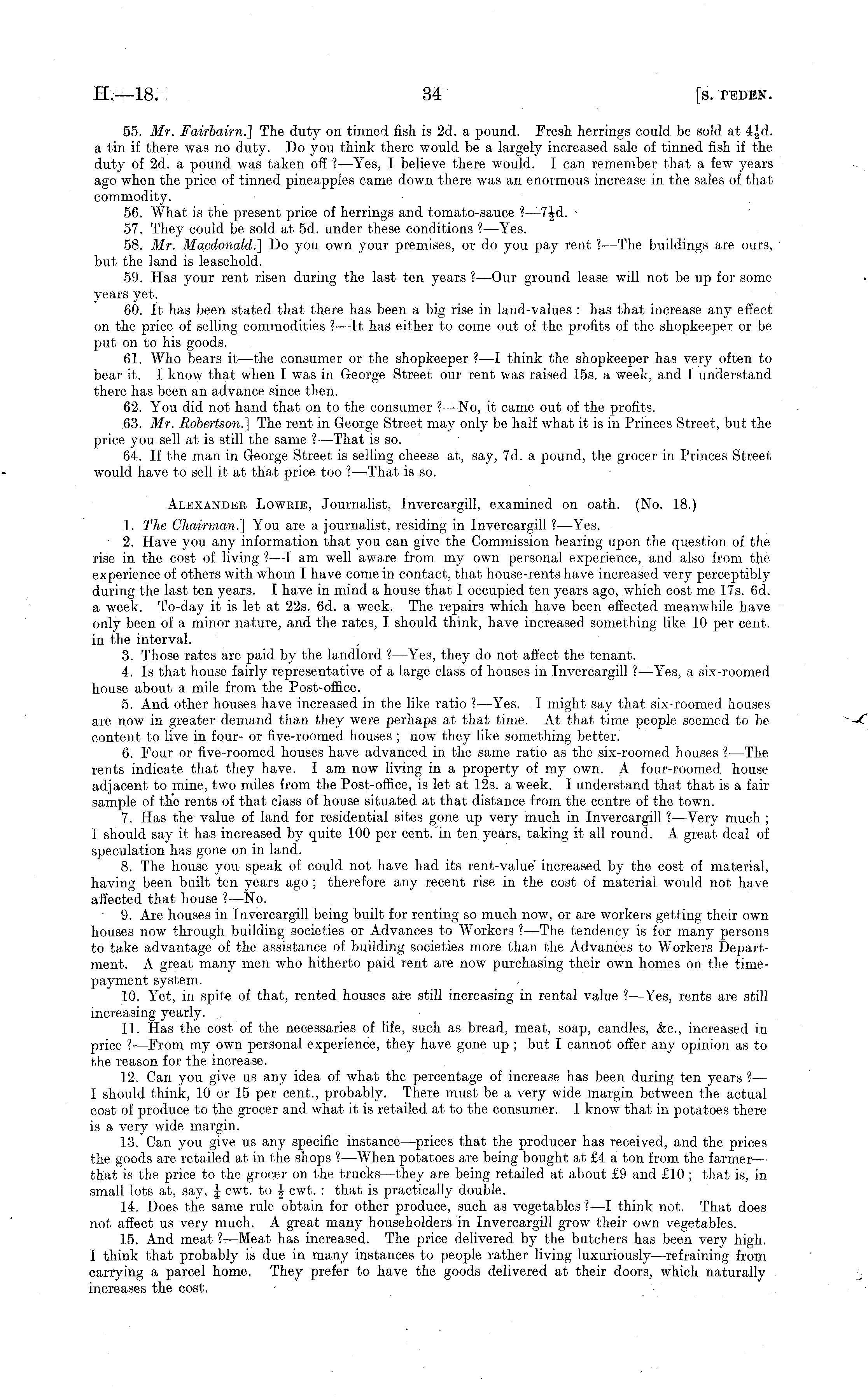 55. Mr. Fairbairn.] The duty on tinned fish is 2d. a pound. Fresh herrings could be sold at 4|d. a tin if there was no duty. Do you think there would be a largely increased sale of tinned fish if the duty of 2d. a pound was taken off ?—Yes, I believe there would. I can remember that a few years ago when the price of tinned pineapples came down there was an enormous increase in the sales of that commodity. 56. What is the present price of herrings and tomato-sauce ?—7|d. - 57. They could be sold at sd. under these conditions ?—Yes. 58. Mr. Macdonald.] Do you own your premises, or do you pay rent ?—The buildings are ours, but the land is leasehold. 59. Has your rent risen during the last ten years ? —Our ground lease will not be up for some years yet. 60. It has been stated that there has been a big rise in land-values : has that increase any effect on the price of selling commodities ?—lt has either to come out of the profits of the shopkeeper or be put on to his goods. 61. Who bears it —the consumer or the shopkeeper ? —I think the shopkeeper has very often to bear it. I know that when I was in George Street our rent was raised 15s. a week, and I understand there has been an advance since then. 62. You did not hand that on to the consumer ? —No, it came out of the profits. 63. Mr. Robertson.] The rent in George Street may only be half what it is in Princes Street, but the price you sell at is still the same ?—That is so. 64. If the man in George Street is selling cheese at, say, 7d. a pound, the grocer in Princes Street would have to sell it at that price too ?—That is so. Alexander Lowrie, Journalist, Invercargill, examined on oath. (No. 18.) 1. The Chairman.] You are a journalist, residing in Invercargill ? —Yes. 2. Have you any information that you can give the Commission bearing upon the question of the rise in the cost of living ? —I am well aware from my own personal experience, and also from the experience of others with whom I have come in contact, that house-rents have increased very perceptibly during the last ten years. I have in mind a house that I occupied ten years ago, which cost me 17s. 6d. a week. To-day it is let at 225. 6d. a week. The repairs which have been effected meanwhile have only been of a minor nature, and the rates, I should think, have increased something like 10 per cent, in the interval. 3. Those rates are paid by the landlord ? —Yes, they do not affect the tenant. 4. Is that house fairly representative of a large class of houses in Invercargill ?—Yes, a six-roomed house about a mile from the Post-office. 5. And other houses have increased in the like ratio ?—Yes. I might say that six-roomed houses are now in greater demand than they were perhaps at that time. At that time people seemed to be content to live in four- or five-roomed houses ; now they like something better. 6. Four or five-roomed houses have advanced in the same ratio as the six-roomed houses ?—The rents indicate that they have. I am now living in a property of my own. A four-roomed house adjacent to mine, two miles from the Post-office, is let at 12s. a week. I understand that that is a fair sample of the rents of that class of house situated at that distance from the centre of the town. 7. Has the value of land for residential sites gone up very much in Invercargill ?—Very much ; I should say it has increased by quite 100 per cent, in ten years, taking it all round. A great deal of speculation has gone on in land. 8. The house you speak of could not have had its rent-value' increased by the cost of material, having been built ten years ago ; therefore any recent rise in the cost of material would not have affected that house ? —No. 9. Are houses in Invercargill being built for renting so much now, or are workers getting their own houses now through building societies or Advances to Workers ? —The tendency is for many persons to take advantage of the assistance of building societies more than the Advances to Workers Department. A great many men who hitherto paid rent are now purchasing their own homes on the timepayment system. 10. Y 7 et, in spite of that, rented houses are still increasing in rental value ?—Yes, rents are still increasing yearly. 11. Has the cost of the necessaries of life, such as bread, meat, soap, candles, &c, increased in price ? —From my own personal experience, they have gone up ; but I cannot offer any opinion as to the reason for the increase. 12. Can you give us any idea of what the percentage of increase has been during ten years ? — I should think, 10 or 15 per cent., probably. There must be a very wide margin between the actual cost of produce to the grocer and what it is retailed at to the consumer. I know that in potatoes there is a very wide margin. 13. Can you give us any specific instance —prices that the producer has received, and the prices the goods are retailed at in the shops ? —When potatoes are being bought at £4 a ton from the farmer — that is the price to the grocer on the trucks—they are being retailed at about £9 and £10 ; that is, in small lots at, say, \ cwt. to \ cwt. : that is practically double. 14. Does the same rule obtain for other produce, such as vegetables ?—I think not. That does not affect us very much. A great many householders in Invercargill grow their own vegetables. 15. And meat ? —Meat has increased. The price delivered by the butchers has been very high. I think that probably is due in many instances to people rather living luxuriously—refraining from carrying a parcel home. They prefer to have the goods delivered at their doors, which naturally increases the cost.