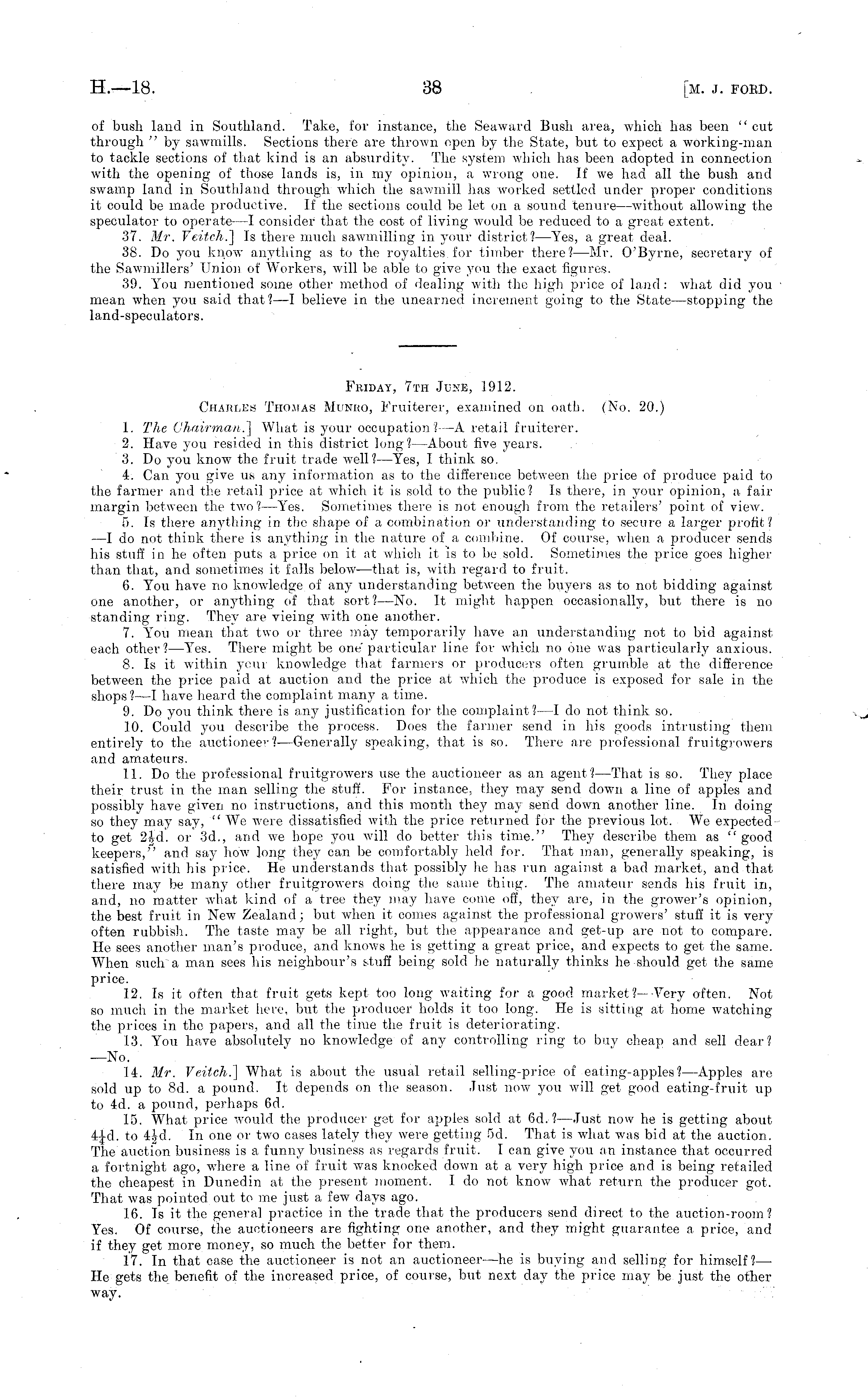 Friday, 7th June, 1912. Charles Thomas Muniio, Fruiterer, examined on oath. (No. 20.) 1. The Chairman.] What is your occupation ?- — k. retail fruiterer. 2. Have you resided in this district long?— About five years. 3. Do you know the fruit trade well? —Yes, I think so. 4. Can you give us any information as to the difference between the price of produce paid to the farmer and the retail price at which it is sold to the public? Is there, in your opinion, a fair margin between the two? —Yes. Sometimes there is not enough from the retailers' point of view. 5. Is there anything in the shape of a combination or understanding to secure a larger profit? —I do not think there is anything in the nature of a combine. Of course, when a producer sends his stuff in he often puts a price on it at which it is to be sold. Sometimes the price goes higher than that, and sometimes it falls below—that is, with regard to fruit. 6. You have no knowledge of any understanding between the buyers as to not bidding against one another, or anything of that sort? —No. It might happen occasionally, but there is no standing ring. They are vicing with one another. 7. You mean that two or three may temporarily have an understanding not to bid against each other? —Yes. There might be one particular line for which no one was particularly anxious. 8. Is it within your knowledge that farmers or producers often grumble at the difference between the price paid at auction and the price at which the produce is exposed for sale in the shops?—l have heard the complaint many a time. 9. Do you think there is any justification for the complaint?—l do not think so. 10. Could you describe the process. Does the farmer send in his goods intrusting them entirely to the auctioneer? —Generally speaking, that is so. There are professional fruitgrowers and amateurs. 11. Do the professional fruitgrowers use the auctioneer as an agent? —That is so. They place their trust in the man selling the stuff. For instance, they may send down a line of apples and possibly have given no instructions, and this month they may send down another line. In doing so they may say, "We were dissatisfied with the price returned for the previous lot. We expected to get 2|d. or 3d., and we hope you will do better tin's time." They describe them as " good keepers," and say how long they can be comfortably held for. That man, generally speaking, is satisfied with his price. He understands that possibly he has run against a bad market, and that there may be many other fruitgrowers doing the same thing. The amateur sends his fruit in, and, no matter what kind of a tree they may have come off, they are, in the grower's opinion, the best fruit in New Zealand; but when it comes against the professional growers' stuff it is very often rubbish. The taste may be all right, but the appearance and get-up are not to compare. He sees another man's produce, and knows he is getting a great price, and expects to get the same. When such a man sees his neighbour's stuff being sold he naturally thinks he should get the same price. 12. Is it often that: fruit gets kept too long waiting for a good market?—-Very often. Not so much in the market here, but the producer holds it too long. He is sitting at home watching the prices in the papers, and all the time the fruit is deteriorating. 13. You have absolutely no knowledge of any controlling ring to buy cheap and sell dear? —No. 14. Mr. Veitch.] What is about the usual retail selling-price of eating-apples?— Apples are sold up to Bd. a pound. It depends on the season. Just now you will get good eating-fruit up to 4d. a pound, perhaps 6d. 15. What price would the producer get for apples sold at 6d. ?—Just now he is getting about 44d. to 4|d. In one or two cases lately they were getting sd. That is what was bid at the auction. The auction business is a funny business as regards fruit. I can give you an instance that occurred a fortnight ago, where a line of fruit was knocked down at a very high price and is being retailed the cheapest in Dunedin at the present moment. I do not know what return the producer got. That was pointed out to me just a few days ago. 16. Is it the general practice in the trade that the producers send direct to the auction-room? Yes. Of course, the auctioneers are fighting one another, and they might guarantee a price, and if they get more money, so much the better for them. 17. In that case the auctioneer is not an auctioneer —he is buying and selling for himself?— He gets the benefit of the increased price, of course, but next day the price may be just the other way.