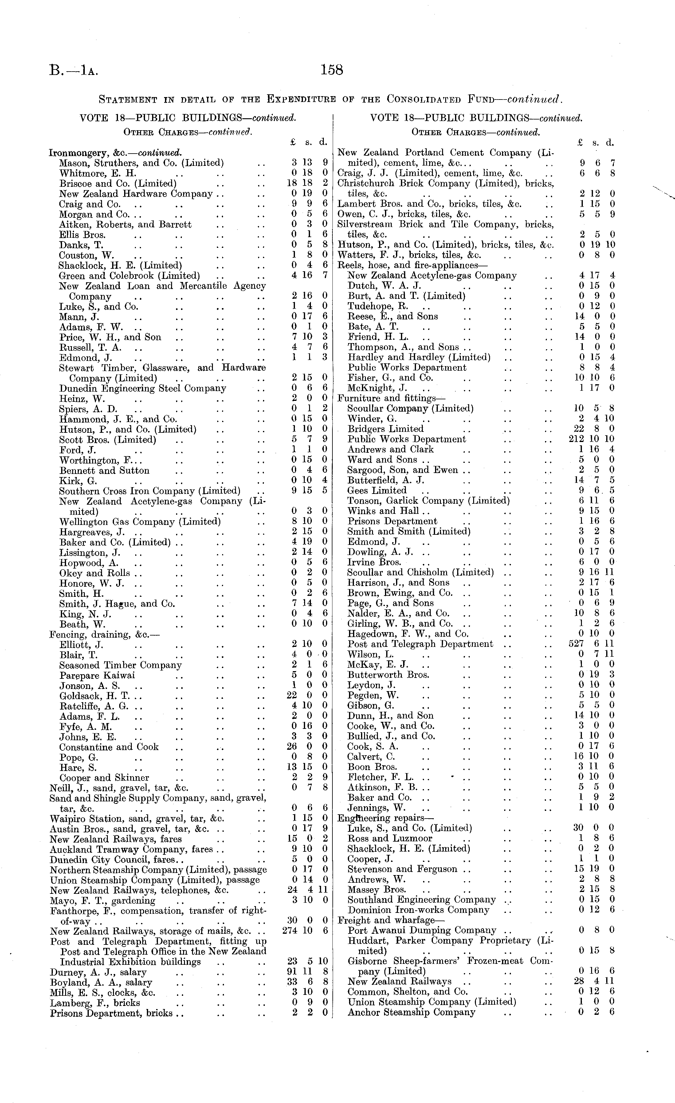 Statement in detail op the Expenditure of the Consolidated Fund— continued. VOTE 18—PUBLIC BUlLDlNGS— continued. VOTE 18—PUBLIC BUlLDlNGS— continued. Other Charges— continued-. Othek Charges— continued. £ s. d. £ s. d. Ironmongery, &c. — continued. New Zealand Portland Cement Company (LiMason, Struthers, and Co. (Limited) .. 313 9 mited), cement, lime, &c... .. .. 9 6 7 Whitmore, E. H. .. .. .. 018 0 Craig, J. J. (Limited), cement, lime, &c. .. 6 6 8 Briscoe and Co. (Limited) .. .. 18 18 2 Christchnrch Brick Company (Limited), bricks, New Zealand Hardware Company .. .. 0 19 0 tiles, &c. .. .. .. .. 2120 Craig and Co. .. .. .. 9 9 6 Lambert Bros, and Co., bricks, tiles, &c. .. 115 0 Morgan and Co. .. .. .. .. 0 5 6 Owen, C. J., bricks, tiles, &c. .. .. 5 5 9 Aitken, Roberts, and Barrett .. .. 0 3 0 Silverstream Brick and Tile Company, bricks, EUis Bros. .. .. .. .. 0 16 tiles, &c. .. .. .. .. 2 5 0 Danks, T. .. .. .. .. 0 5 8 Hutson, P., and Co. (Limited), bricks, tiles, &o. 019 10 Couston, W. .. .. .. . . 18 0 Watters, F. J., bricks, tiles, &c. .. .. 0 8 0 Shacklock, H. E. (Limited) .. .. 0 4 6 Reels, hose, and fire-appliances— Green and Colebrook (Limited) .. .. 4 16 7 New Zealand Acetylene-gas Company . . 4 17 4 New Zealand Loan and Mercantile Agency Dutch, W. A. J. . . .. . . 015 0 Company .. .. .. .. 216 0 Burt, A. and T. (Limited) .. . . 0 9 0 Luke, S., and Co. .. .. .. 14 0 Tudehope, R. .. .. .. .. 012 0 Mann, J. .. .. .. .. 017 6 Reese, E., and Sons .. .. . . 14 0 0 Adams, F. W. .. .. .. .. 0 10 Bate, A. T. .. .. .. .. 5 5 0 Price, W. H., and Son .. .. .. 710 3 Friend, H. L. .. .. .. .. 14 0 0 Russell, T. A. .. .. .. .. 4 7 6 Thompson, A., and Sons .. .. .. 10 0 Edmond, J. .. .. .. .. 113 Hardley and Hardley (Limited) .. .. 015 4 Stewart Timber, Glassware, and Hardware Public Works Department .. . . 8 8 4 Company (Limited) .. .. .. 215 0 Fisher, G., and Co. .. .. .. 10 10 6 Dunedin Engineering Steel Company .. 0 6 6 McKnight, J. .. .. .. 117 0 Heinz, W. .. . . .. ■ • 2 0 0 Furniture and fittings— Spiers, A. D. .. .. .. .. 0 12 Scoullar Company (Limited) .. .. 10 5 8 Hammond, J. E., and Co. .. .. 015 0 Winder, G. .. .. .. .. 2 410 Hutson, P., and Co. (Limited) .. .. 110 0 Bridgers Limited .. .. .. 22 8 0 Scott Bros. (Limited) .. .. .. 5 7 9 Public Works Department .. .. 212 10 10 Ford, J. .. . . .. .. 110 Andrews and Clark .. .. .. 1 16 4 Worthington, F... .. .. .. 015 0 Ward and Sons .. . . .. .. 5 0 0 Bennett and Sutton .. .. .. 0 4 6 Sargood, Son, and Ewen .. .. .. 2 5 0 Kirk, G. .. .. .. .. 010 4 Butterficld, A. J. .. .. .. 14 7 5 Southern Cross Iron Company (Limited) .. 915 5 Gees Limited .. .. .. .. 965 New Zealand Acetylene-gas Company (Li- Tonson, Garlick Company (Limited) .. 6 116 mited) .. " .. .. .. 030 Winks and Hall .. .. .. .. 915 0 Wellington Gas Company (Limited) .. 8 10 0 Prisons Department .. .. .. 1 16 6 Hargreaves, J. .. .. .. .. 215 0 Smith and Smith (Limited) .. .. 3 2 8 Baker and Co. (Limited) .. .. .. 4 19 0 Edmond, J. . . .. .. .. 0 5 6 Lissington, J. .. .. . . .. 214 0 Dowling, A. J. .. . . .. .. 017 0 Hopwood, A. .. .. .. 0 5 6 Irvine Bros. .. .. . . .. 6 0 0 Okey and Rolls .. .. .. .. 0 2 0 Scoullar and Chisholm (Limited) .. .. 916 11 Honore, W. J. .. .. .. .. 0 5 0 Harrison, J., and Sons . . .. .. 2 17 6 Smith, H. .. .. .. .. 0 2 6 Brown, Ewing, and Co. .. .. .. 015 1 Smith, J. Hague, and Co. .. .. 714 0 Page, G., and Sons .. .. .. 0 6 9 King, N. J. .. .. .. .. 0 4 6 Nalder, E. A., and Co. .. .. 10 8 6 Beath, W. .. .. .. .. 010 0 Girling, W. 8., and Co. .. .. . . 12 6 Fencing, draining, &c.— Hagedown, F. W., and Co. .. . . 0 10 0 Elliott, J. .. .. .. .. 210 0 Post and Telegraph Department .. .. 527 611 Blair, T. .. .. .. 4 0 0 Wilson, L. .. .. .. .. 0 7 11 Seasoned Timber Company .. .. 2 16 McKay, E. J. .. .. .. .. 10 0 Parepare Kaiwai .. .. .. 5 0 0 Butterworth Bros. .. .. .. 019 3 Jonson, A. S. .. .. .. .. 10 0 Leydon, J. .. .. .. .. 010 0 Goldsack, H. T. .. .. .. .. 22 0 0 Pegden, W. .. .. .. .. 510 0 Ratcliffe, A. G. .. .. .. .. 410 0 Gibson, G. .. .. .. .. 5 5 0 Adams, F. L. .. .. .. .. 2 0 0 Dunn, H., and Son .. .. . . 14 10 0 Fyfe, A. M. .. .. .. .. 016 0 Cooke, W., and Co. .. .. .. 3 0 0 Johns, E. E. .. .. .. .. 3 3 0 Bullied, J., and Co. .. .. .. 110 0 Constantine and Cook .. .. .. 26 0 0 Cook, S. A. .. .. .. .. 017 6 Pope, G. .. .. .. .. 0 8 0 Calvert, C. .. .. .. .. 16 10 0 Hare, S. .. .. .. .. 13 15 0 Boon Bros. .. .. .. .. 3 11 6 Cooper and Skinner .. .. .. 2 2 9 Fletcher, F. L. .. •.. .. .. 010 0 Neill, J., sand, gravel, tar, &c. .. .. 0 7 8 Atkinson, F. B. .. .. .. .. 5 5 0 Sand and Shingle Supply Company, sand, gravel, Baker and Co. .. .. .. .. 19 2 tar, &c. .. .. .. .. 0 6 6 Jennings, W. .. .. .. .. 110 0 Waipiro Station, sand, gravel, tar, &c. .. 115 0 Engineering repairs— Austin Bros., sand, gravel, tar, &c. .. .. 017 9 Luke, S., and Co. (Limited) .. .. 30 0 0 New Zealand Railways, fares .. .. 15 0 2 Ross and Luzmoor .. .. .. 18 6 Auckland Tramway Company, fares .. .. 910 0 Shacklock, H. E. (Limited) .. .. 0 2 0 Dunedin City Council, fares.. .. .. 5 0 0 Cooper, J. .. .. .. .. 110 Northern Steamship Company (Limited), passage 017 0 Stevenson and Ferguson .. .. .. 15 19 0 Union Steamship Company (Limited), passage 014 0 Andrews, W. .. .. .. . . 2 8 8 New Zealand Railways, telephones, &c. .. 24 411 Massey Bros. .. .. .. .. 215 8 Mayo, F. T., gardening .. .. .. 310 0 Southland Engineering Company .. .. 015 0 Fanthorpe, F., compensation, transfer of right- Dominion Iron-works Company .. . . 012 6 of-way .. .. .. .. .. 30 0 0 Freight and wharfage— New Zealand Railways, storage of mails, &c. . . 274 10 6 Port Awanui Dumping Company .. ~ 0 8 0 Post and Telegraph Department, fitting up Huddart, Parker Company Proprietary (LiPost and Telegraph Office in the New Zealand mited) .. .. .. .. 015 8 Industrial Exhibition buildings .. .. 23 510 Gisborne Sheep-farmers' Frozen-meat ComDurney, A. J., salary .. .. .. 91 1