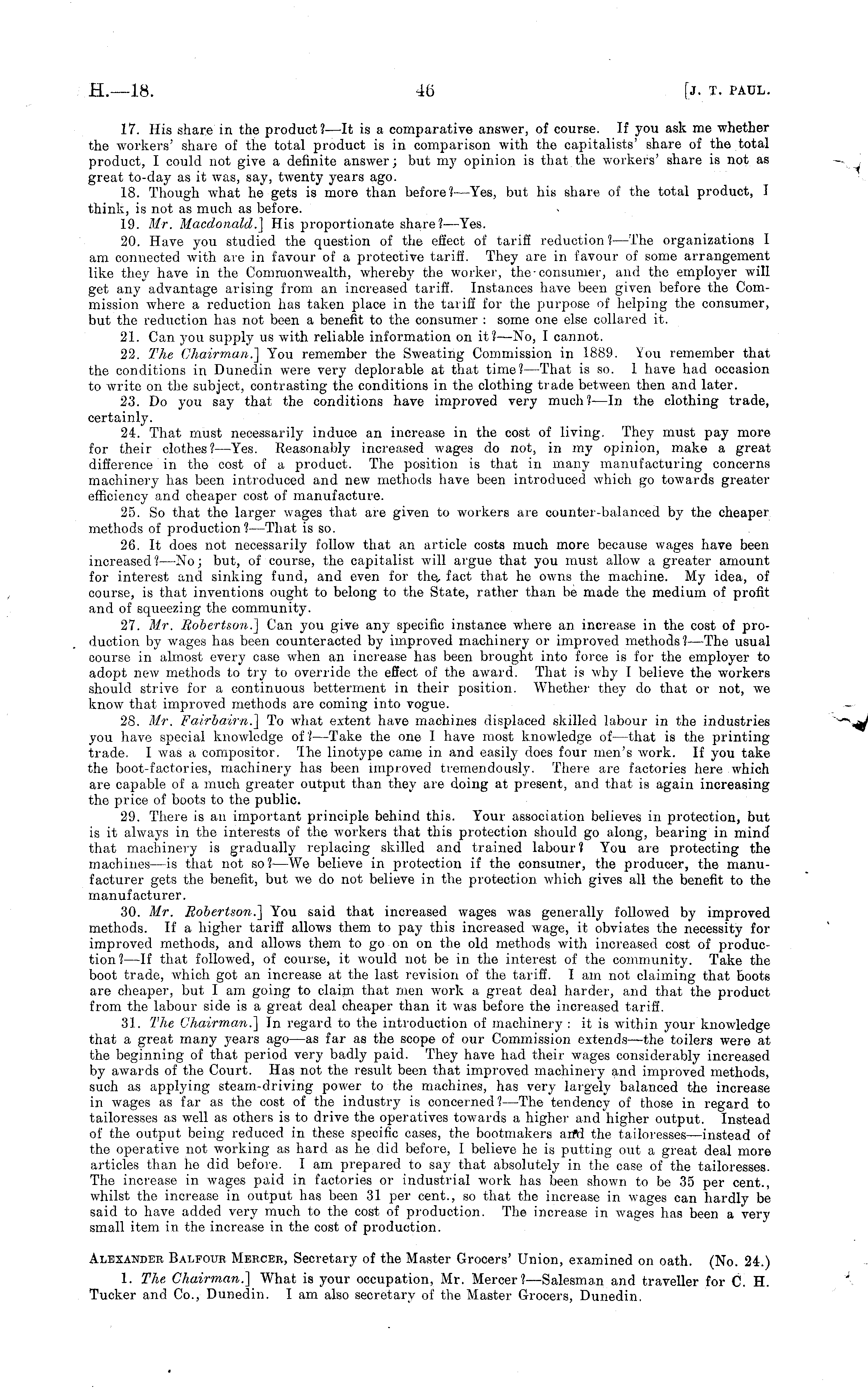 17. His share in the product? —It is a comparative answer, of course. If you ask me whether the workers' share of the total product is in comparison with the capitalists' share of the total product, I could not give a definite answer; but my opinion is that the workers' share is not as great to-day as it was, say, twenty years ago. 18. Though what he gets is more than before?— Yes, but his share of the total product, I think, is not as much as before. 19. Mr. Macdonald.] His proportionate share?— Yes. 20. Have you studied the question of the effect of tariff reduction? —The organizations I am connected with are in favour of a protective tariff. They are in favour of some arrangement like they have in the Commonwealth, whereby the worker, the consumer, and the employer will get any advantage arising from an increased tariff. Instances have been given before the Commission where a reduction has taken place in the tariff for the purpose of helping the consumer, but the reduction has not been a benefit to the consumer : some one else collared it. 21. Can you supply us with reliable information on it? —No, I cannot. 22. The You remember the Sweating Commission in 1889. You remember that the conditions in Dunedin were very deplorable at that time? —That is so. 1 have had occasion to write on the subject, contrasting the conditions in the clothing trade between then and later. 23. Do you say that the conditions have improved very much? —In the clothing trade, certainly. 24. That must necessarily induce an increase in the cost of living. They must pay more for their clothes?— Yes. Reasonably increased wages do not, in my opinion, make a great difference in the cost of a product. The position is that in many manufacturing concerns machinery has been introduced and new methods have been introduced which go towards greater efficiency and cheaper cost of manufacture. 25. So that the larger wages that are given to workers are counter-balanced by the cheaper methods of production?— That is so. 26. It does not necessarily follow that an article costs much more because wages have been increased? —No; but, of course, the capitalist will argue that you must allow a greater amount for interest and sinking fund, and even for the, fact that he owns the machine. My idea, of course, is that inventions ought to belong to the State, rather than be made the medium of profit and of squeezing the community. 27. Mr. Robertson.] Can you give any specific instance where an increase in the cost of production by wages has been counteracted by improved machinery or improved methods ?—The usual course in almost every case when an increase has been brought into force is for the employer to adopt new methods to try to override the effect of the award. That is why I believe the workers should strive for a continuous betterment in their position. Whether they do that or not, we know that improved methods are coming into vogue. 28. Mr. Fairbairn.] To what extent have machines displaced skilled labour in the industries you have special knowledge of? —Take the one I have most knowledge of—that is the printing trade. I was a compositor. The linotype came in and easily does four men's work. If you take the boot-factories, machinery has been improved tremendously. There are factories here which are capable of a much greater output than they are doing at present, and that is again increasing the price of boots to the public. 29. There is an important principle behind this. Your association believes in protection, but is it always in the interests of the workers that this protection should go along, bearing in mind that machinery is gradually replacing skilled and trained labour t You are protecting the machines —is that not so?—We believe in protection if the consumer, the producer, the manufacturer gets the benefit, but we do not believe in the protection which gives all the benefit to the manufacturer. 30. Mr. Robertson.] You said that increased wages was generally followed by improved methods. If a higher tariff allows them to pay this increased wage, it obviates the necessity for improved methods, and allows them to go on on the old methods with increased cost of production? —If that followed, of course, it would not be in the interest of the community. Take the boot trade, which got an increase at the last revision of the tariff. lam not claiming that boots are cheaper, but I am going to claim that men work a great deal harder, and that the product from the labour side is a great deal cheaper than it was before the increased tariff. 31. The Chairman.] In regard to the introduction of machinery : it is within your knowledge that a great many years ago —as far as the scope of our Commission extends —the toilers were at the beginning of that period very badly paid. They have had their wages considerably increased by awards of the Court. Has not the result been that improved machinery and improved methods, such as applying steam-driving power to the machines, has very largely balanced the increase in wages as far as the cost of the industry is concerned ?—The tendency of those in regard to tailoresses as well as others is to drive the operatives towards a higher and higher output. Instead of the output being reduced in these specific cases, the bootmakers aifd the tailoresses —instead of the operative not working as hard as he did before, I believe he is putting out a great deal more articles than he did before. I am prepared to say that absolutely in the case of the tailoresses. The increase in wages paid in factories or industrial work has been shown to be 35 per cent., whilst the increase in output has been 31 per cent., so that the increase in wages can hardly be said to have added very much to the cost of production. The increase in wages has been a very small item in the increase in the cost of production. Alexander Balfour Mercer, Secretary of the Master Grocers' Union, examined on oat
