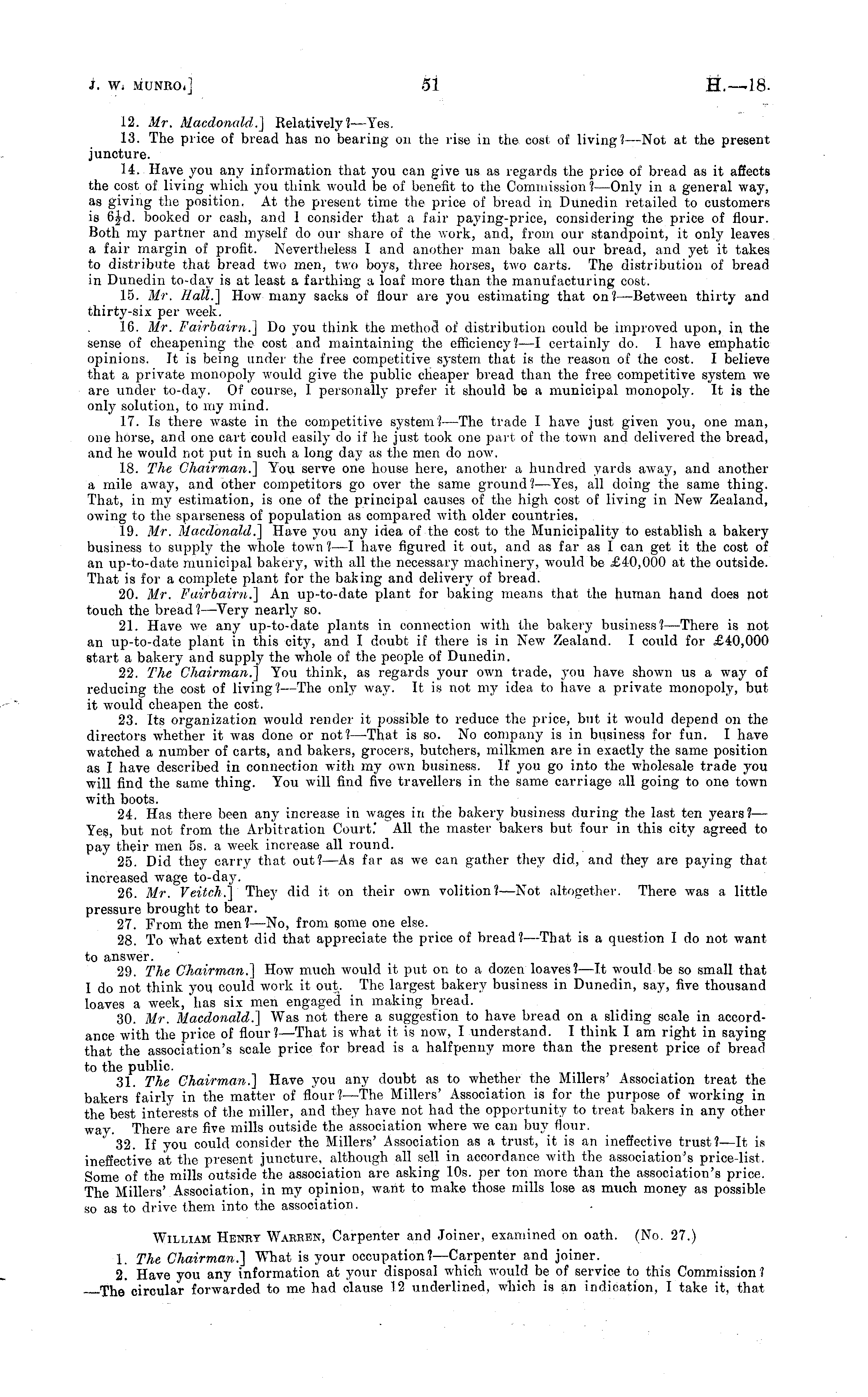 12. Mr. Macdonald.] Relatively?— Yes. 13. The price of bread has no bearing on the rise in the cost of living?— Not at the present juncture. 14. Have you any information that you can give us as regards the price of bread as it affects the cost of living which you think would be of benefit to the Commission? —Only in a general way, as giving the position. At the present time the price of bread in Dunedin retailed to customers is 6Jd. booked or cash, and 1 consider that a fair paying-price, considering the price of flour. Both my partner and myself do our share of the work, and, from our standpoint, it only leaves a fair margin of profit. Nevertheless I and another man bake all our bread, and yet it takes to distribute that bread two men, two boys, three horses, two carts. The distribution of bread in Dunedin to-day is at least a farthing a loaf more than the manufacturing cost. 15. Mr. Hall.] How many sacks of flour are you estimating that on? —Between thirty and thirty-six per week. 16. Mr. Fairbairn.] Do you think the method of distribution could be improved upon, in the sense of cheapening the cost and maintaining the efficiency? —I certainly do. I have emphatic opinions. It is being under the free competitive system that is the reason of the cost. I believe that a private monopoly would give the public cheaper bread than the free competitive system we are under to-day. Of course, I personally prefer it should be a municipal monopoly. It is the only solution, to my mind. 17. Is there waste in the competitive system?—The trade I. have just given you, one man, one horse, and one cart could easily do if he just took one part of the town and delivered the bread, and he would not put in such a long day as the men do now. 18. The Chairman.] You serve one house here, another a hundred yards away, and another a mile away, and other competitors go over the same ground?— Yes, all doing the same thing. That, in my estimation, is one of the principal causes of the high cost of living in New Zealand, owing to the sparseness of population as compared with older countries. 19. Mr. Macdonald.] Have you any idea of the cost to the Municipality to establish a bakery business to supply the whole town ? —I have figured it out, and as far as I can get it the cost of an up-to-date municipal bakery, with all the necessary machinery, would be £40,000 at the outside. That is for a complete plant for the baking and delivery of bread. 20. Mr. Fairbairn.] An up-to-date plant for baking means that the human hand does not touch the bread ?—Very nearly so. 21. Have we any up-to-date plants in connection with the bakery business? —There is not an up-to-date plant in this city, and I doubt if there is in New Zealand. I could for £40,000 start a bakery and supply the whole of the people of Dunedin. 22. The Chairman.] You think, as regards your own trade, 3*oll have shown us a way of reducing the cost of living?—The only way. It is not my idea to have a private monopoly, but it would cheapen the cost. 23. Its organization would render it possible to reduce the price, but it would depend on the directors whether it was done or not? —That is so. No company is in business for fun. I have watched a number of carts, and bakers, grocers, butchers, milkmen are in exactly the same position as I have described in connection with my own business. If you go into the wholesale trade you will find the same thing. You will find five travellers in the same carriage all going to one town with boots. 24. Has there been any increase in wages in the bakery business during the last ten years?— Yes, but not from the Arbitration Court.' All the master bakers but four in this city agreed to pay their men ss. a week increase all round. 25. Did they carry that out? —As far as we can gather they did, and they are paying that increased wage to-day. 26. Mr. Veitch.] They did it on their own volition?— Not altogether. There was a little pressure brought to bear. 27. From the men? —No, from some one else. 28. To what extent did that appreciate the price of bread? —That is a question I do not want to answer. 29. The Chairman.] How much would it put on to a dozen loaves? —It would be so small that Ido not think you could work it out. The largest bakery business in Dunedin, say, five thousand loaves a week, has six men engaged in making bread. 30. Mr. Macdonald.] Was not there a suggestion to have bread on a sliding scale in accordance with the price of flour?— That is what it is now, I understand. I think lam right in saying that the association's scale price for bread is a halfpenny more than the present price of bread to the public. 31. The Chairman.] Have you any doubt as to whether the Millers' Association treat the bakers fairly in the matter of flour? —the Millers' Association is for the purpose of working in the best interests of the miller, and they have not had the opportunity to treat bakers in any otherway. There are five mills outside the association where we can buy flour. 32. If you could consider the Millers' Association as a trust, it is an ineffective trust?—lt is ineffective at the present juncture, although all sell in accordance with the association's price-list. Some of the mills outside the association are asking 10s. per ton more than the association's price. The Millers' Association, in my opinion, want to make those mills lose as much money as possible so as to drive them into the association. William Henry Warren, Carpenter and Joiner, examined on oath. (No. 27.) 1. The Chairman.] "What is your occupation? —Carpenter and joiner. 2. Have you any information at your disposal which would be of service to this Commission? The circular forwarded to me had clause 12 underlined, which is an indication, I take it, that