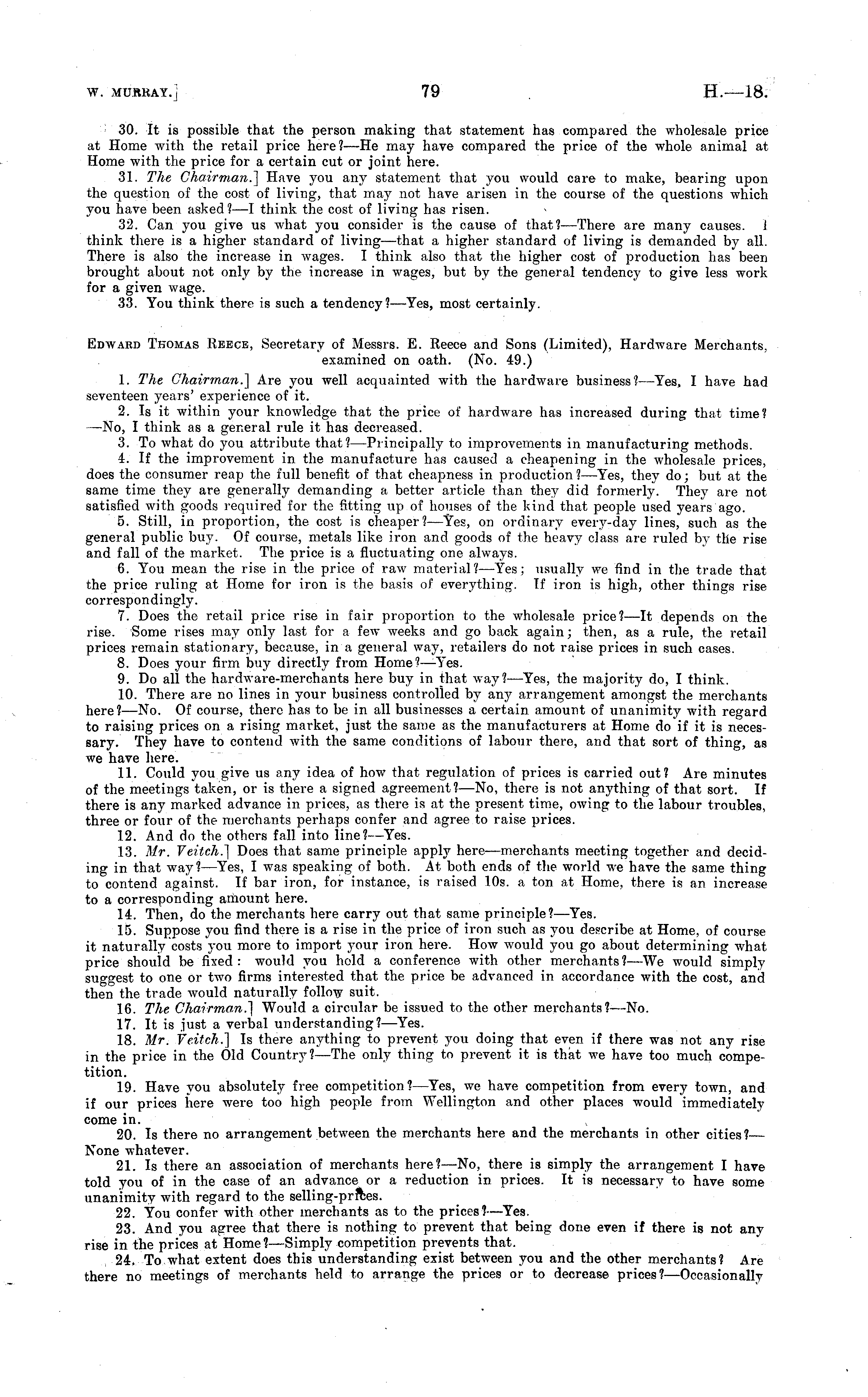 30. It is possible that the person making that statement has compared the wholesale price at Home with the retail price here? —He may have compared the price of the whole animal at Home with the price for a certain cut or joint here. 31. The Chairman.] Have you any statement that you would care to make, bearing upon the question of the cost of living, that may not have arisen in the course of the questions which you have been asked ?—I think the cost of living has risen. 32. Can you give us what you consider is the cause of that? —There are many causes, i think there is a higher standard of living—that a higher standard of living is demanded by all. There is also the increase in wages. I think also that the higher cost of production has been brought about not only by the increase in wages, but by the general tendency to give less work for a given wage. 33. You think there is such a tendency?— Yes, most certainly. Edward Thomas Recce, Secretary of Messrs. E. Recce and Sons (Limited), Hardware Merchants, examined on oath. (No. 49.) 1. The Chairman.] Are you well acquainted with the hardware business? —Yes. I have had seventeen years' experience of it. 2. Is it within your knowledge that the price of hardware has increased during that time? —No, I think as a general rule it has decreased. 3. To what do you attribute that? —Principally to improvements in manufacturing methods. 4. If the improvement in the manufacture has caused a cheapening in the wholesale prices, does the consumer reap the full benefit of that cheapness in production?— Yes, they do; but at the same time they are generally demanding a better article than they did formerly. They are not satisfied with goods required for the fitting up of houses of the kind that people used years ago. 5. Still, in proportion, the cost is cheaper?— Yes, on ordinary every-day lines, such as the general public buy. Of course, metals like iron and goods of the heavy class are ruled by the rise and fall of the market. The price is a fluctuating one always. 6. You mean the rise in the price of raw material?— Yes; usually we find in the trade that the price ruling at Home for iron is the basis of everything. If iron is high, other things rise correspondingly. 7. Does the retail price rise in fair proportion to the wholesale price?—lt depends on the rise. Some rises may only last for a few weeks and go back again; then, as a rule, the retail prices remain stationary, because, in a general way, retailers do not raise prices in such cases. 8. Does your firm buy directly from Home?—-Yes. 9. Do all the hardware-merchants here buy in that way?— Yes, the majority do, I think. 10. There are no lines in your business controlled by any arrangement amongst the merchants here?— No. Of course, there has to be in all businesses a certain amount of unanimity with regard to raising prices on a rising market, just the same as the manufacturers at Home do if it is necessary. They have to contend with the same conditions of labour there, and that sort of thing, as we have here. 11. Could you give us any idea of how that regulation of prices is carried out? Are minutes of the meetings taken, or is there a signed agreement?—No, there is not anything of that sort. If there is any marked advance in prices, as there is at the present time, owing to the labour troubles, three or four of the merchants perhaps confer and agree to raise prices. 12. And do the others fall into line?— Yes. 13. Mr. Veitch.] Does that same principle apply here—merchants meeting together and deciding in that way?— Yes, I was speaking of both. At both ends of the world we have the same thing to contend against. If bar iron, for instance, is raised 10s. a ton at Home, there is an increase to a corresponding amount here. 14. Then, do the merchants here carry out that same principle?— Yes. 15. Suppose you find there is a rise in the price of iron such as you describe at Home, of course it naturally costs you more to import your iron here. How would you go about determining what price should be fixed: would you hold a conference with other merchants? —We would simply suggest to one or two firms interested that the price be advanced in accordance with the cost, and then the trade would naturally follow suit. 16. The Chairman.} Would a circular be issued to the other merchants?— No. 17. It is just a verbal understanding? —Yes. 18. Mr. Veitch.] Is there anything to prevent you doing that even if there was not any rise in the price in the Old Country?—The only thing to prevent it is that we have too much competition. 19. Have you absolutely free competition? —Yes, we have competition from every town, and if our prices here were too high people from Wellington and other places would immediately come in. 20. Is there no arrangement between the merchants here and the merchants in other cities 1 — None whatever. 21. Is there an association of merchants here? —No, there is simply the arrangement I have told you of in the case of an advance or a reduction in prices. It is necessary to have some unanimity with regard to the selling-prffces. 22. You confer with other merchants as to the prices?— Yes. 23. And you agree that there is nothing to prevent that being done even if there is not any rise in the prices at Home? —Simply competition prevents that. 24. To what extent does this understanding exist between you and the other merchants? Are there no meetings of merchants held to arrange the prices or to decrease prices?— Occasionally