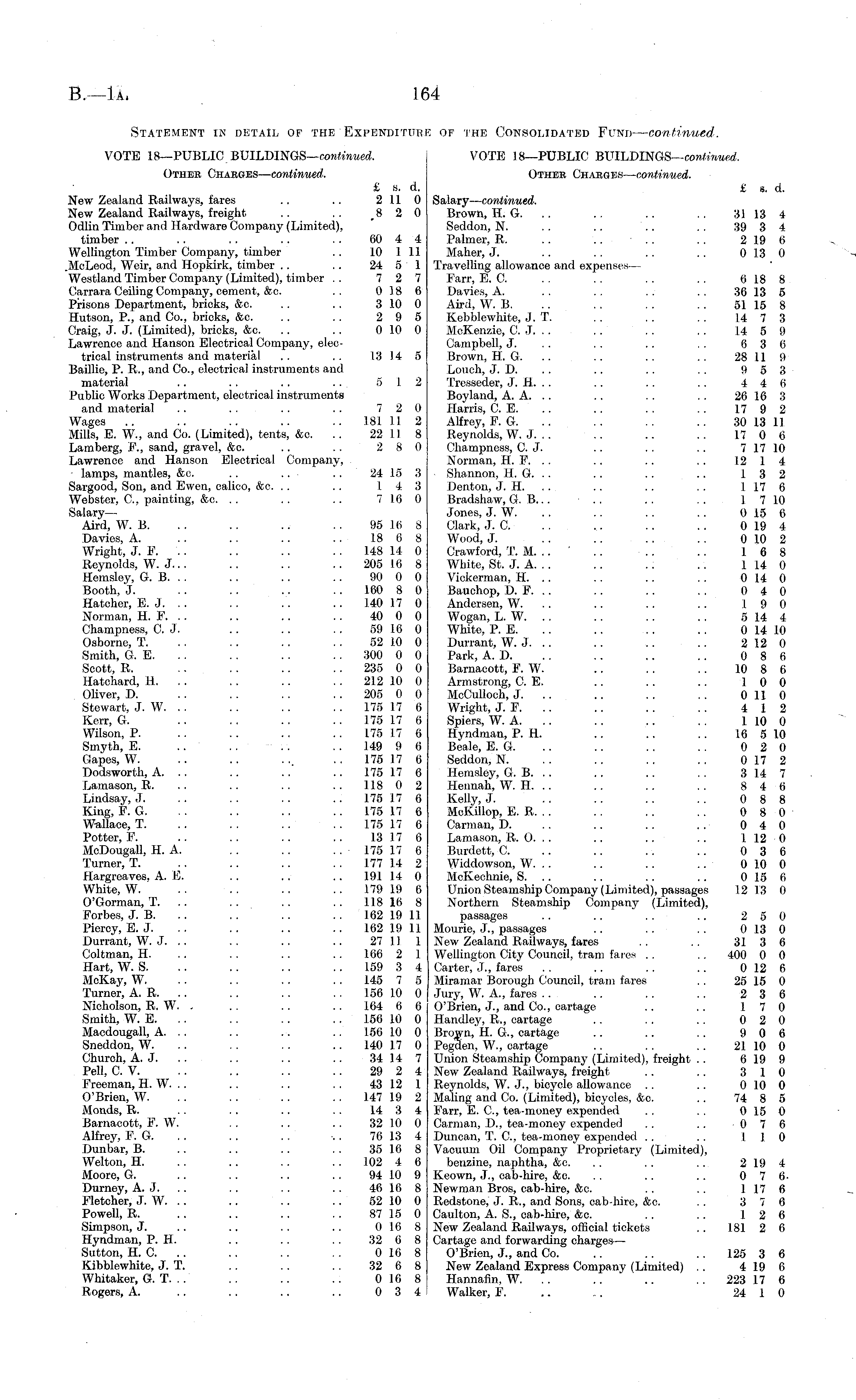 Statement in detail of the Expenditure of the Consolidated Fund — continued. VOTE 18—PUBLIC BUlLDlNGS— continued. VOTE ] B—PUBLIC BUILDINGS— conUwuM. Othek Charges— continued. Other Charges— continued. £ s. d. £ s. d. New Zealand Railways, fares .. .. 2 11 0 Salary— continued. New Zealand Railways, freight .. .. 8 2 0 Brown, H. G. .. .. .. .. 31134 Odlin Timber and Hardware Company (Limited), Seddon, N. .. .. . . .. 39 3 4 timber .. .. . . .. . . 60 4 4 Palmer, R. .. .. .. .. 219 ti Wellington Timber Company, timber .. 10 111 Maher, J. .. .. .. . . 013 0 .MeLeod, Weir, and Hopkirk, timber , . . . 24 5 1 Travelling allowance and expenses — Westland Timber Company (Limited), timber .. 7 2 7 Farr, E. C. .. .. .. .. 6 18 8 Carrara Ceiling Company, cement, &c. .. 0 18 6 Da vies, A. .. .. .. .. 36 13 6 Prisons Department, bricks, &c. .. .. 310 0 Aird, W. B. .. .. . . .. 51 15 8 Hutson, P., and Co., bricks, &c. .. .. 2 9 5 Kebblewhite, J. T. . . . . .. 14 7 3 Craig, J. J. (Limited), bricks, &c. .. .. 0 10 0 McKenzie, C. J. . . .. .. .. 14 5 0 Lawrence and Hanson Electrical Company, elec- Campbell, J. .. .. .. .. 6 3 6 trioal instruments and material .. .. 13 14 5 Brown, H. G. .. .. .. .. 28 11 f> Baillie, P. R., and Co., electrical instruments and Louch, J. D. . . .. .. .. 9 5 3 material .. . . .. . . 5 12 Tresseder, J. H. . . .. .. . . 4 4 6 Public Works Department, electrical instruments Boyland, A. A. .. .. .. .. 26 16 :S and material . . . . . . .. 7 2 0 Harris, C. E. .. .. .. .. 17 9 2 Wages .. .. .. .. .. 181 11 2 Alfrey, F. G. .. .. .. .. 30 13 11 Mills, E. W., and Co. (Limited), tents, &c. .. 22 11 8 Reynolds, W. J. .. .. .. .. 17 0 6 Lamberg, F., sand, gravel, &c. . . . . 2 8 0 Champness, C. J. .. .. .. 717 10 Lawrence and Hanson Electrical Company, Norman, H. F. .. .. .. . . 12 1 4 lamps, mantles, &c. .. .. .. 24 15 3 ■ Shannon, H. G. .. .. .. .. 13 2 Sargood, Son, and Ewen, calico, &c. .. .. 14 3 Denton, J. H. .. . . .. .. 1 17 6 Webster, C, painting, &c. .. .. .. 7 16 0 Bradshaw, G. 8... .. .. .. 1 7 10 Salary— Jones, J. W. .. .. .. .. 0 15 6 Aird, W. B. .. .. .. .. 95 16 8 Clark, J. C. .. .. .. .. 0 19 4 Davies, A. .. . . .. .. 18 6 8 Wood, J. .. .. 010 2 Wright, J. F. .. . . .. .. 148 14 0 Crawford, T. M. .. .. .. . . 16 8 Reynolds, W. J. . . .. .. 205 16 8 White, St. J. A. .. .. .. . . 1 14 0 Hemsley, G. B. . . . . .. . . 90 0 0 Vickerman, H. . . .. . . .. 0 14 0 Booth, J. .. .. .. 160 8 0 Bauchop, D. F. . . . . .. .. 0 4 0 Hatcher, E. J. .. .. .. 140 17 0 Andersen, W. .. .. .. .. 19 0 Norman, H. F. . . .. .. . . 40 0 0 Wogan, L. W. . . .. .. .. 5 14 4 Champness, C. J. .. .. .. 59 16 0 White, P. E. .. .. .. .. 0 14 10 Osborne, T. . . .. .. . . 52 10 0 Durrant, W. J. .. .. .. .. 212 0 Smith, G. E. .. .. . . .. 300 0 0 Park, A. D. . . .. .. .. 0 8 6 Scott, R. .. . . .. 235 0 0 Barnacott, F. W. .. .. . . 10 8 6 Hatchard, H. .. . . .. 212 10 0 Armstrong, C. E. .. .. . . 10 0 Oliver, D. . . . . . . 205 0 0 McCulloch, J. .. .. . . . . 0 110 Stewart, J. W. . . .. . . . . 175 17 6 Wright, J. F. .. .. . . . . 4 12 Kerr, G. .. . . .. . . 175 17 6 Spiers, W. A. .. .. .. . . 1 10 0 Wilson, P. .. .. .. 175 17 6 Hyndman, P. H. .. .. . . 16 510 Smyth, E. .. .. .. 149 9 6 Beale, E. G. .. .. .. . . 0 2 0 Gapes, W. .. .. . . 175 17 6 Seddon, N. .. .. . . .. 017 2 Dodsworth, A. . . .. .. 175 17 6 Hemsley, G. B. . . .. .. . . 314 7 Lamason, R. . . . . . . 118 0 2 Hennah, W. H. .. .. .. .. 8 4 6 Lindsay, J. .. .. .. 175 17 6 Kelly, J. .. .. .. .. 0 8 8 King, F. G. .. .. .. 175 17 6 McKillop, E. R. . . .. .. . . 0 8 0 Wallace, T. .. .. .. 175 17 6 Carman, D. .. .. .. .. 0 4 0 Potter, F. .. .. .. .. 13 17 6 Lamason, R. O. .. .. .. .. 1 12 0 McDougall, H. A. . . .. . . 175 17 6 Burdett, C. .. .. .. .. 0 3 6 Turner, T. . . .. .. 177 14 2 Widdowson, W. . . .. .. .. 010 0 Hargreaves, A. E. .. .. .. 191 14 0 McKechnie, S. . . . . . . .. 015 6 White, W. .. .. .. .. 179 19 6 Union Steamship Company (Limited), passages 12 13 0 O'Gorman, T. .. . . .. .. 118 16 8 Northern Steamship Company (Limited), Forbes, J. B. .. . . . . . . 162 19 11 passages .. .. . . .. 2 5 0 Piercy, E. J. .. .. .. .. 162 19 11 Mourie, J., passages .. .. .. 013 0 Durrant, W. J. .. . . . . .. 27 11 1 New Zealand Railways, fares .. . . 313 6 Colt-man, H. .. . . . . 166 2 1 Wellington City Council, tram fares .. . . 400 0 0 Hart, W. S. .. .. .. 159 3 4 Carter, J., fares .. .. .. .. 012 6 McKay, W. . . . . . . .. 145 7 5 Miramar Borough Council, tram fares . . 25 15 0 Turner, A. R. .. .. . . . . 156 10 0 Jury, W. A., fares .. .. . . .. 2 3 6 Nicholson, R. W. , . . . . 164 6 6 O'Brien, J., and Co., cartage .. .. 17 0 Smith, W. E. . . .. .. .. 156 10 0 Handley, R., cartage .. .. . . 0 2 0 Macdougall, A. .. . . .. .. 156 10 0 Brown, H. G., cartage .. .. . . 9 0 6 Sneddon, W. .. .. . . .. 140 17 0 Pegden, W., cartage . . .. .. 21 10 0 Church, A. J. . . . . .. 34 14 7 Union Steamship Company (Limited), freight . . 619 9 Pell, C. V. . . .. . . .. 29 2 4 New Zealand Railways, freight . . .. 3 10 Freeman, H. W. .. .. .. .. 43 12 1 Reynolds, W. J., bicycle allowance .. .. 0 10 0 O'Brien, W. .. .... 147 19 2 Maling and Co. (Limited), bicycles, &c. .. 74 8 5 Monds, R. . . .. .. .. 14 3 4 Farr, E. C, tea-money expended .. .. 015 0 Barnacott, F. W. . . .. . . 32 10 0 Carman, D., tea-money expended .. .. 0 7 6 Alfrey, F. G. . . . . .. -.. 76 13 4 Duncan, T. C, tea-money expended . . .. 110 Dunbar, B. .. .. .. .. 35 16 8 Vacuum Oil Company Proprietary (Limited), Welton, H. . . .. .. 102 4 6 benzine, naphtha, &c. .. . . .. 219 4 Moore, G. .. .. .. . . 94 10 9 Keown, J., cab-hire, &c. . . .. .. 0 7 6Durney, A. J. .. .. . . 46 16 8 Newman Bros, cab-hire, &c. . . .. 117 6 Fletcher, J. W. .. .. .. . . 52 10 0 Redstone, J. R., and Sons, cab-hire, &c. .. 3 7 6 Powell, R. .. .. .. . . 87 15 0 Caulton, A. S., cab-hire, &c. . . . . 12 6 Simpson, J. .. .. .. .. 016 8 New Zealand Railways, official tickets .. 181 2 6 Hyndman, P. H. .. . . . . 32