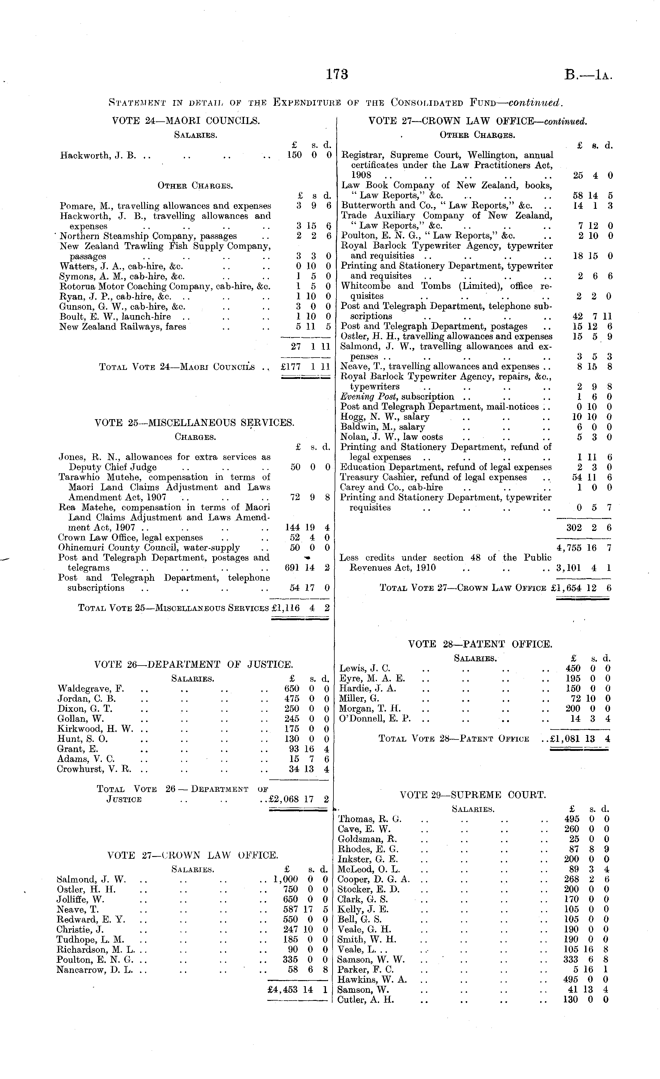 Statement in detail of the Expenditure of the Consolidated Fund — continued. VOTE 24—MAORI COUNCILS. VOTE 27—CROWN LAW OFFlCE— continued. Salaries. . Other Charoes. £ s. d. £ s. d. Hack worth, J. B. .. .. .. .. 150 0 0 Registrar, Supreme Court, Wellington, annual certificates under the Law Practitioners Act, 1908 .. .. .. .. .. 25 4 0 Other Charges. Law Book Company of New Zealand, books, £ sd. " Law Reports," &c. .. .. .. 58 14 5 Pomare, M., travelling allowances and expenses 3 9 6 Butterworth and Co., " Law Reports," &c. .. 14 1 3 Hackworth, J. 8., travelling allowances and Trade Auxiliary Company of New Zealand, expenses .. .. .. . . 315 6 " Law Reports," &c. .. .. .. 712 0 ' Northern Steamship Company, passages .. 2 2 6 Poulton, E. N. G., " Law Reports," &c. .. 210 0 New Zealand Trawling Fish Supply Company, Royal Barlock Typewriter Agency, typewriter passages .. .. . . .. 3 3 0 and requisities .. .. .. .. 18 15 0 Watters, J. A., cab-hire, &c. .. .. 010 0 Printing and Stationery Department, typewriter Symons, A. M., cab-hire, &c. .. .. 15 0 and requisites .. .. .. .. 2 6 6 Rotorua Motor Coaching Company, cab-hire, &c. 15 0 Whitcombe and Tombs (Limited), office reRyan, J. P., cab-hire, &c. .. .. .. 1 10 0 quisites .. . . .. . . 2 2 0 Gunson, G. W., cab-hire, &c. .. . . 3 0 0 Post and Telegraph Department, telephone subBoult, E. W., launch-hire .. .. .. 110 0 scriptions .. .. .. .. 42 711 New Zealand Railways, fares .. .. 511 5 Post and Telegraph Department, postages .. 15 12 6 Ostler, H. H., travelling allowances and expenses 15 5 9 27 1 11 Salmond, J. W., travelling allowances and expenses .. .. .. .. .. 353 Total Vote 24—Maori Councils .. £177 1 11 Neave, T., travelling allowances and expenses .. 815 8 -— Royal Barlock Typewriter Agency, repairs, &c, typewriters .. .. .. .. 2 9 8 Evening Post, subscription .. .. .. 16 0 Post and Telegraph Department, mail-notices .. 0 10 0 wwc ok MT«m?TT AWPnTTQ QT7-RVTPPQ Hogg, N. W., salary .. .. .. 10 10 0 VOTE 25—MISCELLANEOUS SERVICES. Baldwin, M., salary 6 0 0 Charges. Nolan, J. W., law costs .. .. .. 5 3 0 £ s. d. Printing and Stationery Department, refund of Jones, R. N., allowances for extra services as legal expenses .. .. .. .. 1116 Deputy Chief Judge .. .. . . 50 0 0 Education Department, refund of legal expenses 2 3 0 Tarawhio Mutehe, compensation in terms of Treasury Cashier, refund of legal expenses .. 54 11 6 Maori Land Claims Adjustment and Laws Carey and Co., cab-hire .. .. .. 10 0 Amendment Act, 1907 .. .. . . 72 9 8 Printing and Stationery Department, typewriter Rea Matehe, compensation in terms of Maori requisites .. .. .. .. 0 5 7 Land Claims Adjustment and Laws Amendment Act, 1907 .. .. .. 144 19 4 302 2 6 Crown Law Office, legal expenses .. .. 52 4 0 ■ Ohinemuri County Council, water-supply 50 0 0 . 4,755 16 7 Post and Telegraph Department, postages and » Less credits under section 48 of the Public telegrams .. .. .. 691 14 2 Revenues Act, 1910 .. .. .. 3,101 4 1 Post and Telegraph Department, telephone subscriptions .. .. .. .. 54 17 0 Total Vote 27—Crown Law Office £1,654 12 6 Total Vote 25—Miscellaneous Services £1,116 4 2 VOTE 28—PATENT OFFICE. VOTE 26-DEPARTMENT OF JUSTICE. Lewis, J. C. .. SaLABIBS - _ 450 oli Salaries. £ s. d. Eyre, M. A. E. .. .. .. .. 195 0 0 Waldegrave, F. .. .. 650 0 0 Hardie, J. A. .. .. .. 150 0 0 Jordan, C. B. .. .. .. .. 475 0 0 Miller, G. .. .. .. .. 72 10 0 Dixon, G. T. .. .. .. 250 0 0 Morgan, T. H. .. .. .. .. 200 0 0 Gollan, W. .. .. .. 245 0 0 O'Donnell, E. P. .. .. .. .. 14 3 4 Kirkwood, H. W. .. .. . . . . 175 0 0 Hunt, S. 0. .. .. .. 130 0 0 Total Vote 28—Patent Office ..£l,OBl 13 4 Grant, E. .. .. .. .. 93 16 4 — Adams, V. C. .. .. .. .. 15 7 6 Crowhurst, V. R. .. .. .. .. 34 13 4 Total Vote 26 — Department of rnTIRT Justice .. .. ..£2,068 17 2 VOTE 29—SUPREME COURT. — . — -- Salaries. £ s. d. Thomas, R. G. .. .. .. 495 0 0 Cave, E. W. . . .. .. 260 0 0 Goldsman, R, .. .. .. .. 25 0 0 VOTE 27-CROWN LAW OFFICE. £«£ a £ \\ \\ \\ \ \ 200 0 0 Salaries. £ s. d. McLeod, 0. L. . . .. .. .. 89 3 4 Salmond, J. W. .. .. .. .. 1,000 0 0 Cooper, D. G. A. .. .. .. 268 2 6 Ostler, H. H. .. . . .. 750 0 0 Stooker, E. D. . . . . .. 200 0 0 Jolliffe, W. .. .. .. .. 650 0 0 Clark, G. S. .. .. .. 170 0 0 Neave, T. .. . . . . .. 587 17 5 Kelly, J. E. .. . . .. 105 0 0 Redward, E. Y. .. .. .. 550 0 0 Bell, G. S. .. .. .. 105 0 0 Christie, J. .. .. .. .. 247 10 0 Veale, G. H. .. .. . . 190 0 0 Tudhope, L. M. .. .. .. 185 0 0 Smith, W. H. . . . . .. 190 0 0 Richardson, M. L. .. .. .. .. 90 0 0 Veale, L. .. ~ .. . . 105 16 8 Poulton, E. N. G. .. .. . . .. 335 0 0 Samson, W. W. . . .. .. .. 333 6 8 Nancarrow, D. L. .. .. .. .. 58 6 8 Parker, F. C. .. .. .. . . 516 1 — Hawkins, W. A. .. .. .. 495 0 0 £4,453 14 1 Samson, W. .. .. .. .. 41 13 4 Cutler, A. H. .. .. .. 130 0 0